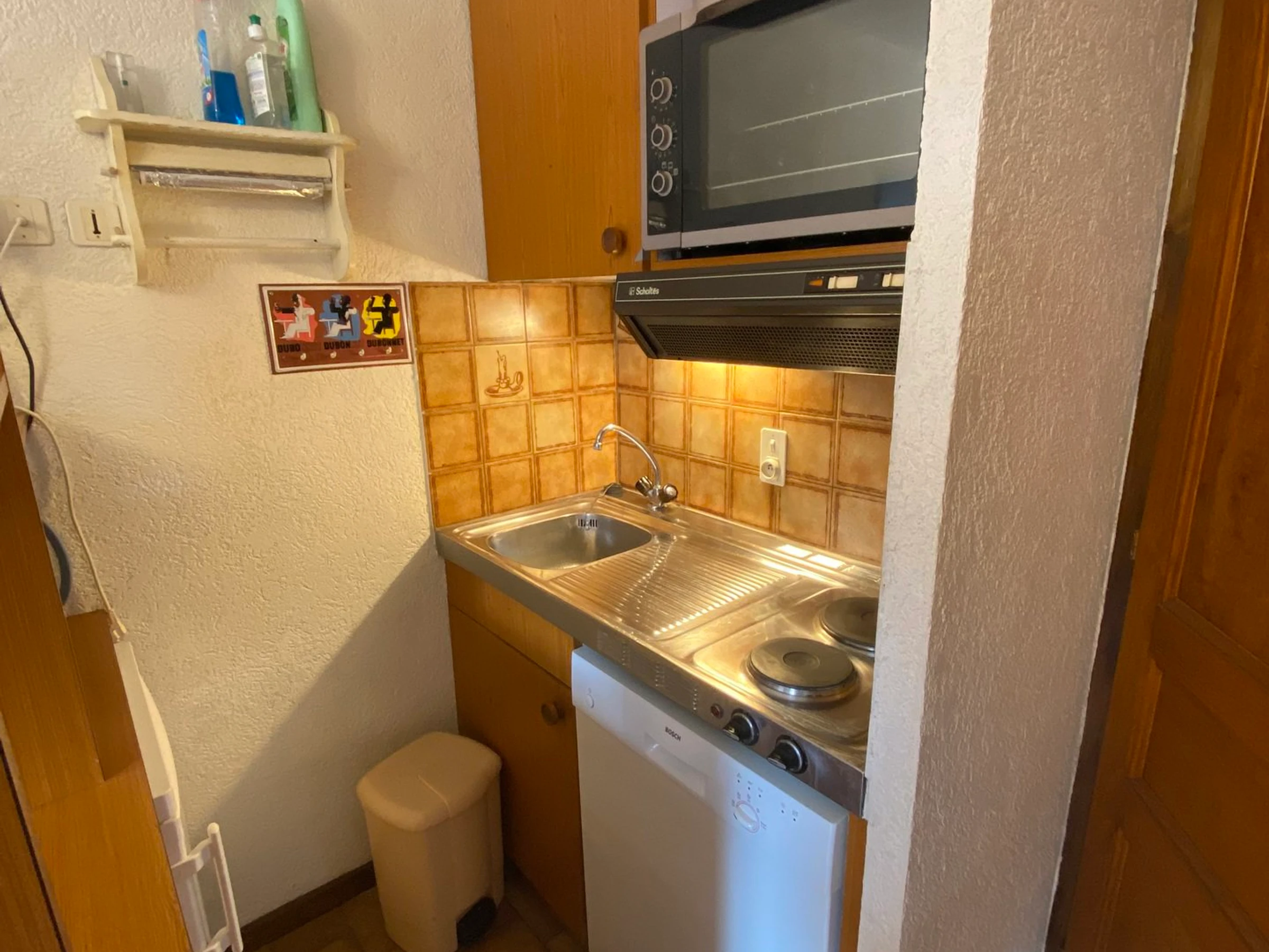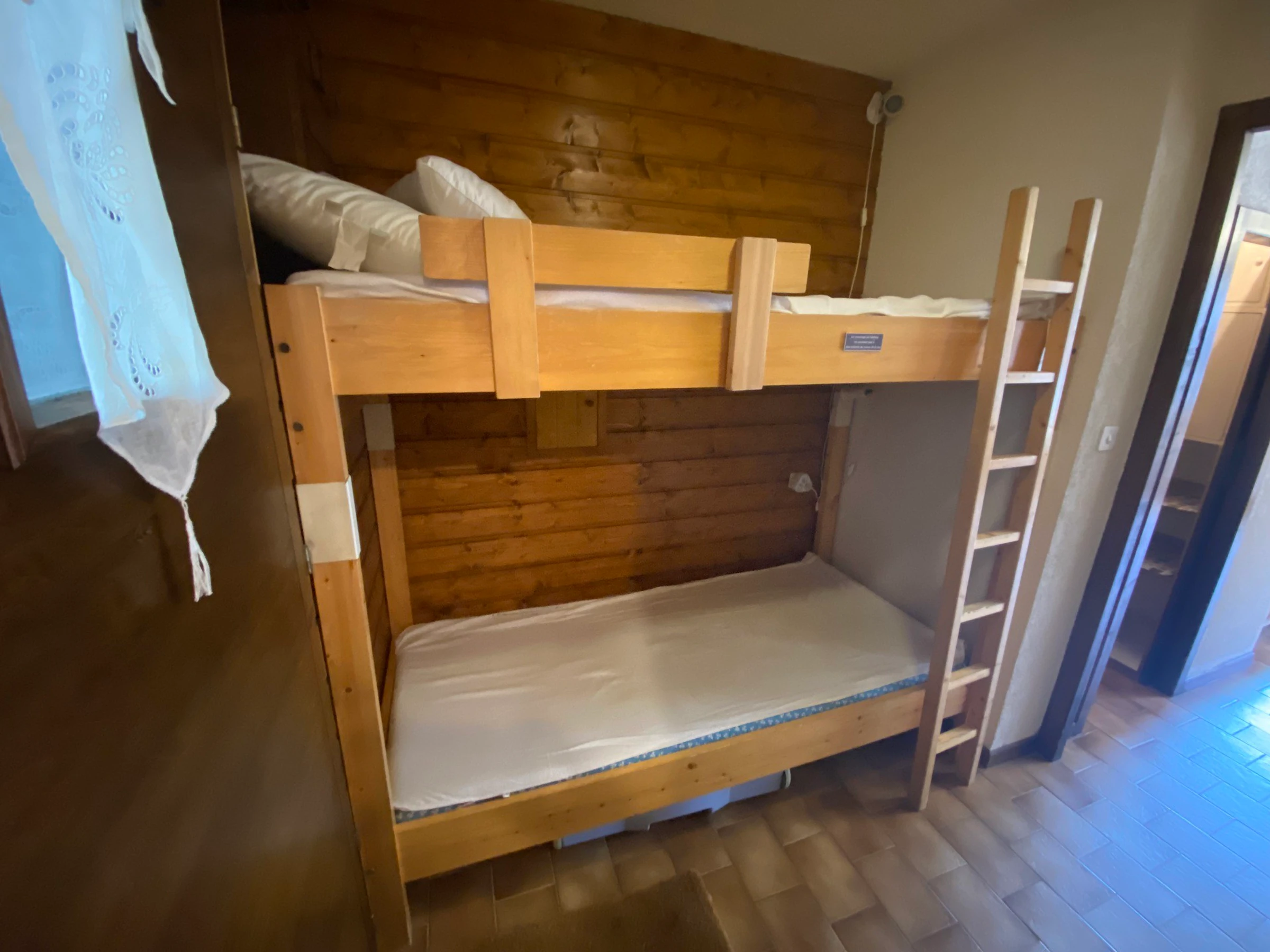 Die Wohnung befindet sich im Erdgeschoss und ist vom Parkplatz über wenige Stufen erreichbar. Sie verfügt über einen Eingangsbereich mit Schlafbereich (Etagenbetten, 90 x 190 cm), ein Badezimmer, ein separates WC, ein Wohnzimmer mit einer ausziehbaren Zweisitzer-Couch (Typ „Clic-Clac“), eine ausgestattete Küchenzeile und einen nach Südwesten ausgerichteten Balkon.