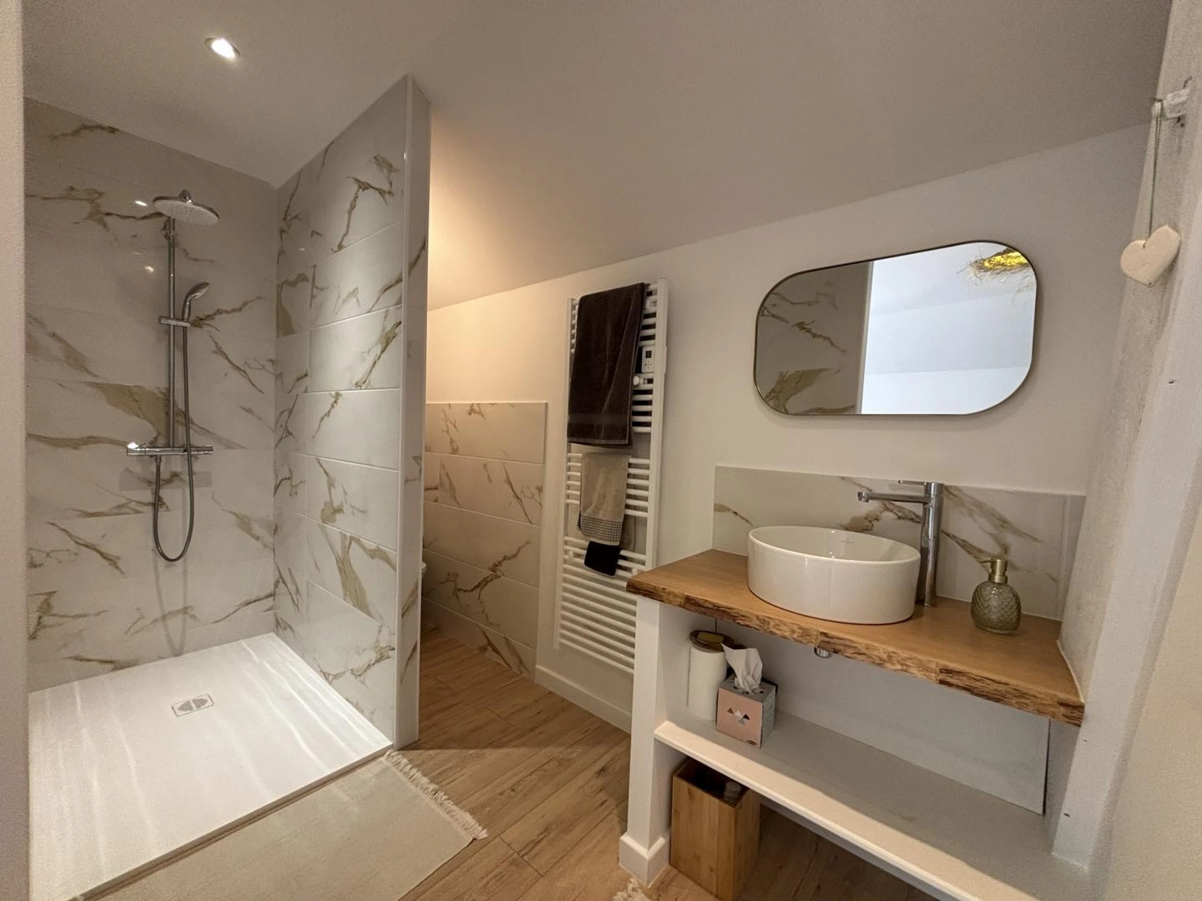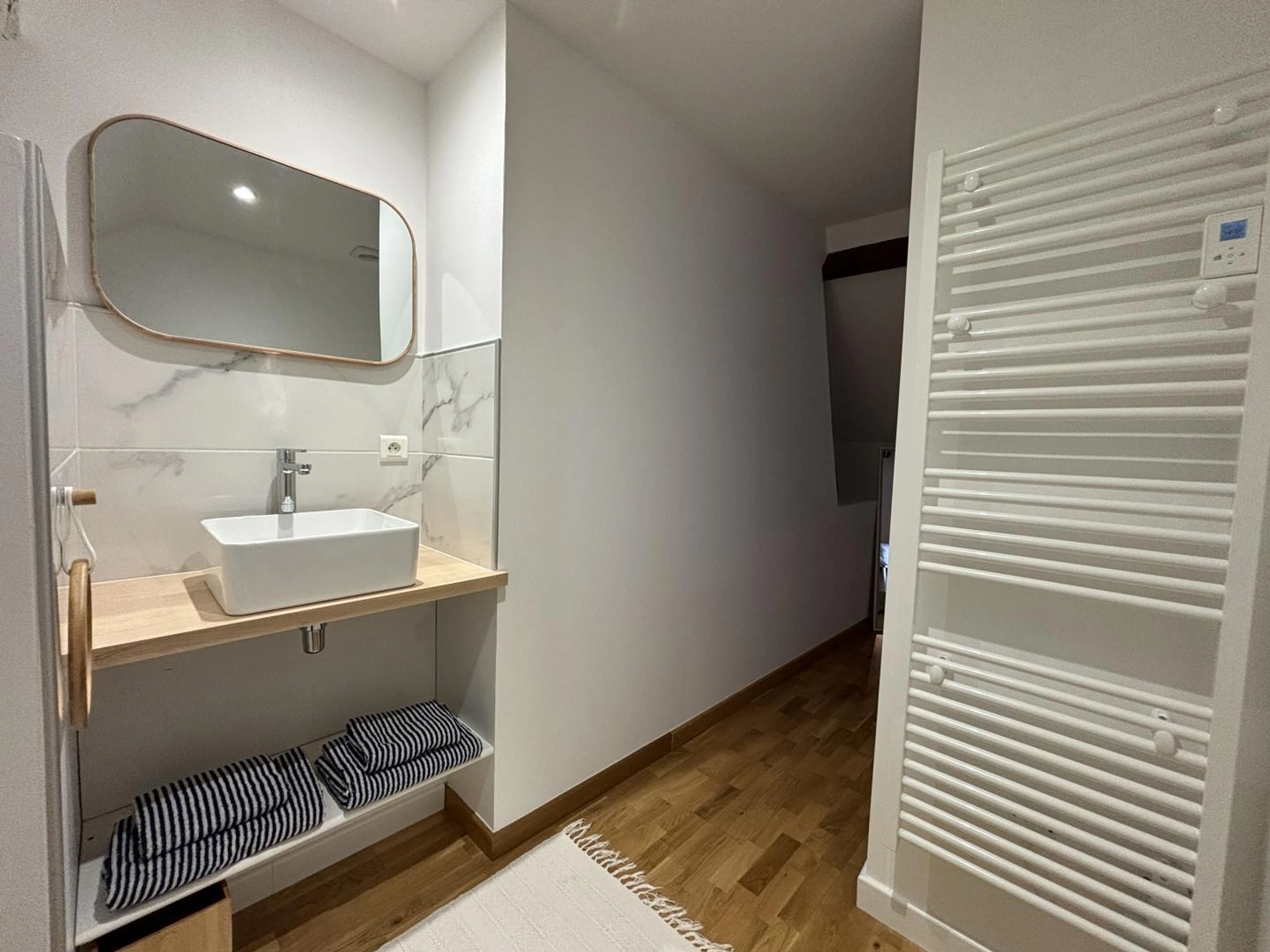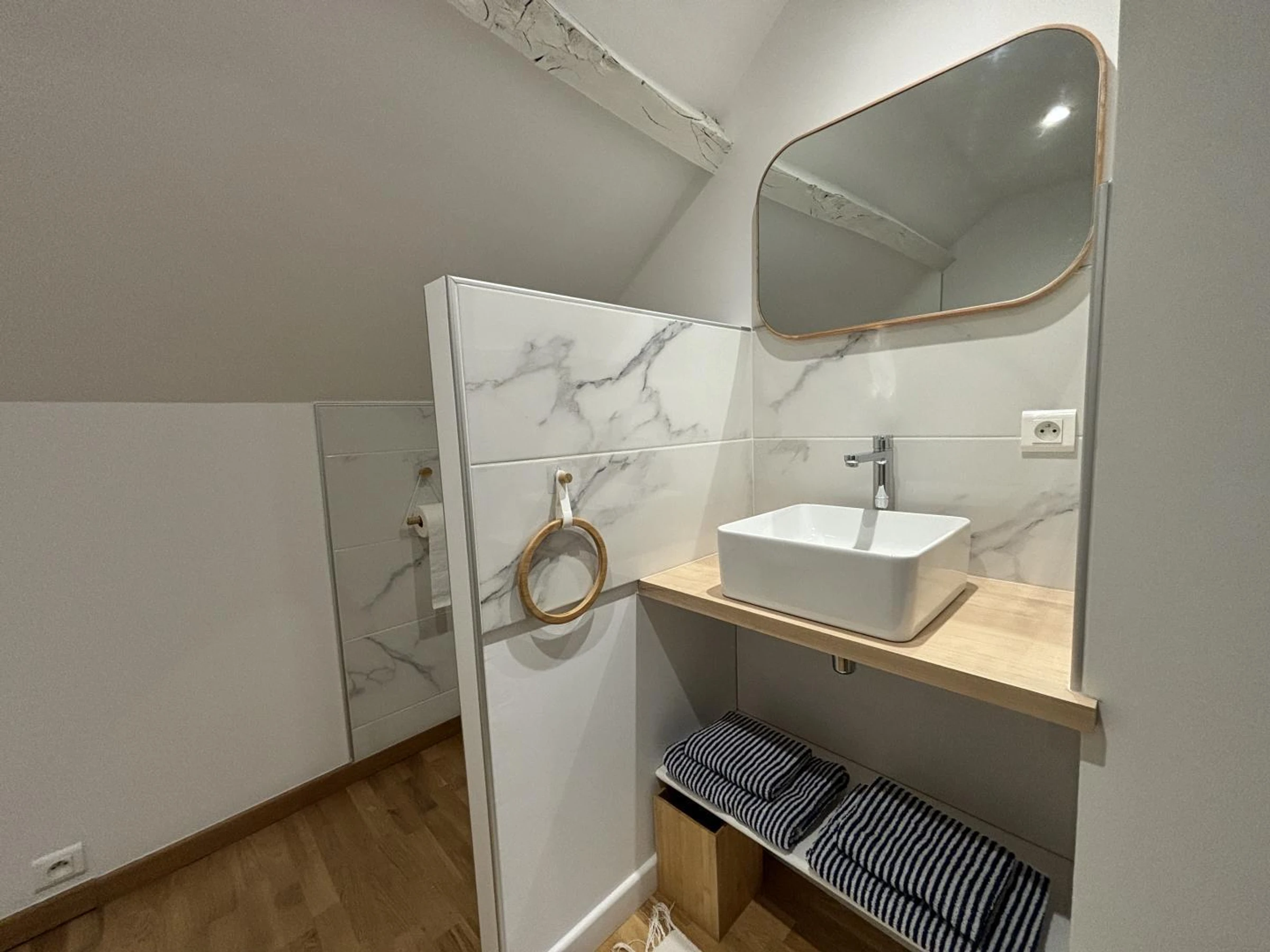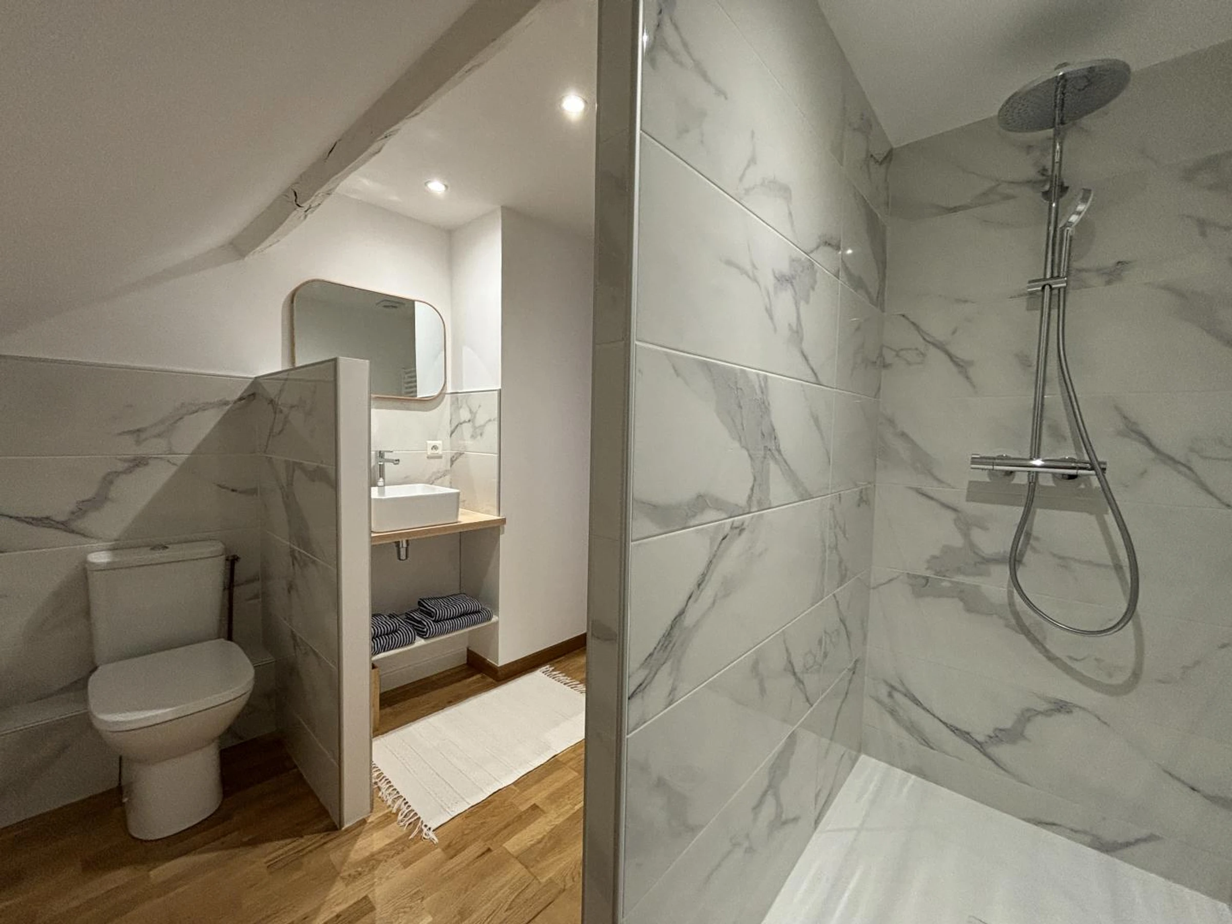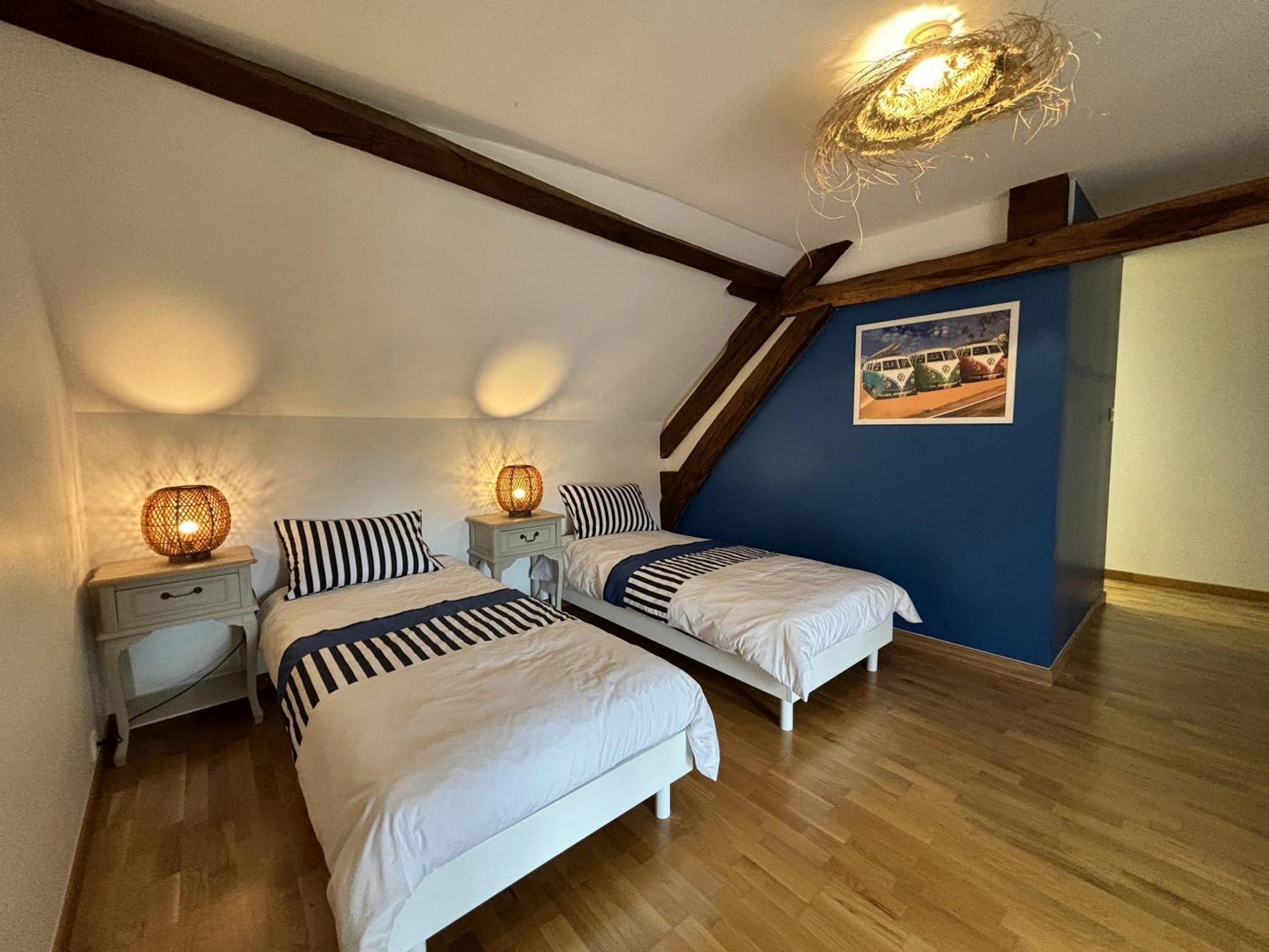 Obergeschoss: 2 Doppelzimmer mit jeweils eigenem Duschbad (Dusche und WC) und ein Arbeitsbereich.