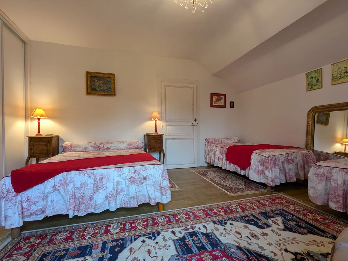 Im Obergeschoss eines charakteristischen Hauses, in einem schattigen Park, der von einem Fluss begrenzt wird, befinden sich 4 Gästezimmer und eine ländliche Gîte: das Zimmer „Rose“ (1 Doppelbett), das Zimmer „Verte“ (1 Doppelbett), das Zimmer „Bleue“ (2 120 cm breite Betten) und das Zimmer „Rouge“ (1 Doppelbett und 2 Einzelbetten) mit kompletten Badezimmern.