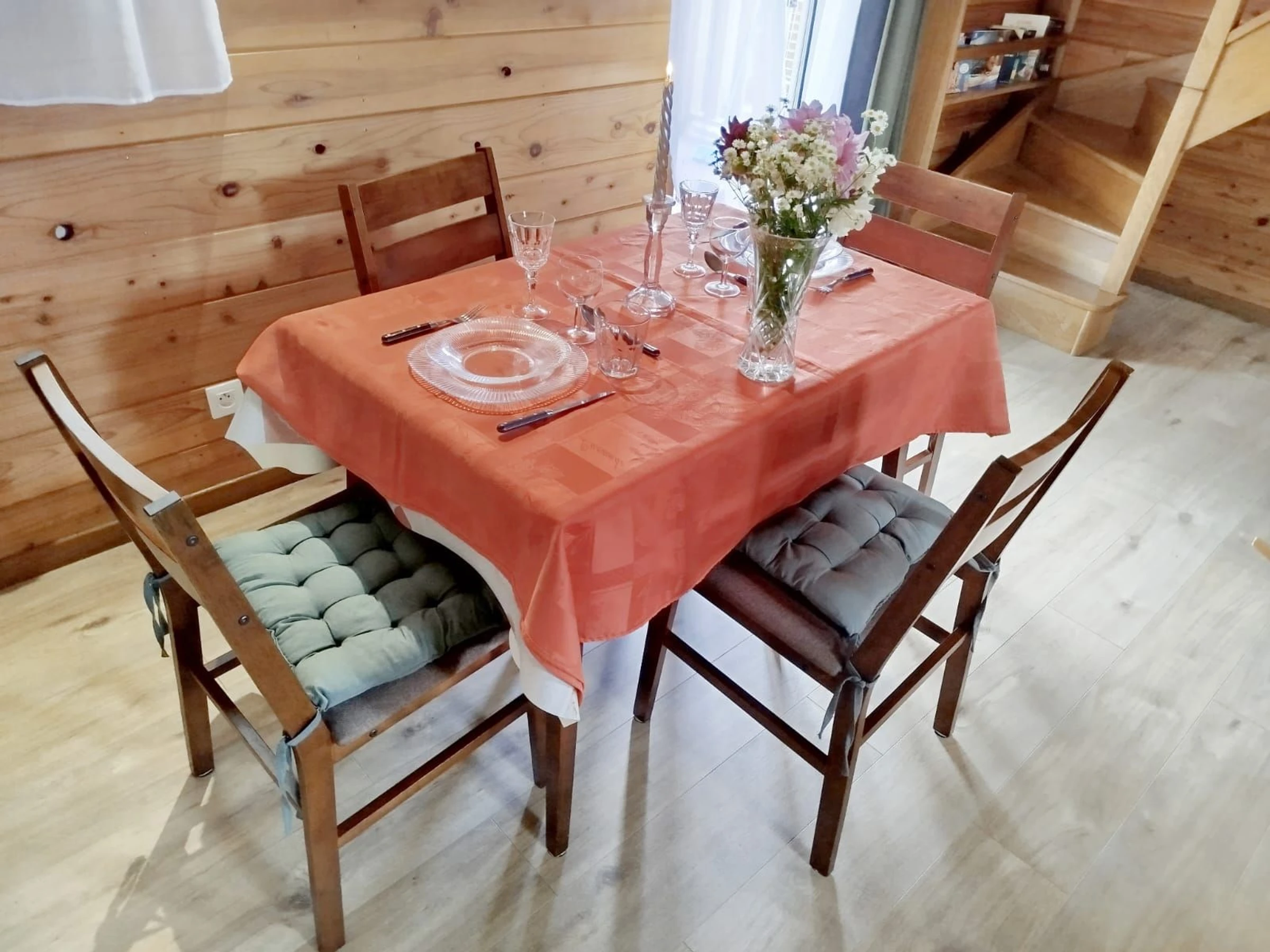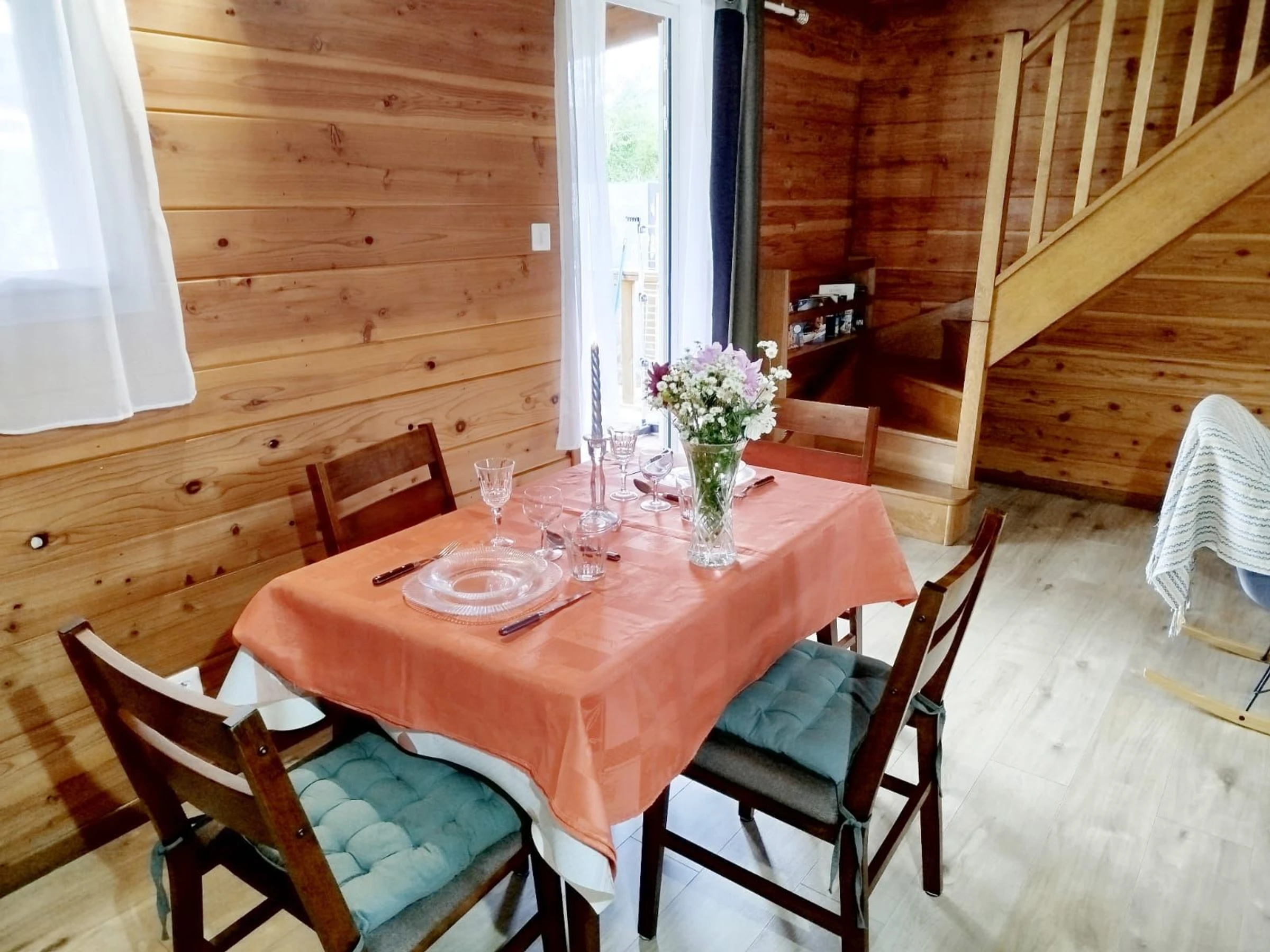 Im Obergeschoss befindet sich ein geräumiger Schlafbereich mit einem Doppelbett (140 x 200 cm) und ein Badezimmer mit WC.