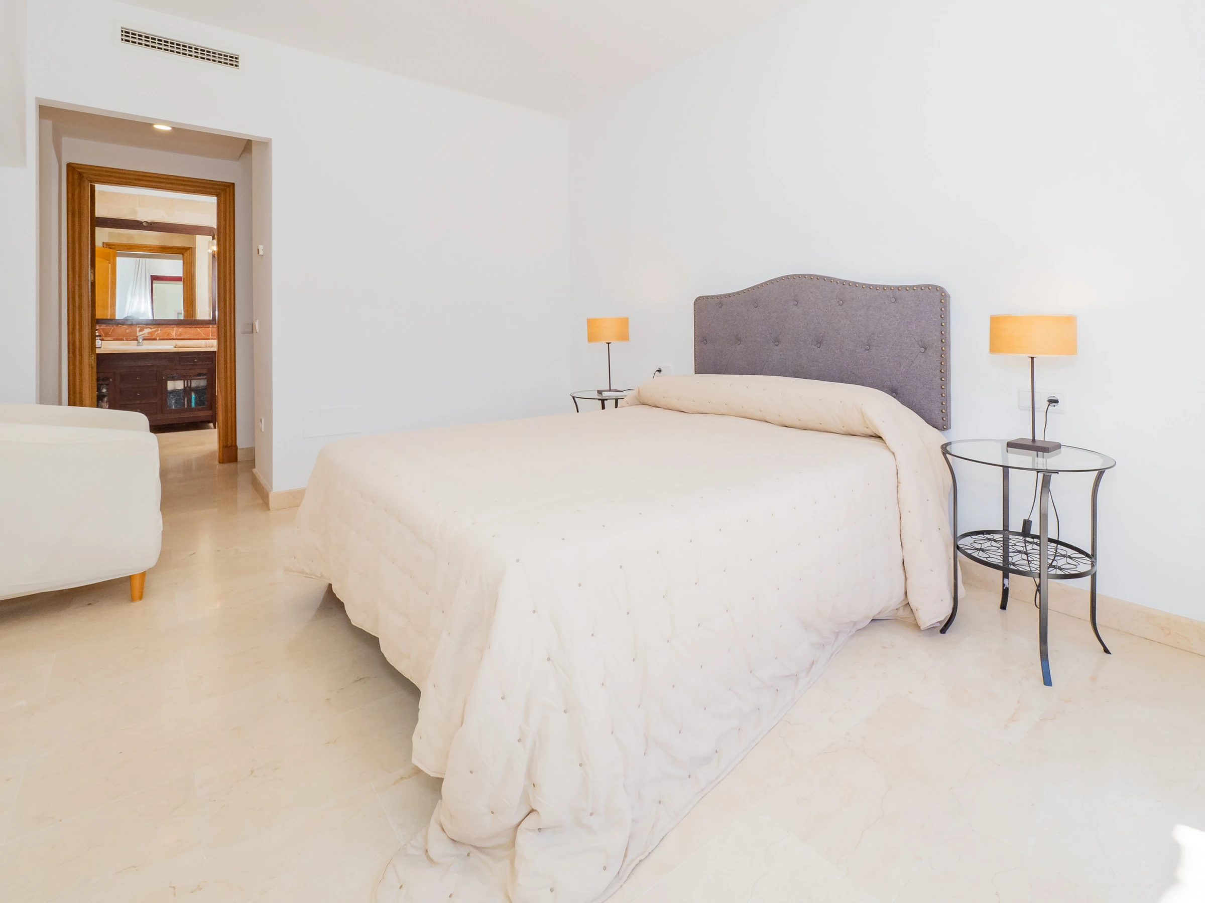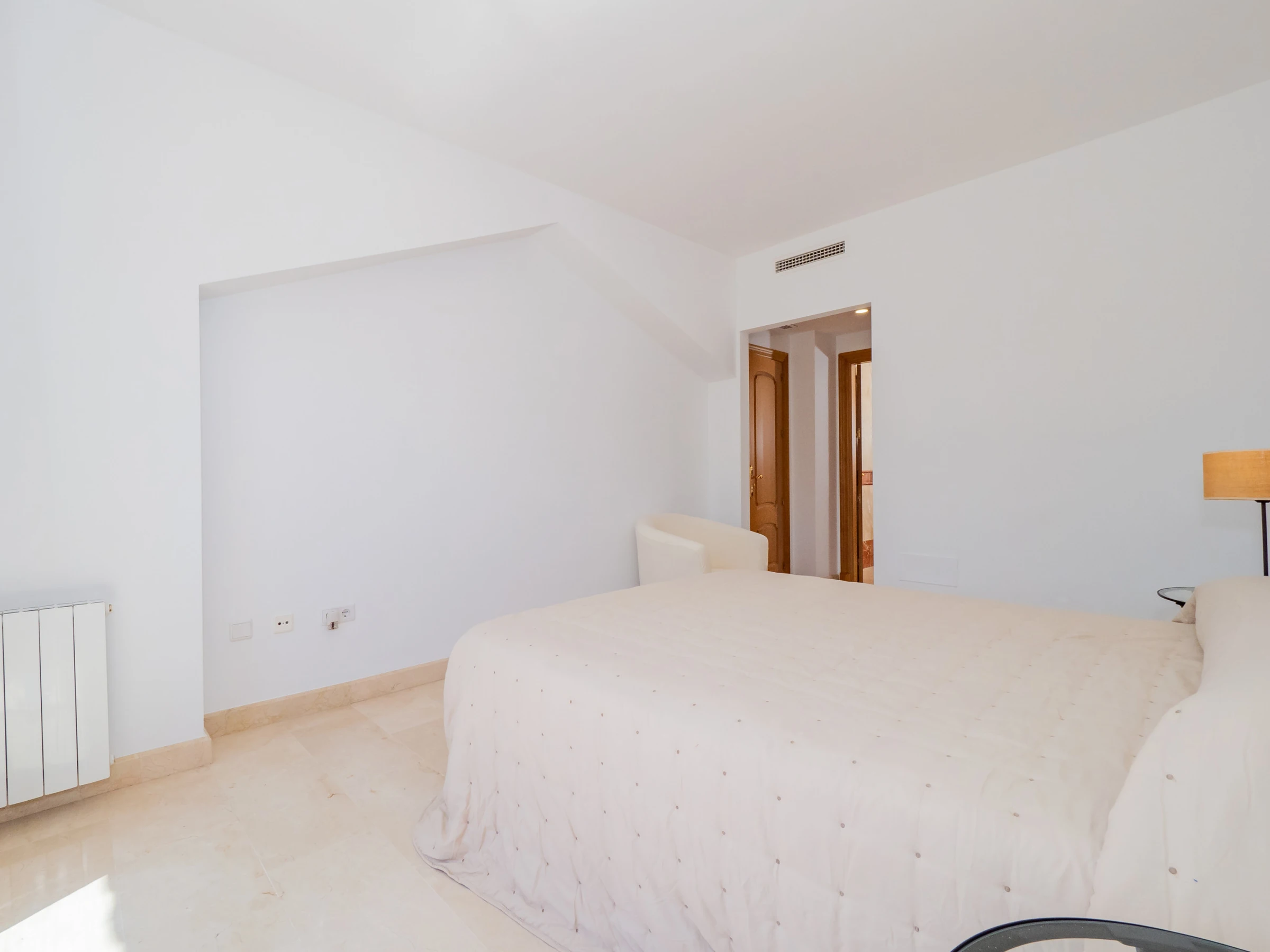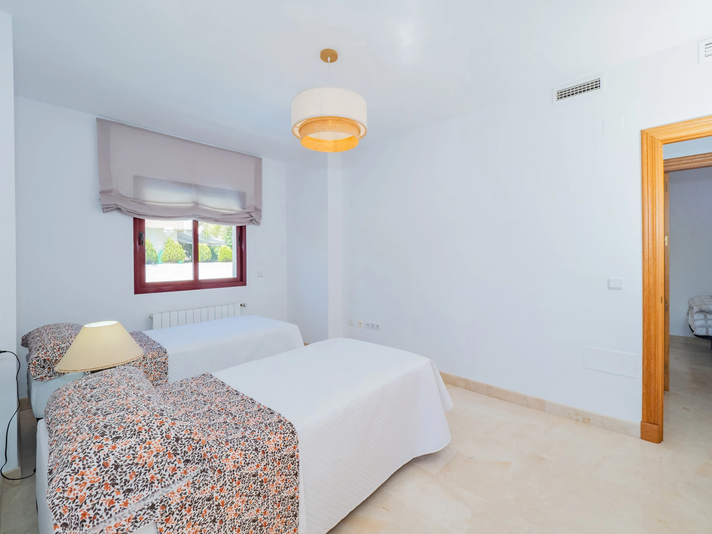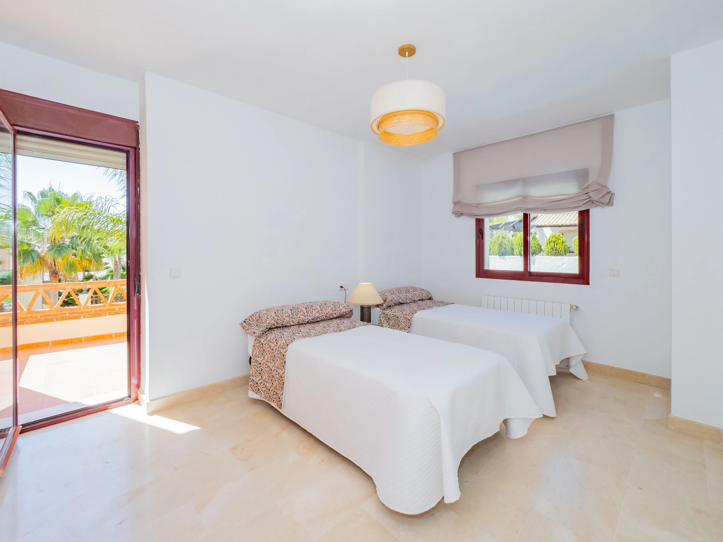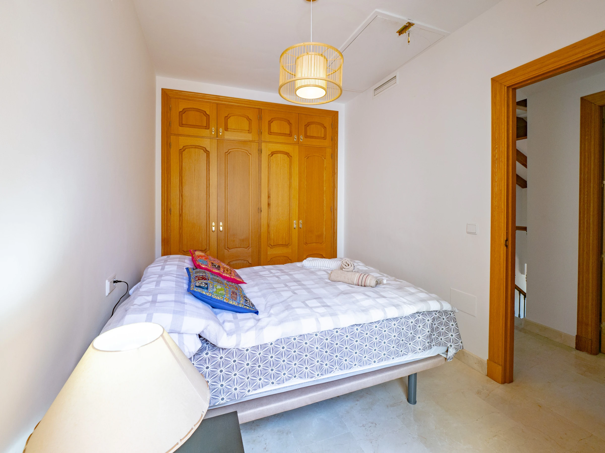 Beim Hinaufsteigen der Treppe wirst du drei Schlafzimmer entdecken, alle mit Zugang zu einer privaten Terrasse und geräumigen Schränken. Eines davon enthält ein Doppelbett und ein eigenes Badezimmer; das zweite hat zwei Einzelbetten und das dritte ein Doppelbett. Die zentrale Klimaanlage deckt auch diese Etage ab, um deine Erholung zu jeder Jahreszeit zu gewährleisten.