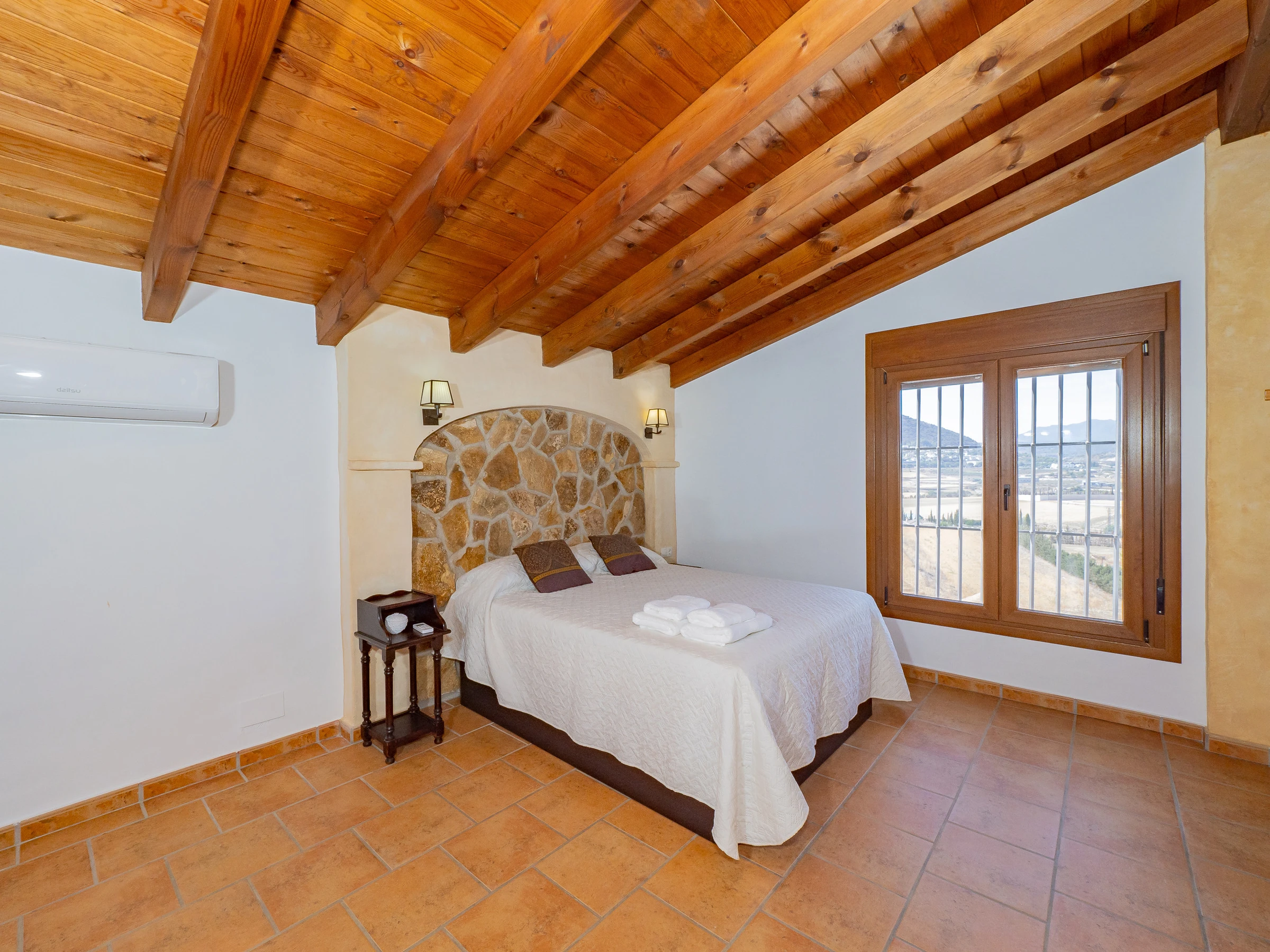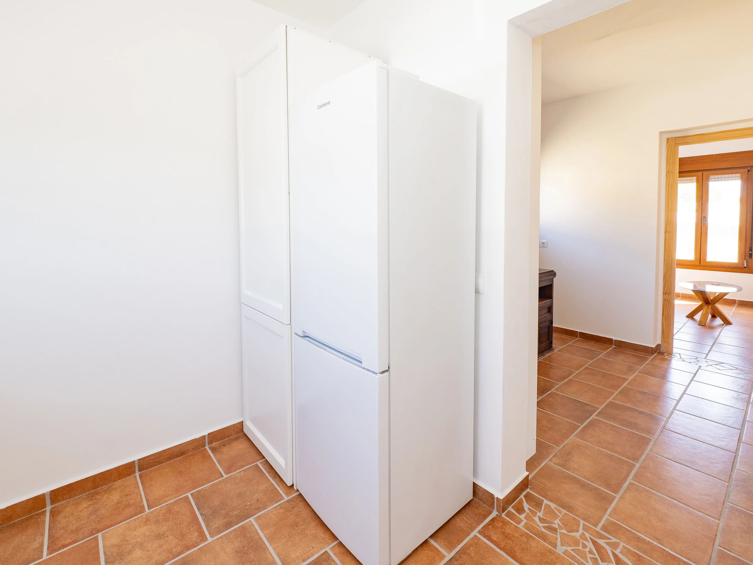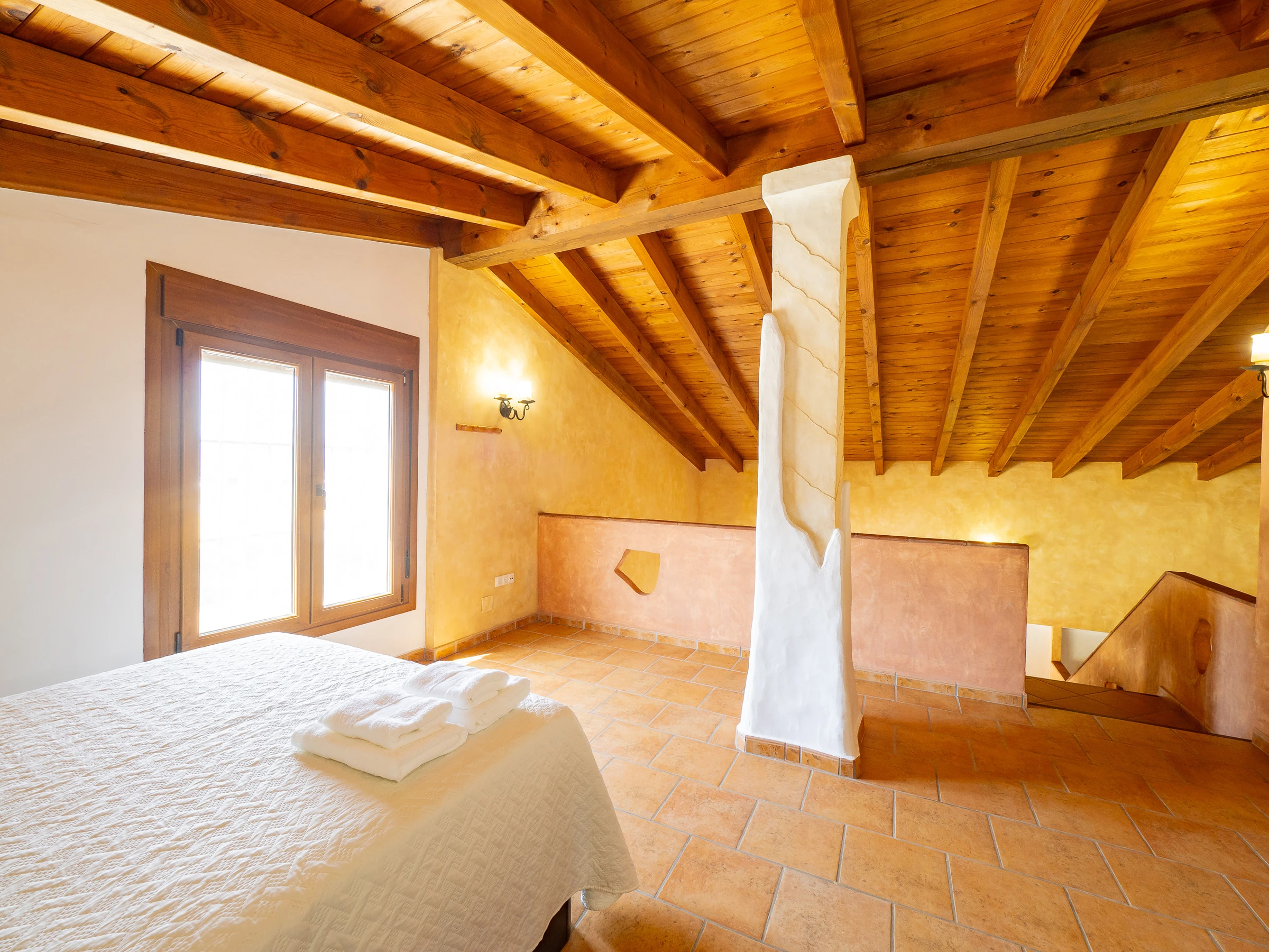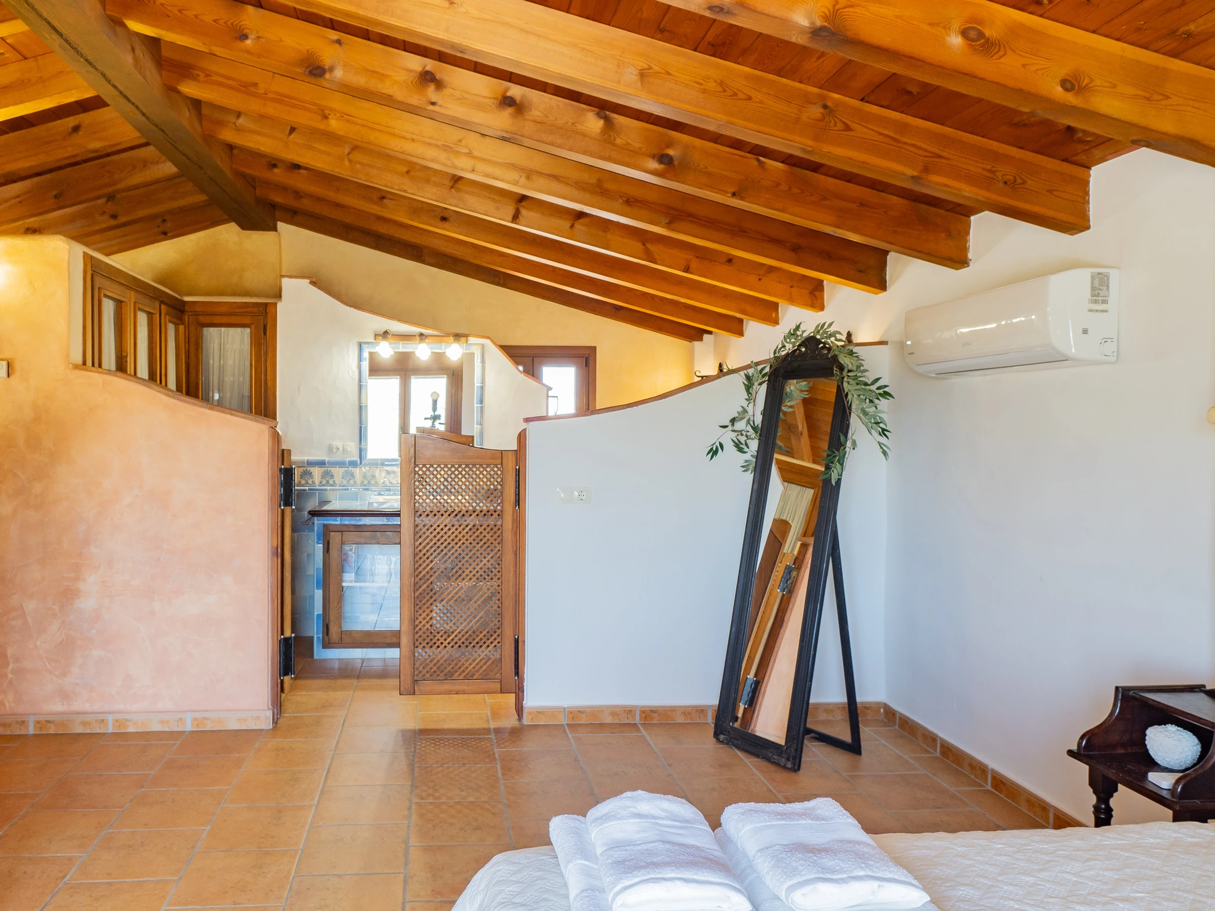 Beim Hinaufsteigen in das obere Stockwerk wirst du ein geräumiges und offenes Schlafzimmer entdecken, ohne Türen, mit einem Doppelbett und einem Badezimmer en suite mit Duschplatte. Dieser Raum behält eine visuelle Verbindung zum Rest des Hauses durch die Treppe, was einen Hauch von Weite und Design verleiht.