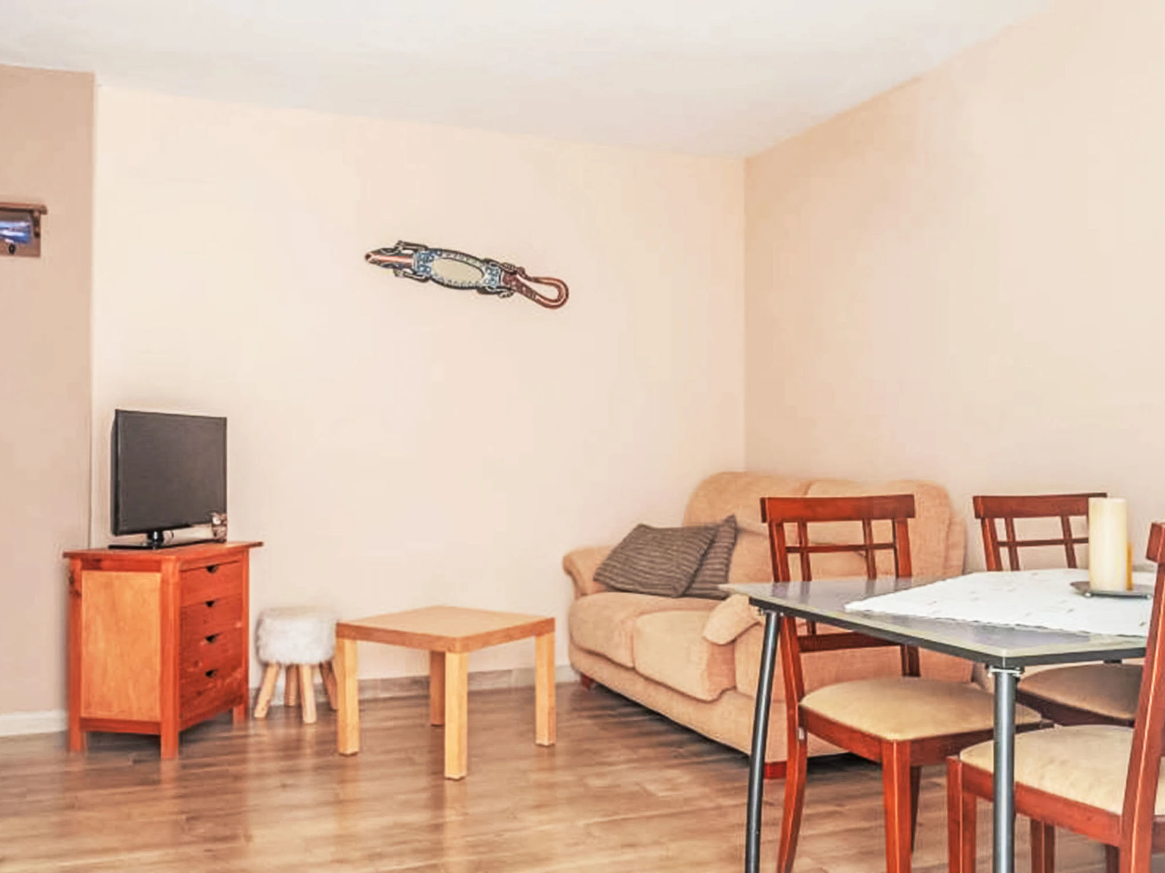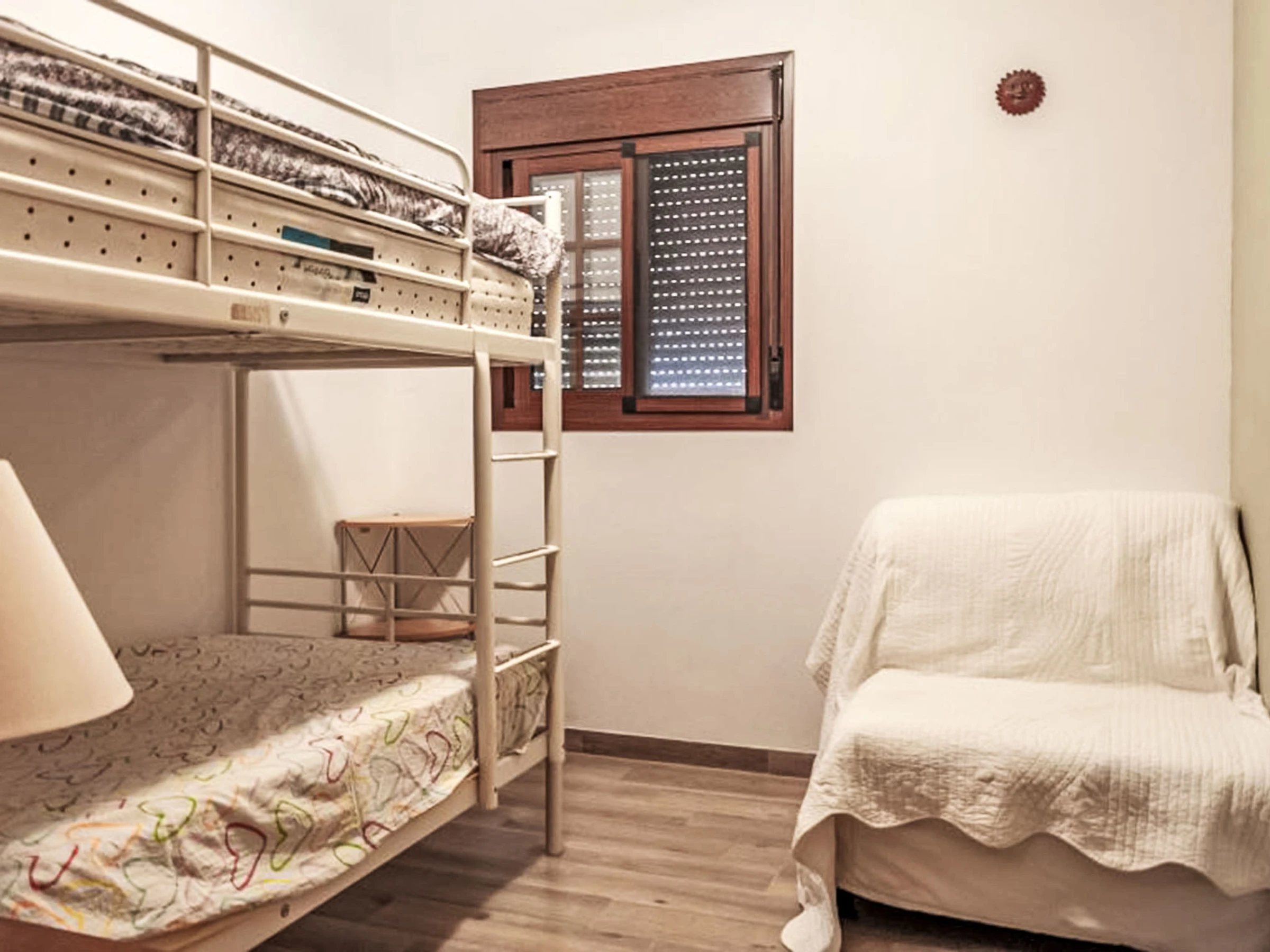 "Buho - Nido Aguila Blanca", 3-Zimmer-Wohnung 60 m2, im Erdgeschoss. Objekt geeignet für 2 Erwachsene + 3 Kinder. Zweckmässig und komfortabel eingerichtet: Wohn-/Esszimmer mit Esstisch und Klimaanlage. Ausgang zum Garten, zur Terrasse. 1 Zimmer mit 1 franz. Bett (180 cm, Länge 200 cm), Klimaanlage mit 1 x 2 Etagenbetten (90 cm, Länge 190 cm). Offene Küche (Backofen, 4 Glaskeramikplatten, Toaster, Wasserkocher, Mikrowelle, Tiefkühler, elektrische Kaffeemaschine). Dusche/WC. Terrasse. Terrassenmöbel. Zur Verfügung: Bügeleisen, Kinderhochstuhl, Babybett bis 2 Jahre, Haartrockner. Internet (WLAN, gratis). Geeignet für Familien. [hidden] // Reg. Nr.: ESHFTU00002900500042546900300000000000000[hidden]7