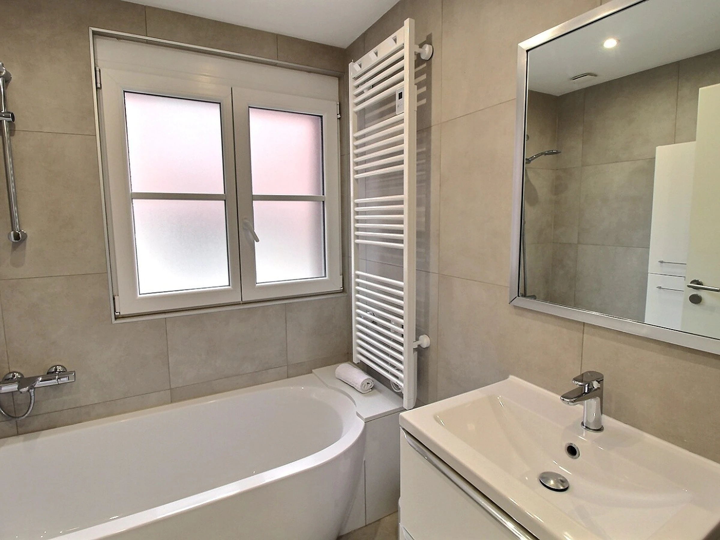 Ebenfalls im zweiten Stock befindet sich ein Badezimmer mit Badewanne, Doppelwaschbecken und separatem WC. Für zusätzlichen Komfort sorgt eine Waschküche.