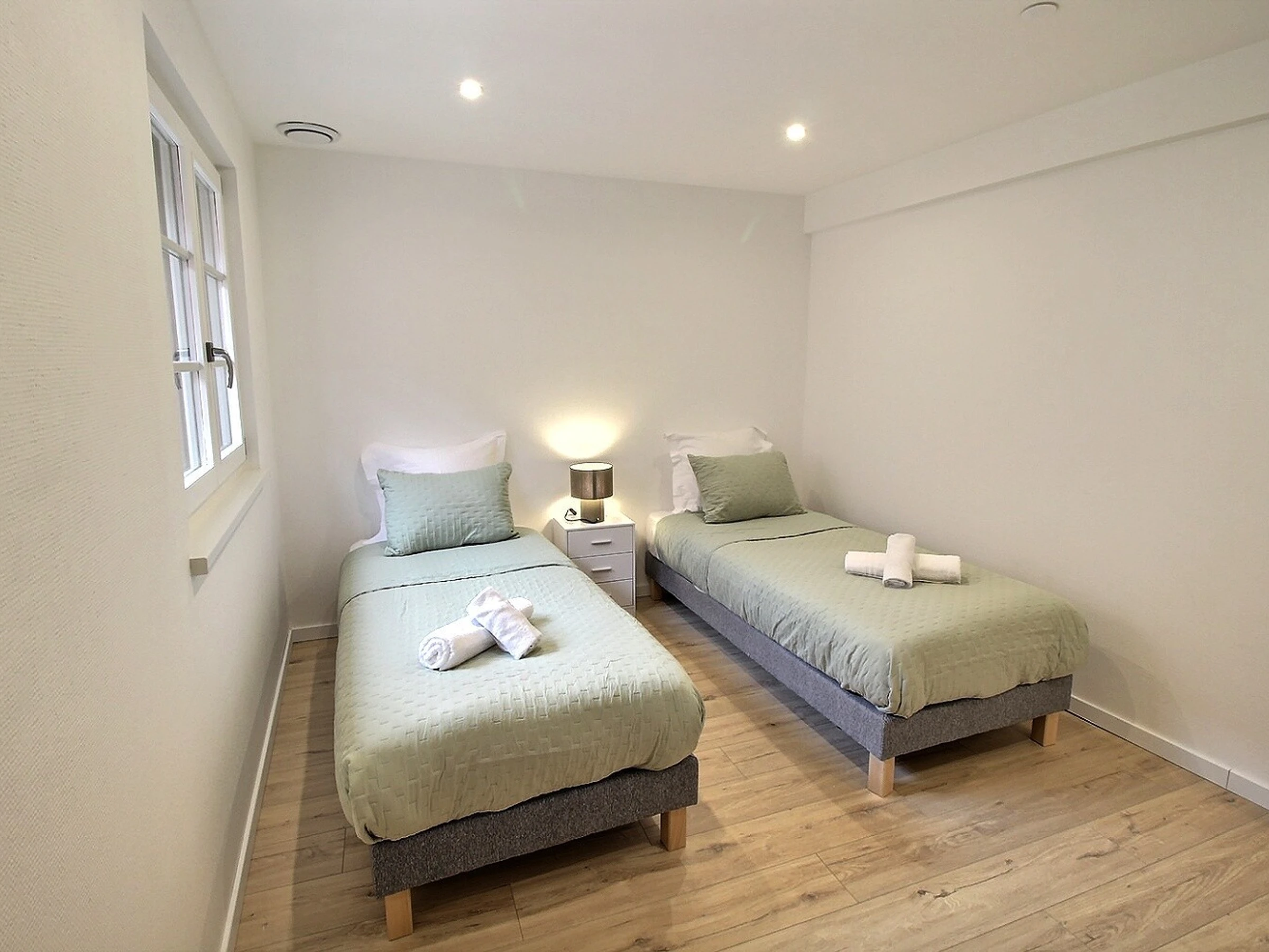 Im zweiten Stock der Wohnung befinden sich zwei komfortable Schlafzimmer. Das erste verfügt über zwei Einzelbetten (90 x 200 cm) und praktischen Stauraum. Das zweite, eine Mastersuite, bietet ein Doppelbett (160 x 200 cm), ein geräumiges Ankleidezimmer und ein eigenes Bad mit WC.