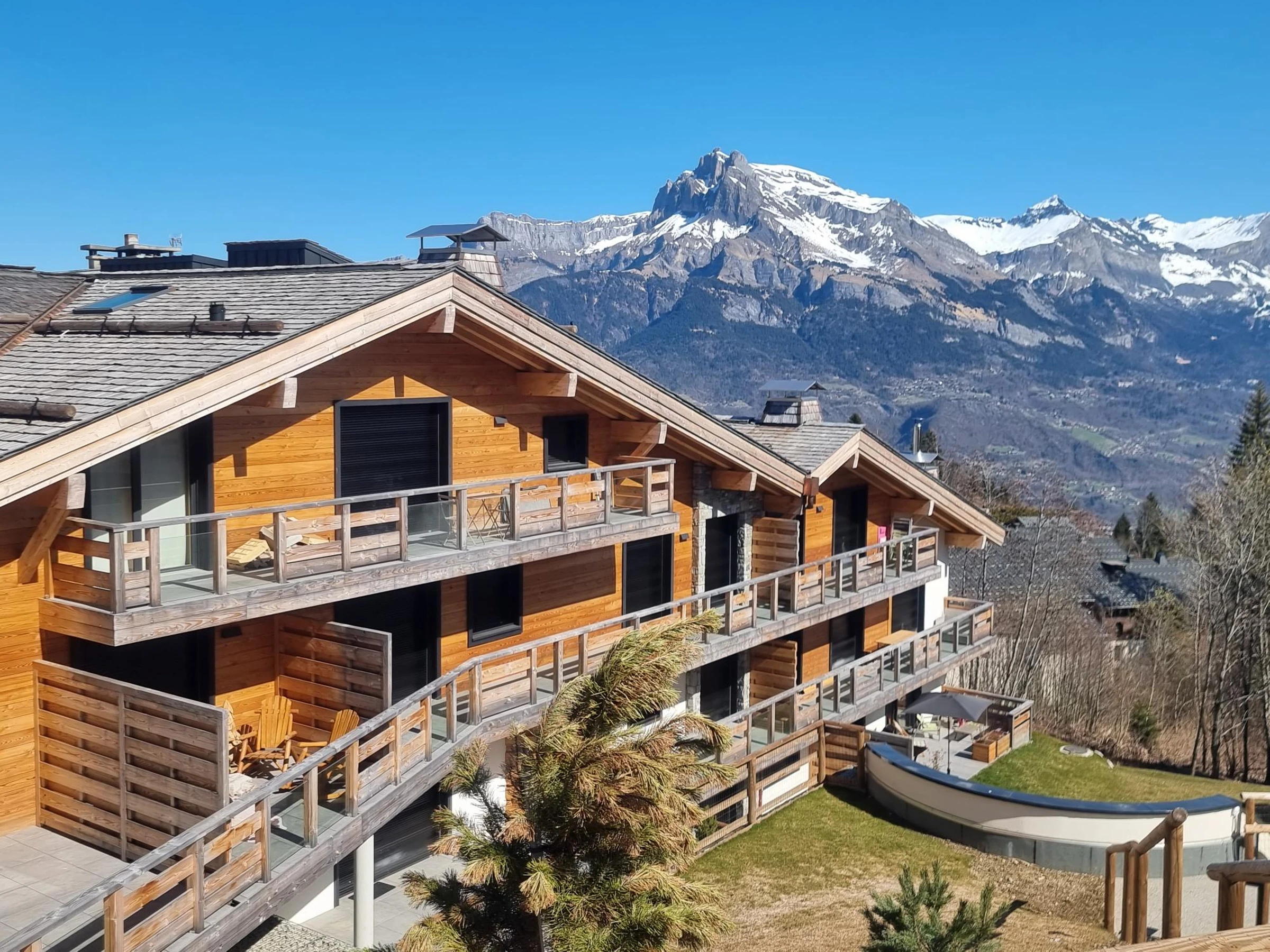 Ein schönes und helles Wohnzimmer mit voll ausgestatteter offener Küche, Wohnzimmer, Lounge mit TV, Zugang zu einer Balkonterrasse mit Blick auf das Mont-Blanc-Massiv, mit Gartentisch, 4 Stühlen und 2 Liegestühlen