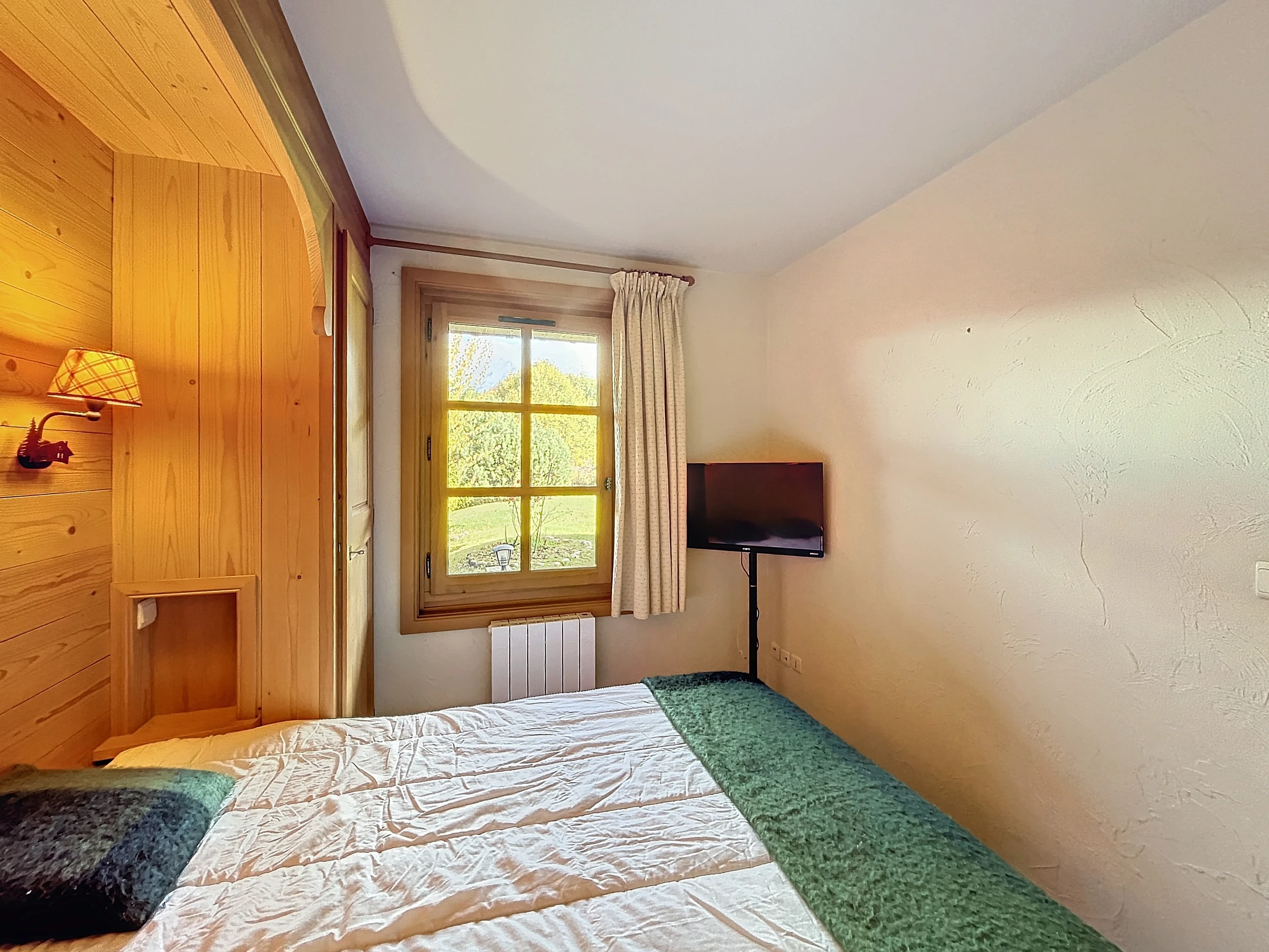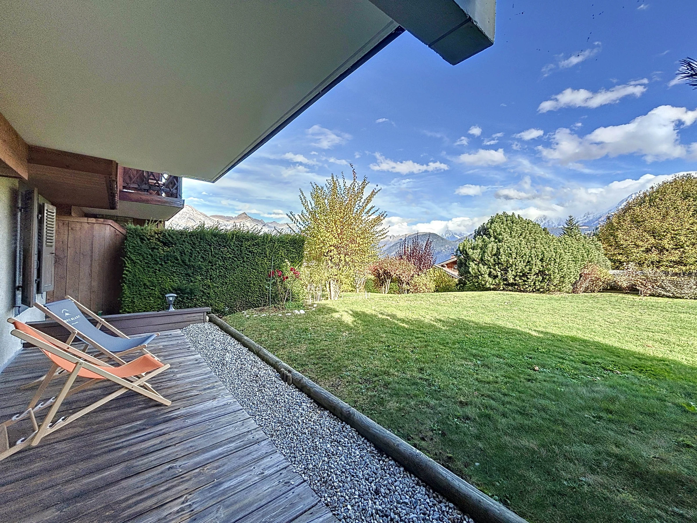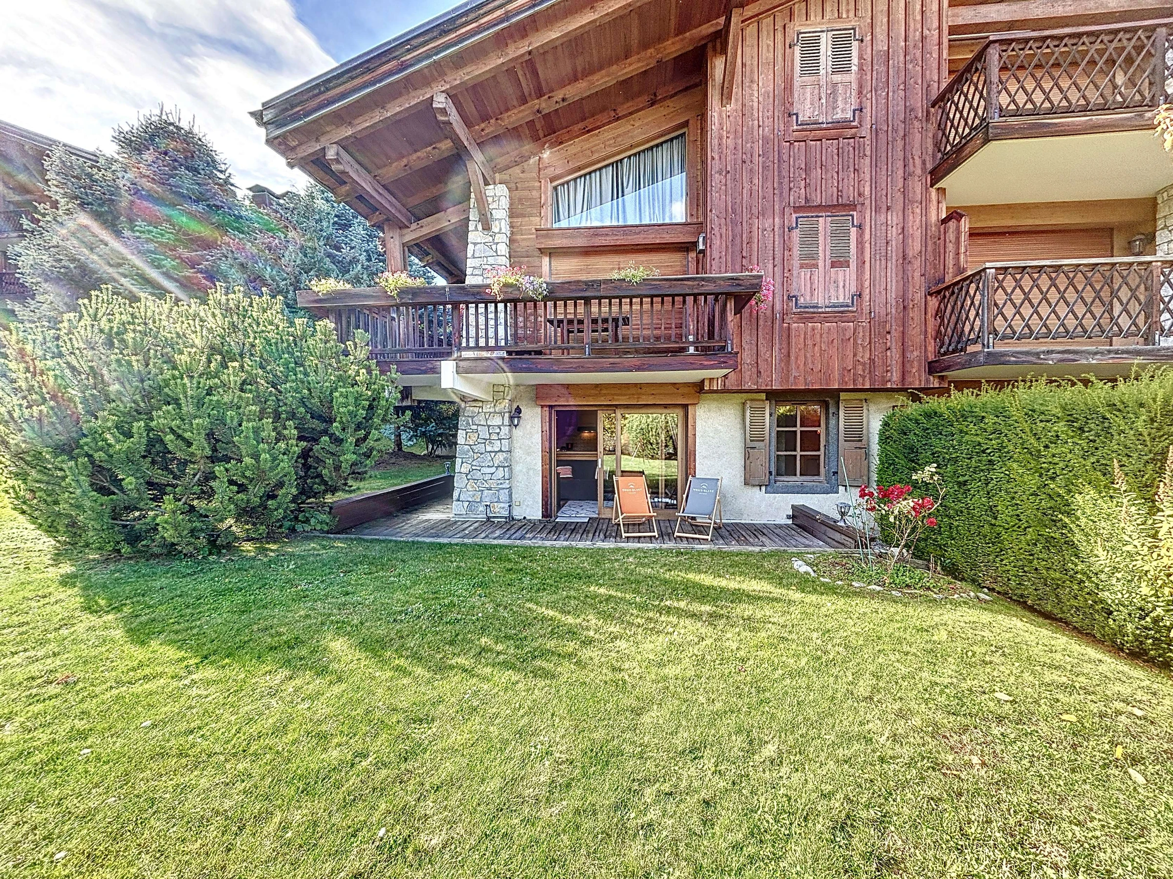Auf der Gartenebene einer kleinen Residenz, 2-Zimmer-Wohnung + Hütte mit einer Fläche von ca. 45 m, besteht es aus: einem Eingang, einer separaten Toilette, einem Badezimmer mit Waschmaschine, einem Kinderzimmer mit zwei Etagenbetten (2x90) Schrank, ein Schlafzimmer mit einem Doppelbett (160) mit Schrank und TV, ein Wohnzimmer-Essbereich, eine offene ausgestattete Küche (Backofen, Geschirrspüler, Kaffeemaschine, Toaster, Kühlschrank, Wasserkocher), alle mit Zugang zu einer schönen Eckterrasse mit Garten mit Blick auf den Mont Blanc. Ein Skiraum, ein Parkplatz im Keller.