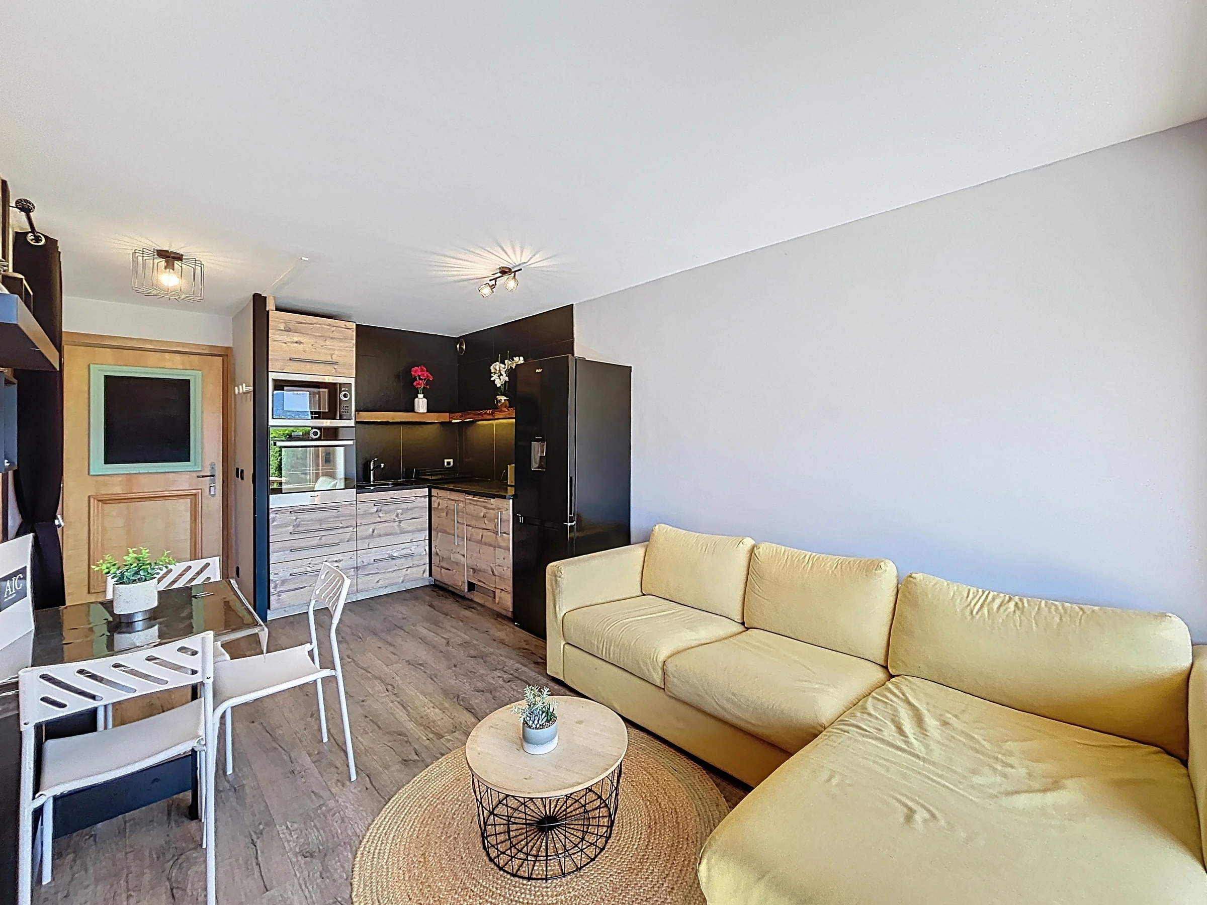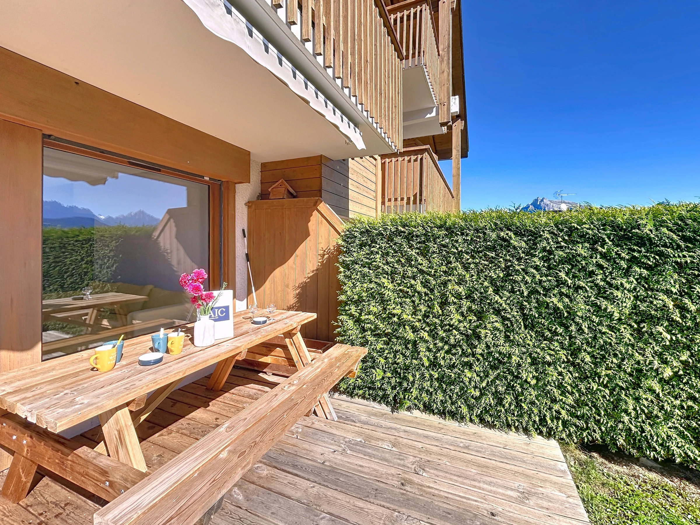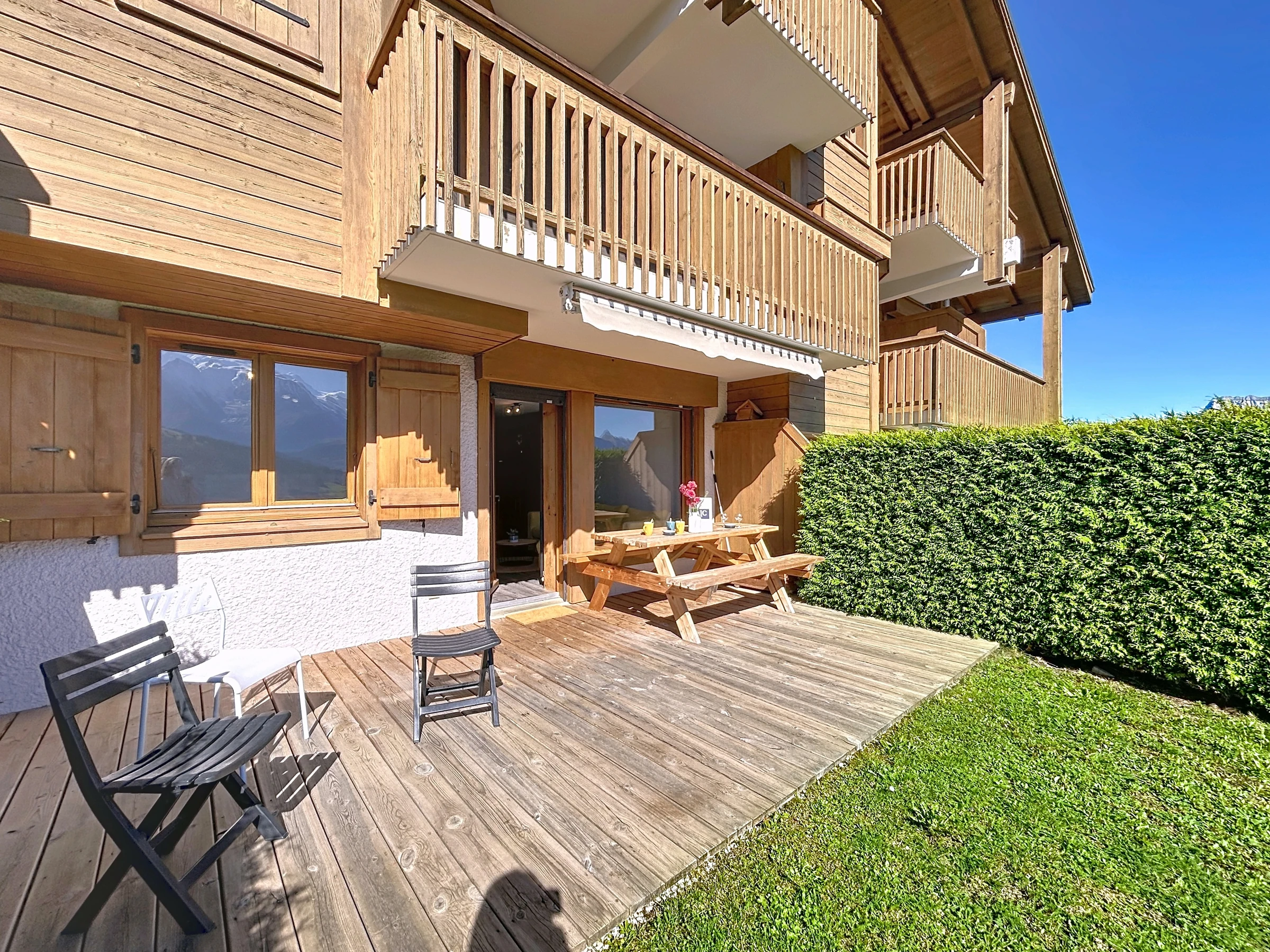 Diese ca. 35 m² große Erdgeschosswohnung befindet sich in einer luxuriösen Residenz in der Nähe des Skigebiets Portes du Mont Blanc. Sie besteht aus einem Eingangsbereich, einem Kleiderschrank, einem Wohnzimmer mit offener, ausgestatteter Küche, einem Wohnzimmer mit Zugang zu einer schönen Südostterrasse, einem Schlafzimmer mit einem Doppelbett (140 x 190), einer Schlafnische mit zwei Etagenbetten (90 x 190), einem separaten WC und einem Duschbad. Zur weiteren Ausstattung gehören ein Skischrank und ein für die Residenz reservierter Außenparkplatz.