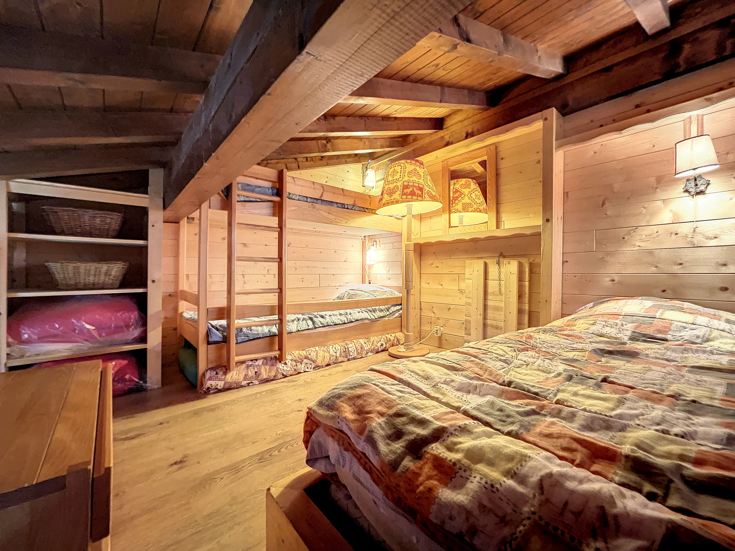 Ein Eingang, Toilette, Badezimmer mit Waschmaschine (3 kg), ein Schlafzimmer mit 1 Doppelbett (140), ein Wohnzimmer mit Einbauküche: Backofen, 2 Kühlschrankplatten und Geschirrspüler und Mikrowelle, Balkon. Über eine Treppe (sehr steil) Dachgeschoss mit 2 Einzelbetten + 2 Etagenbetten (für kleine Kinder). Skiraum.