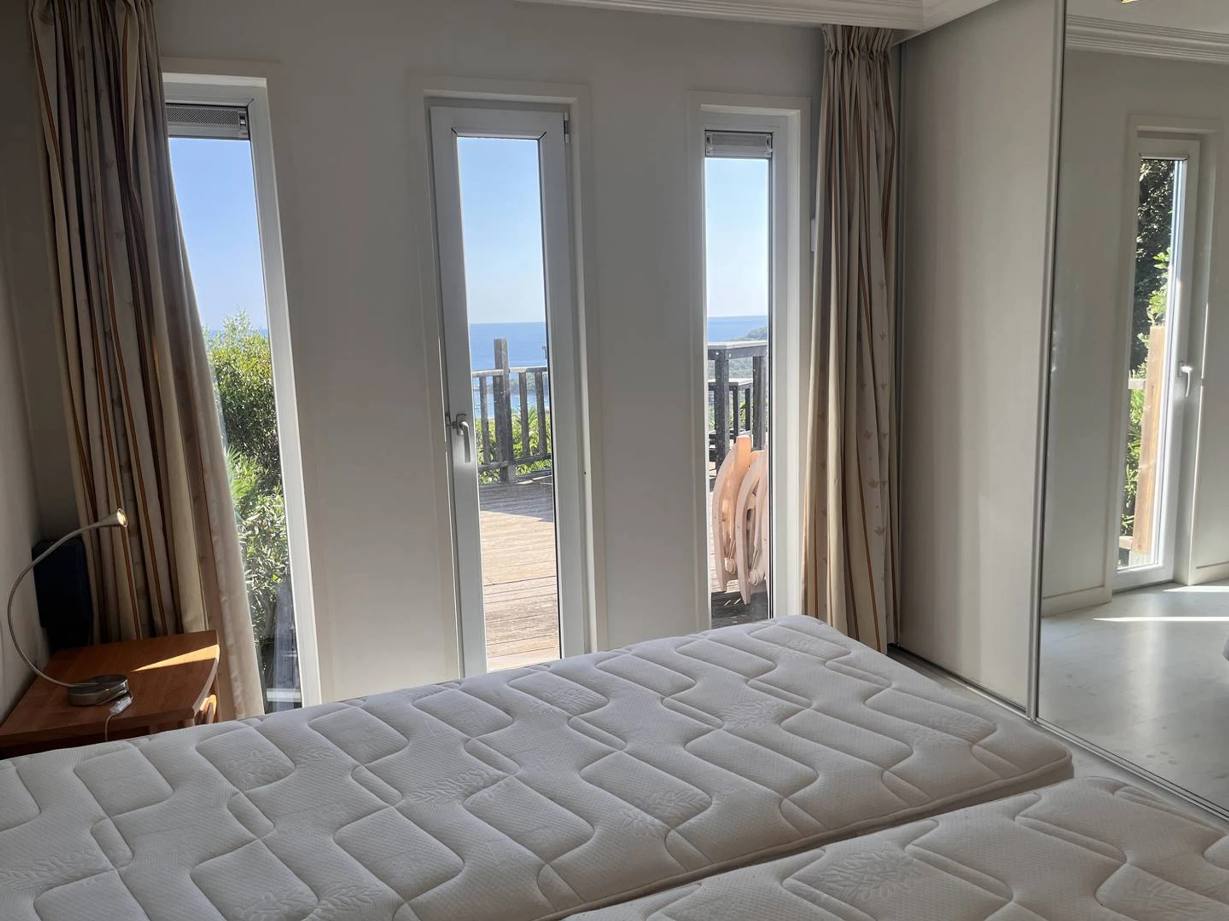 Glasfenster, das auf eine große möblierte Terrasse mit atemberaubendem Blick auf die Bucht führt: Gartenmöbel aus Teakholz, Liegestuhl, Sonnenschirm ...