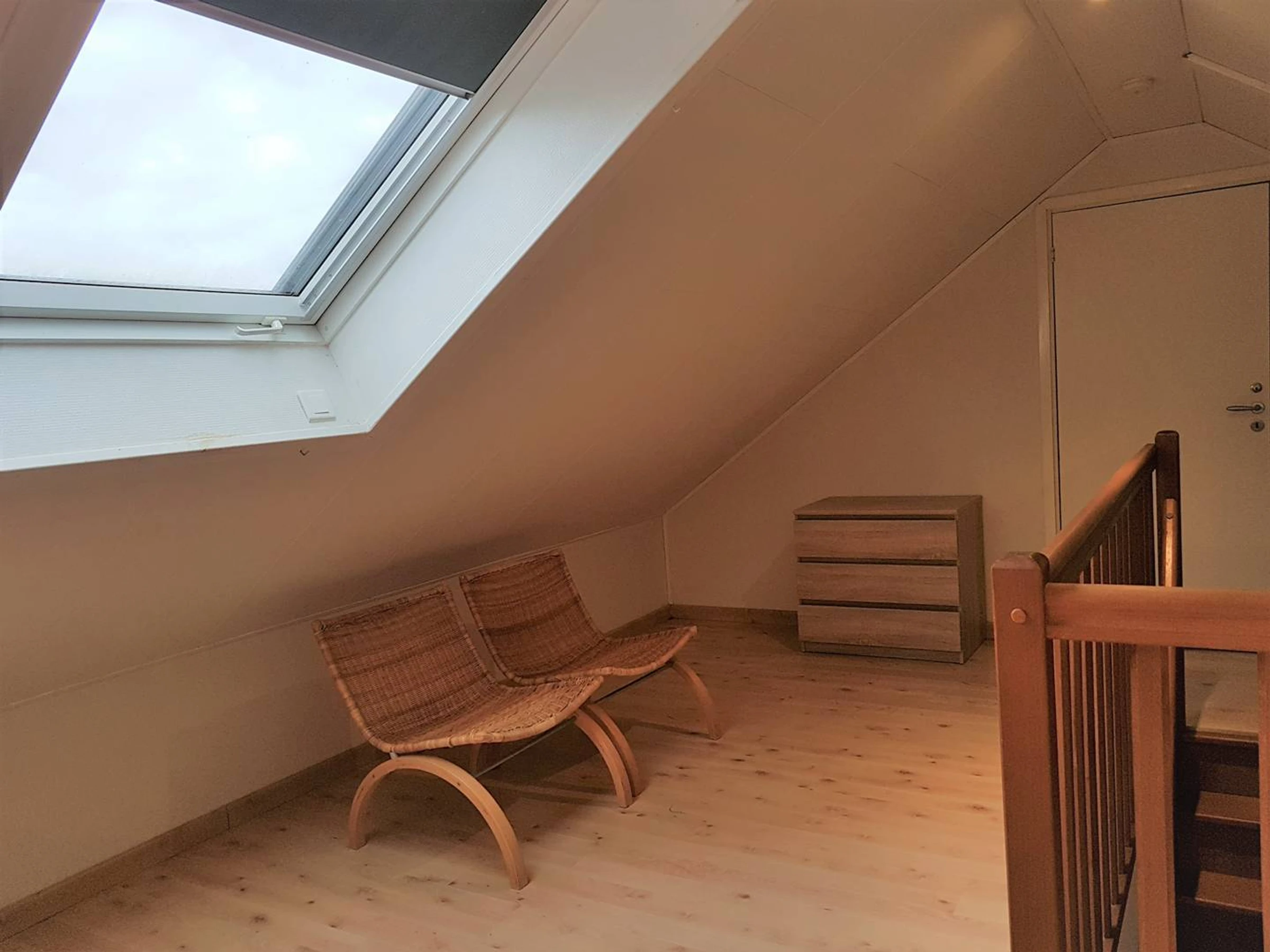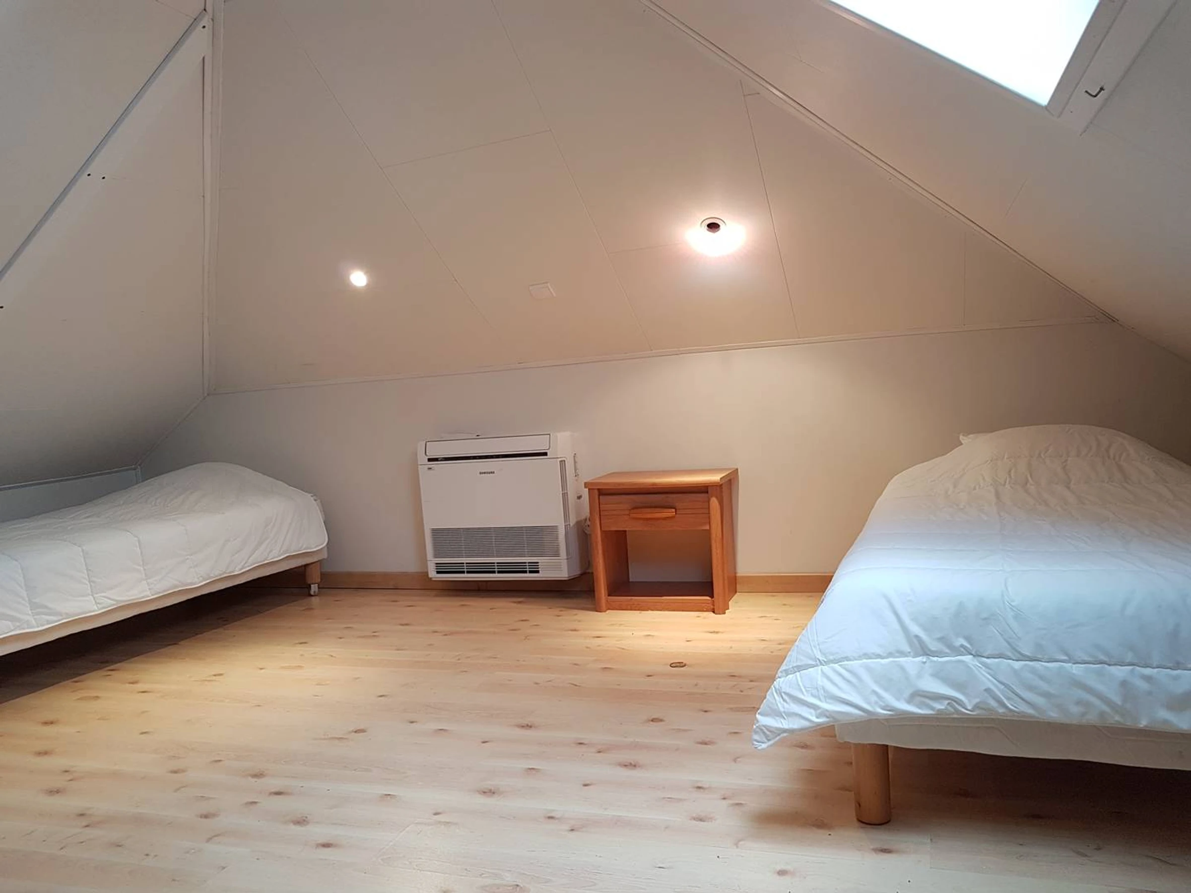 Obergeschoss: Im Zwischengeschoss unter dem Dach (Klimaanlage): Schlafzimmer mit 2 Einzelbetten (90 cm breit), die zusammengeschoben werden können, Kommode und Kleiderständer.