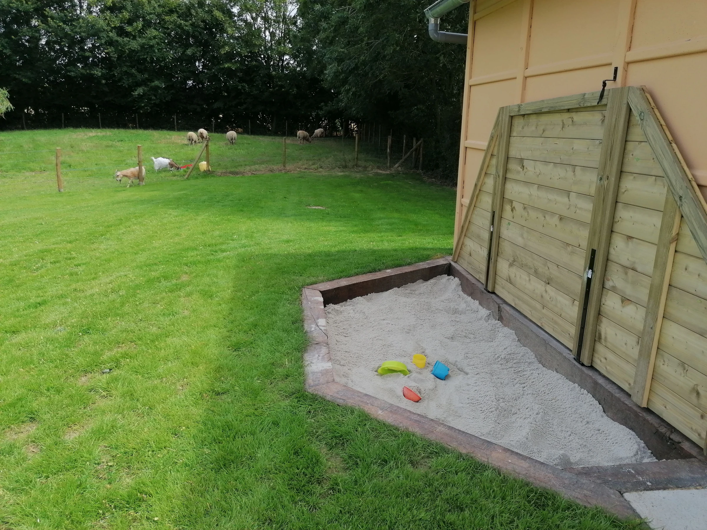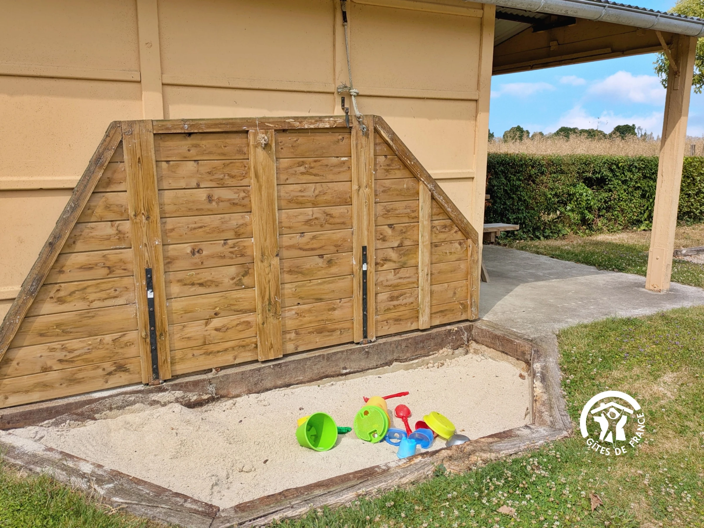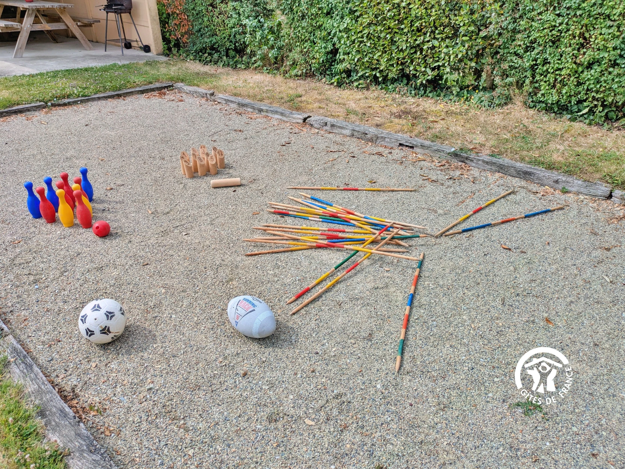 Außenbereich: Eingezäunter Garten (nur vom Eingang aus zugänglich), Hof mit Parkplatz, Gartenmöbel, Liegestühle, überdachter Bereich, Holzkohlegrill, Sandkasten, Boulebahn, Spiele (Mölkky, Kegeln, Riesen-Mikado, Bälle), 16-A-Steckdose zum Laden von Elektroautos, Wohnmobilanschluss (Steckdose vorhanden).