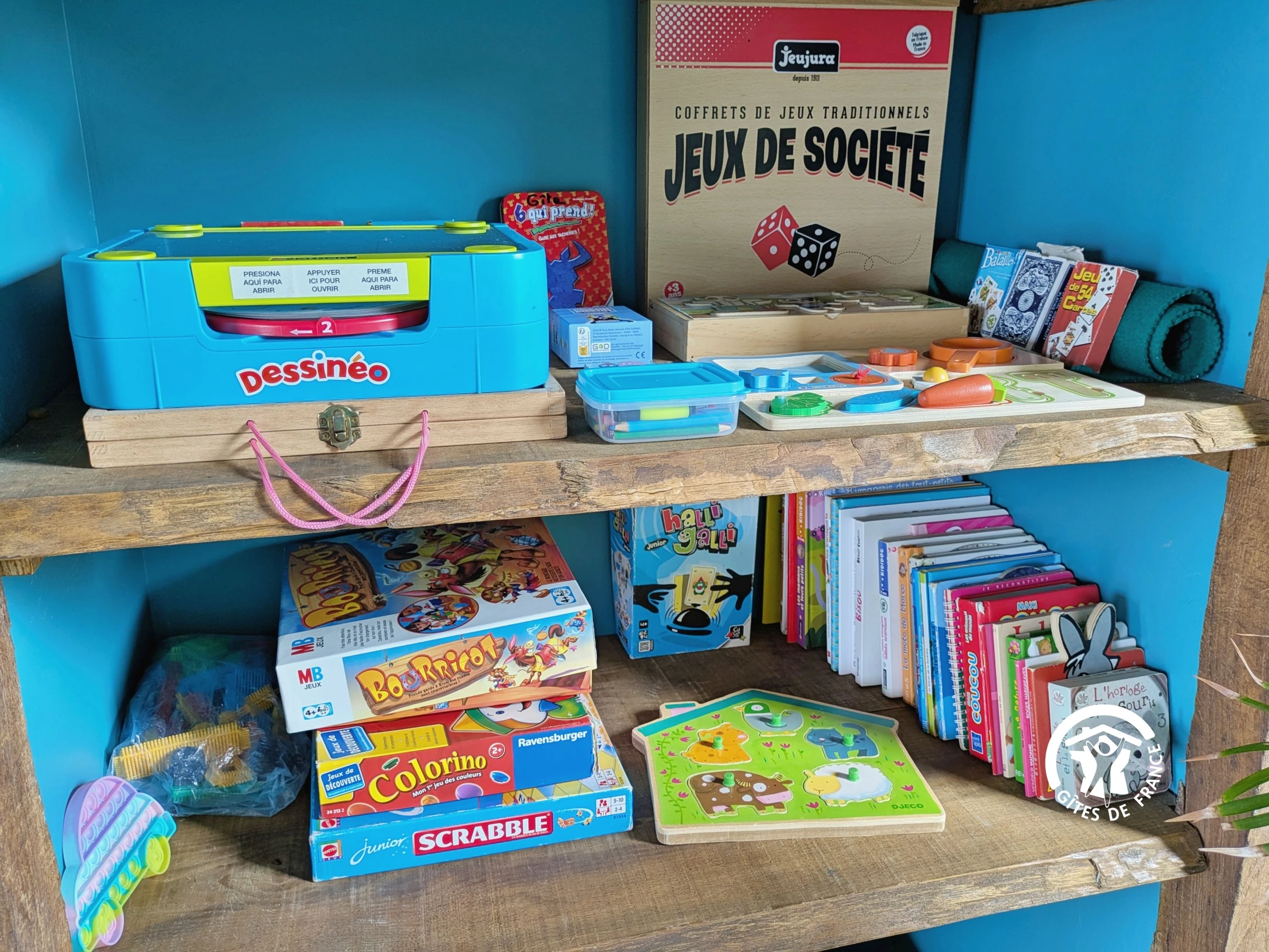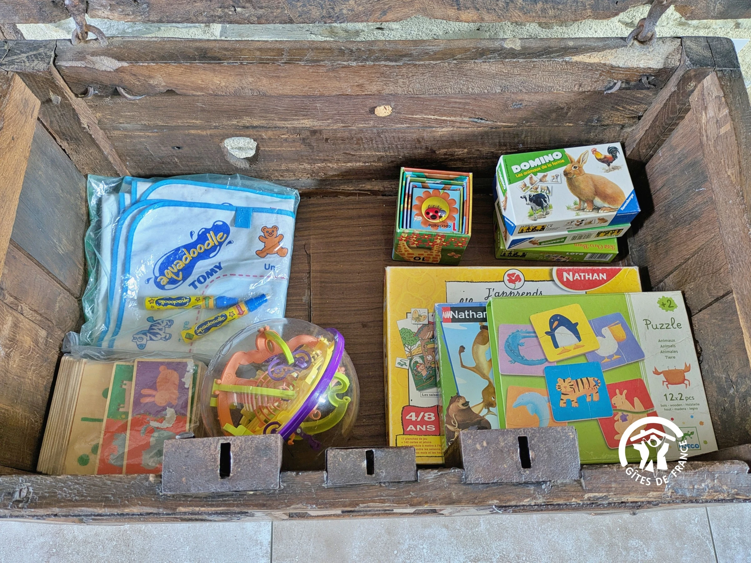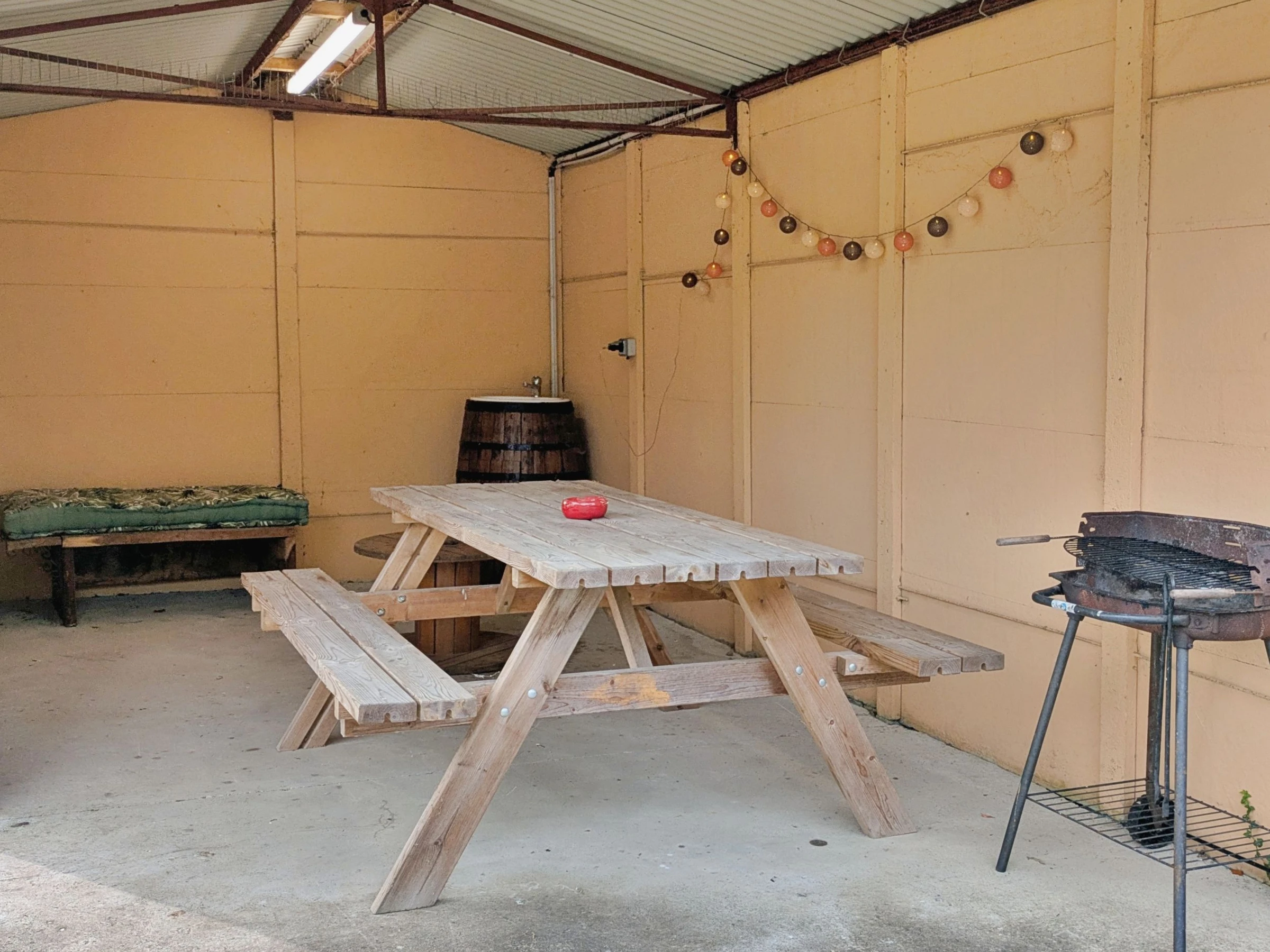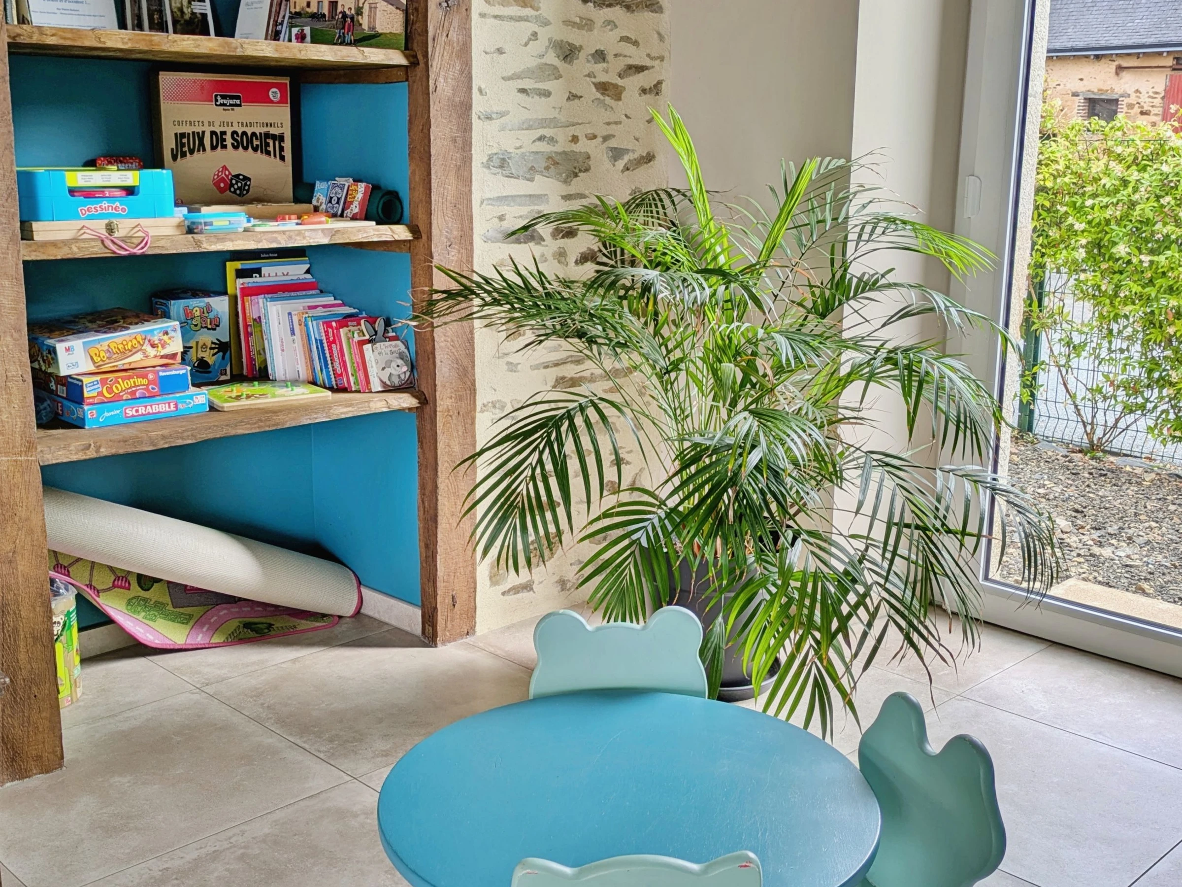 Außenbereich: Eingezäunter Garten (nur vom Eingang aus zugänglich), Hof mit Parkplatz, Gartenmöbel, Liegestühle, überdachter Bereich, Holzkohlegrill, Sandkasten, Boulebahn, Spiele (Mölkky, Kegeln, Riesen-Mikado, Bälle), 16-A-Steckdose zum Laden von Elektroautos, Wohnmobilanschluss (Steckdose vorhanden).