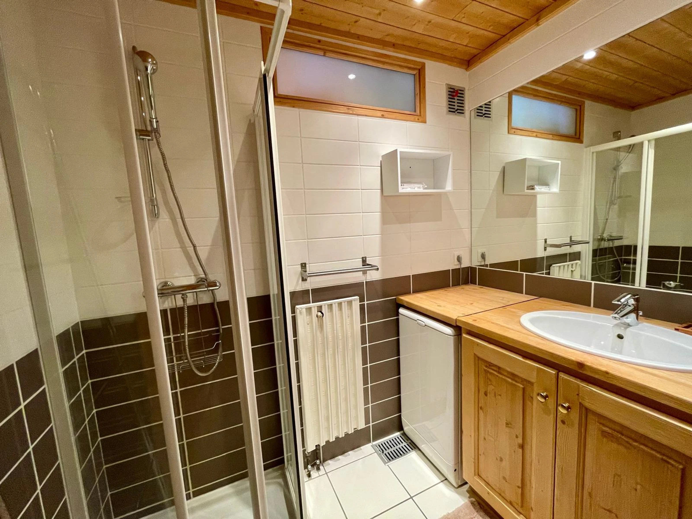 - Badezimmer mit Dusche, Waschbecken und Waschmaschine