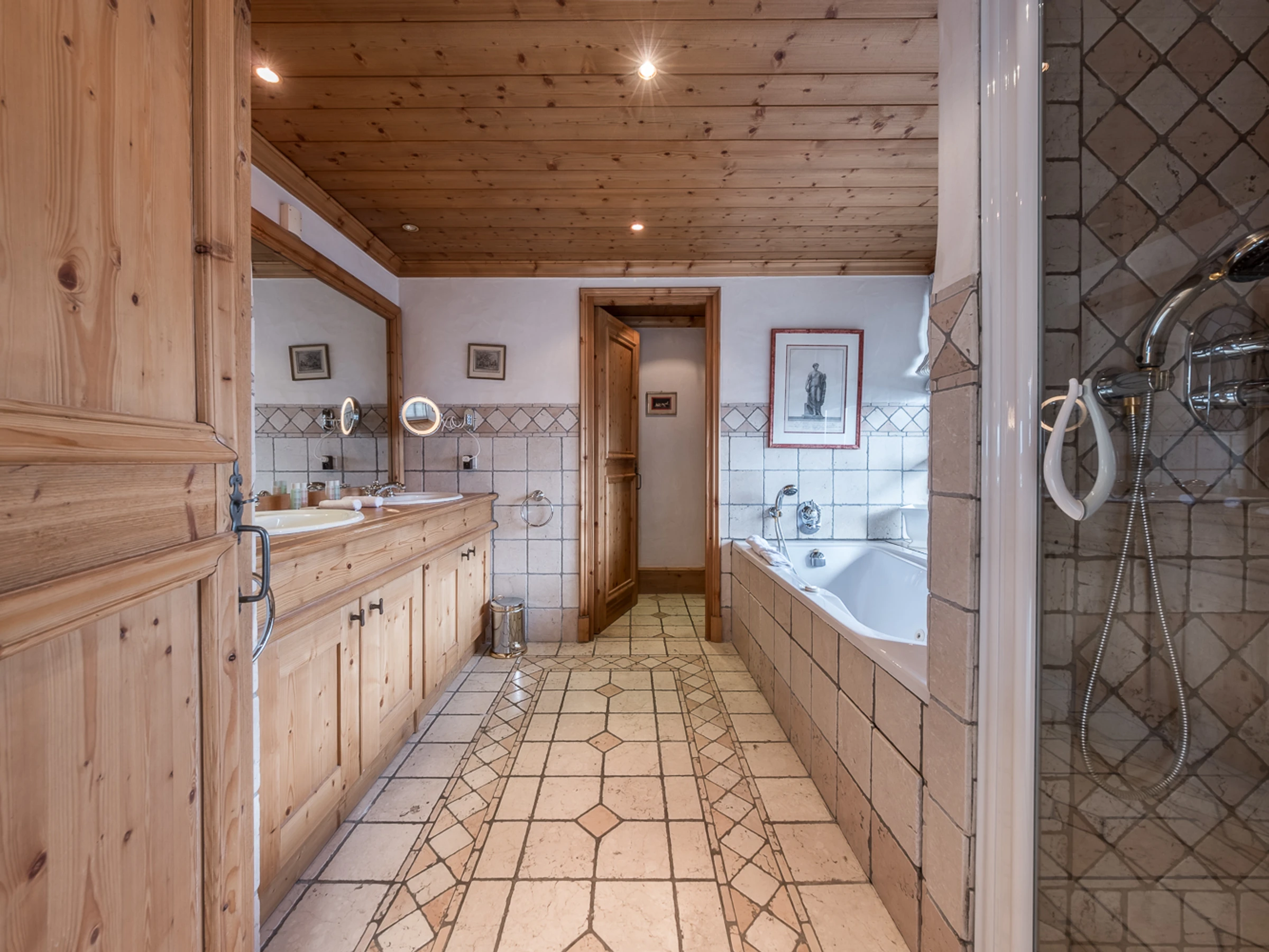 - Badezimmer mit Dusche und Whirlpool-Badewanne, Doppelwaschbecken und separatem WC