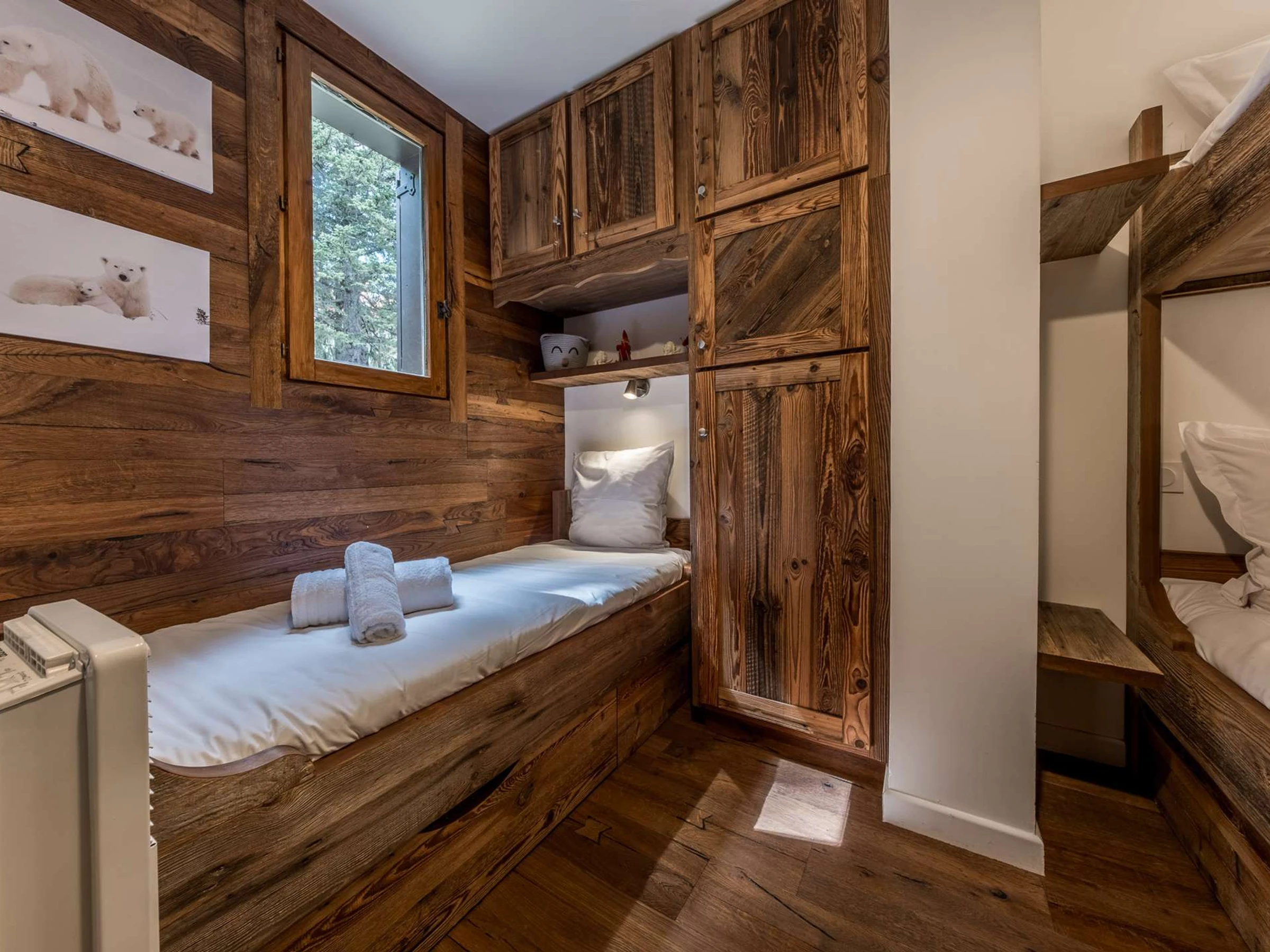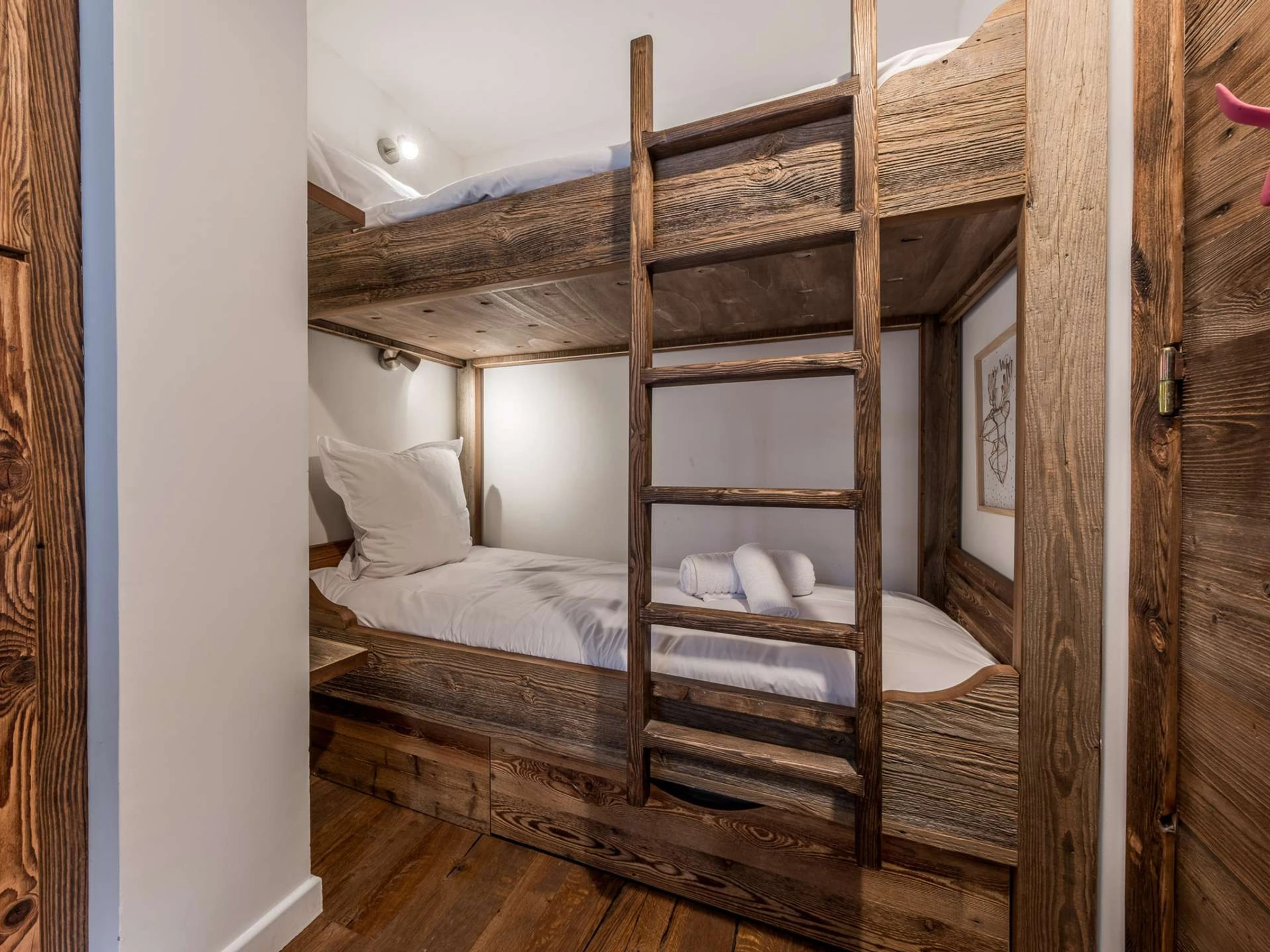 - Ein Schlafzimmer mit Einzelbett und Etagenbett (für 3 Personen) sowie Stauschränken