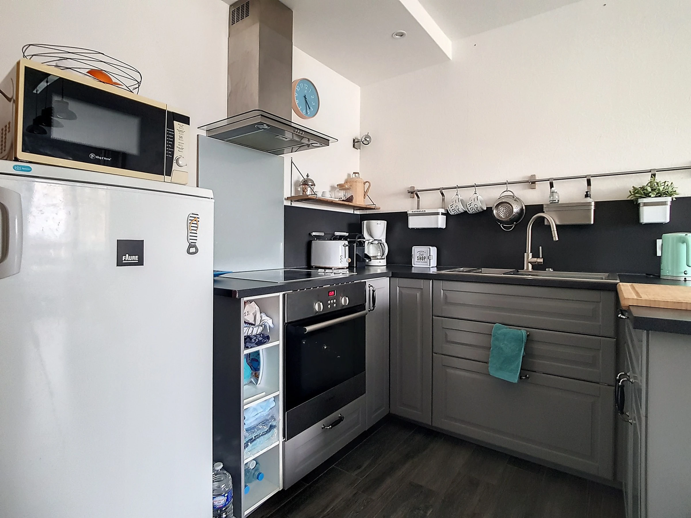 - eine gewürzte und vierteilige Küche, Kochplatte, Kühlschrank, Mikrowelle, Kaffeemaschine, Bouilloire, Grillrost