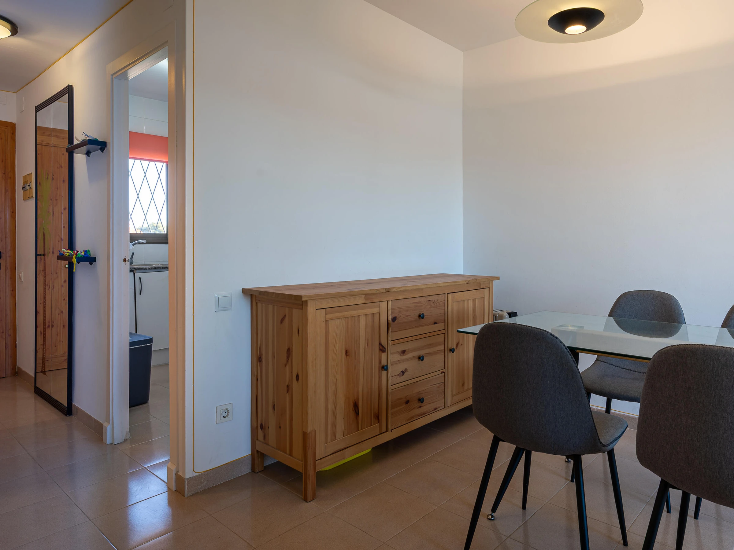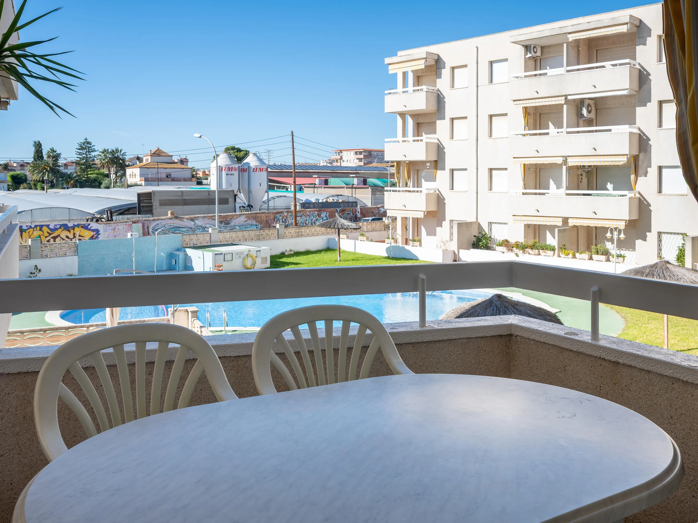 AT157 Popea: Einladende Wohnung im ersten Stock mit Zugang zu einem großen, gemeinschaftlich genutzten Salzwasserpool im charmanten Dorf Creixell, nur 5 Minuten vom Strand entfernt. Die Wohnung verfügt über zwei Doppelzimmer (eines mit Doppelbett, das andere mit Etagenbett (135 x 190 cm)), ein Badezimmer mit Badewanne, eine separate Küche mit Nespresso-Maschine und einen Wohn-/Essbereich mit Zugang zu einer möblierten Terrasse mit Markise und Blick auf den Gemeinschaftsbereich. Für zusätzlichen Komfort sorgen eine Klimaanlage im Wohnzimmer und ein Deckenventilator im Hauptschlafzimmer. WLAN und ein privater Parkplatz in der Tiefgarage sind im Mietpreis inbegriffen. Buchungen für Gruppen junger Erwachsener zwischen 16 und 26 Jahren sind nicht möglich.