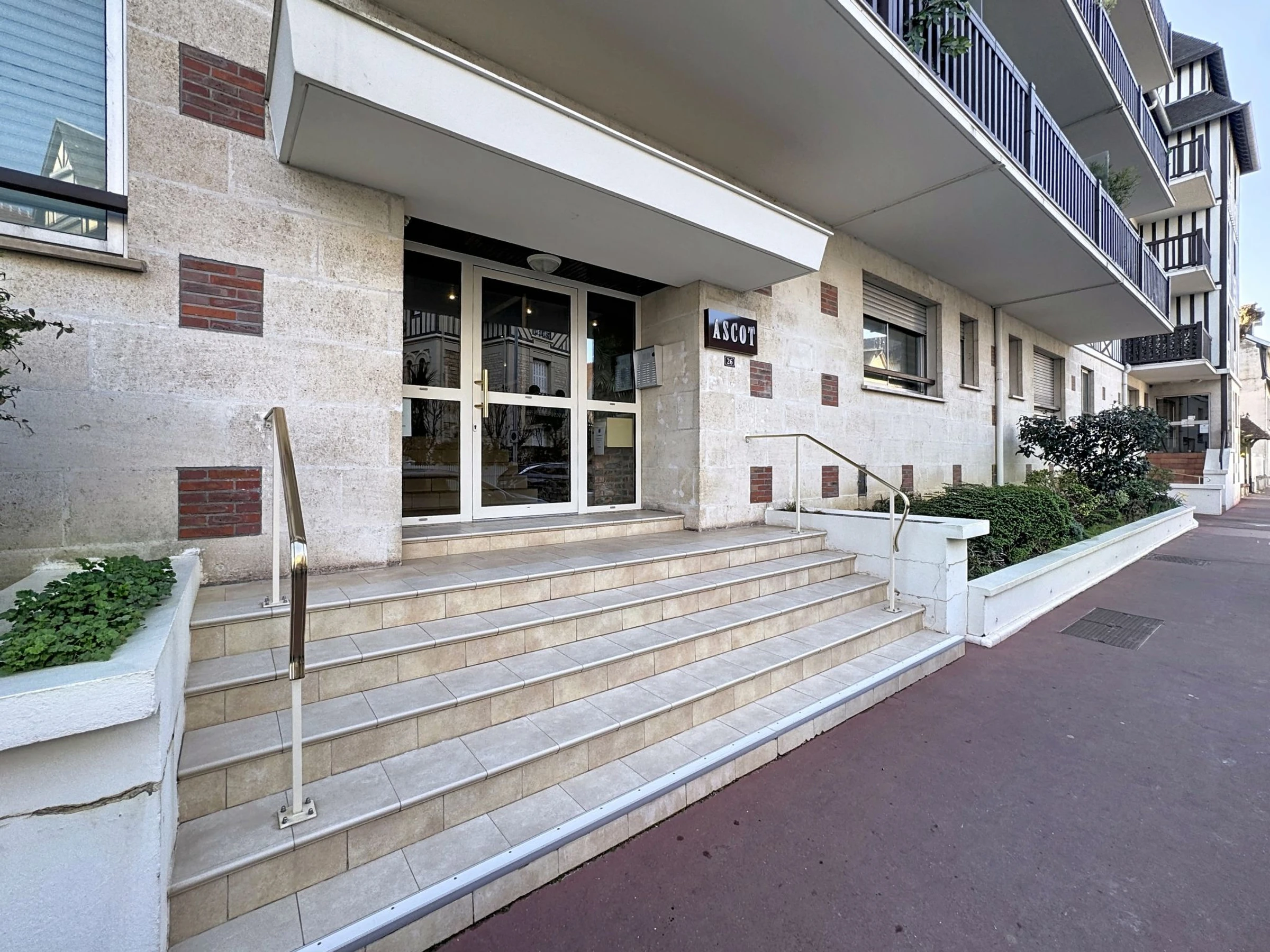 Deauville: Residenz "Ascot", auf 4 Stockwerken, angebaut. Im Ort, 350 m vom Zentrum, ruhige Lage, 1.4 km vom Meer, 1.4 km vom Strand, Richtung Osten. In der Anlage: Fahrstuhl. (6 Stufen). Einkaufsgeschäft 350 m, Supermarkt 280 m, Restaurant 100 m, Bäckerei 60 m, Zentrum zu Fuss in 4 Minuten erreichbar, Bushaltestelle "Gare routière" 500 m, Bahnstation "Deauville-Trouville" 500 m, Sandstrand "les planches de Deauville" 1.4 km, Hallenbad 1.1 km, Thermalbad "thalasso de Deauville" 1.1 km. Golfplatz (18 Loch) 3.7 km. Nahe gelegene Sehenswürdigkeiten: casino de Deauville 1 km, hippodrome Deauville La Touques 1.2 km, Honfleur village normand 16 km, Mémorial de Caen 54 km, Arromanches plage du débarquement 80 km. Die Schlüsselübergabe findet bei der Agentur in Deauville statt.