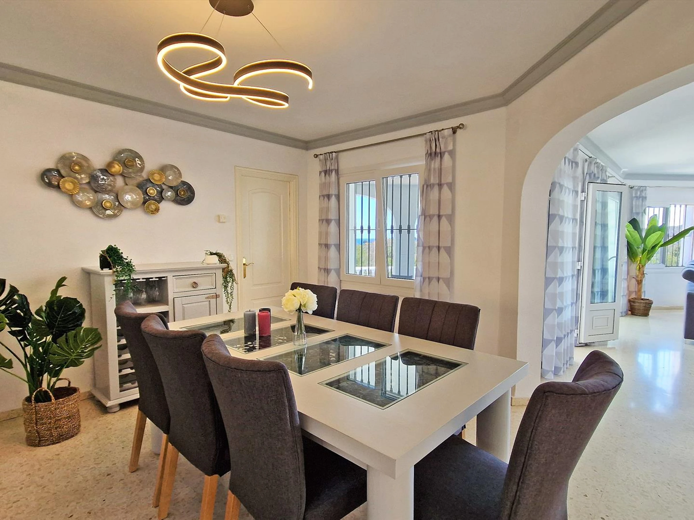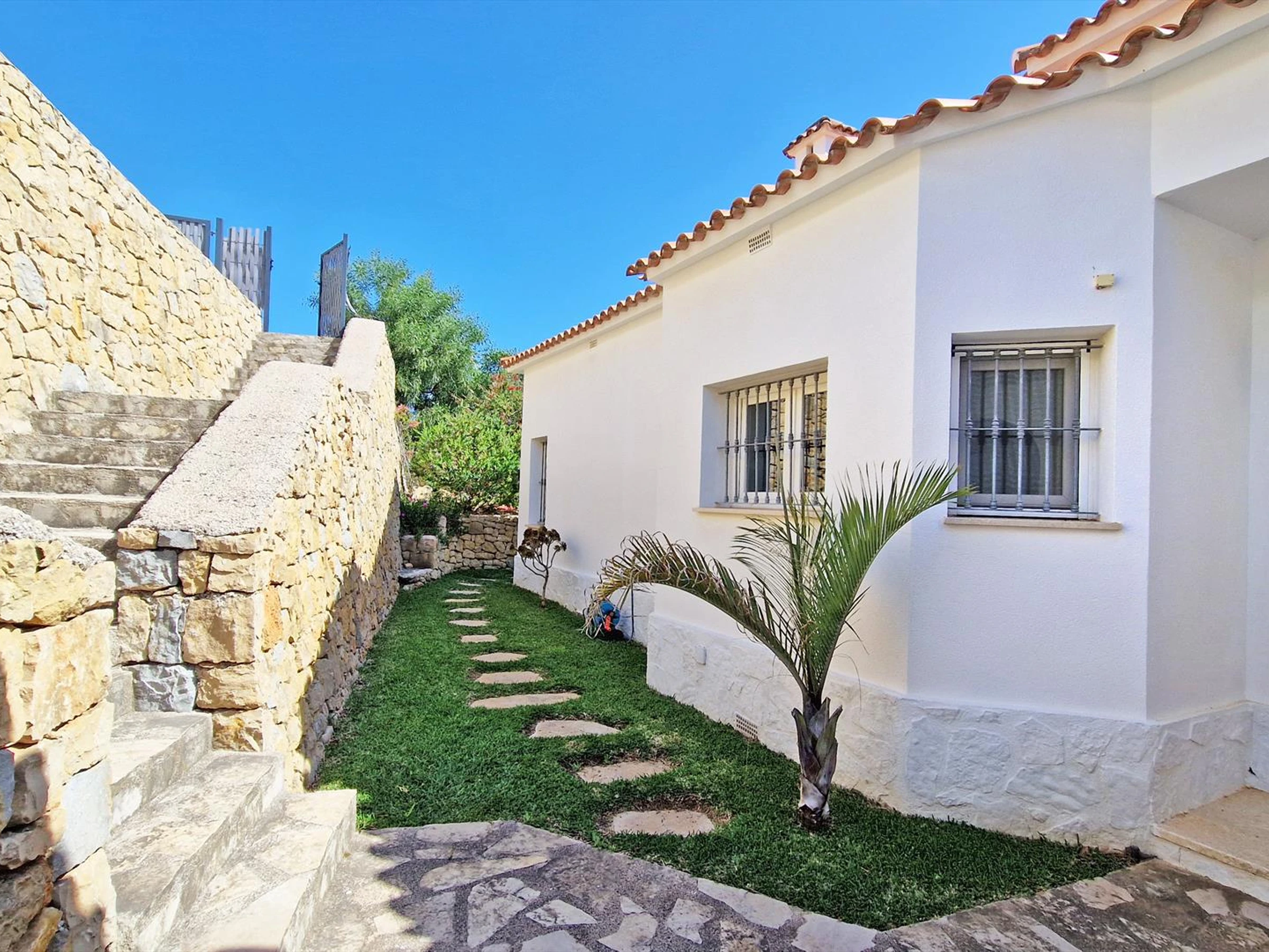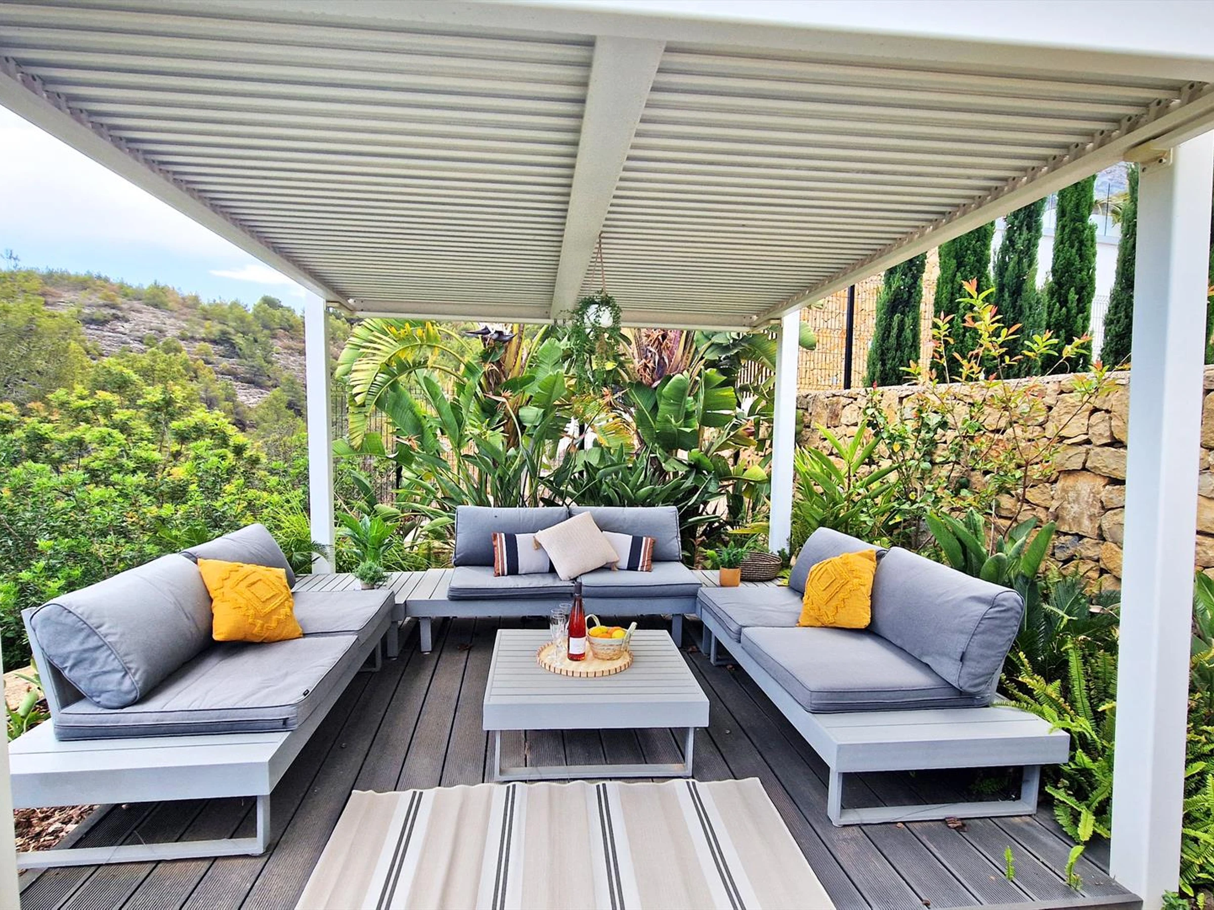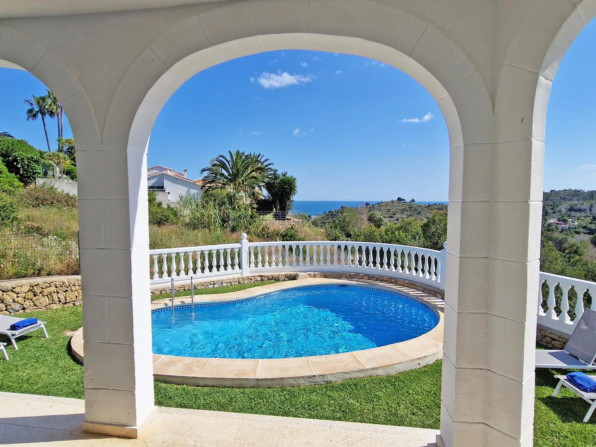 Komfortables Ferienhaus für 6 Personen, in einer ruhigen Wohngegend gelegen am Fuss des Bergs Montgó, Denia. Ein charmantes Haus umgeben von Rasen und mediterranem Garten, mit privatem Pool und beeindruckender Aussicht auf das Meer, das Bergmassiv und die Umgebung.