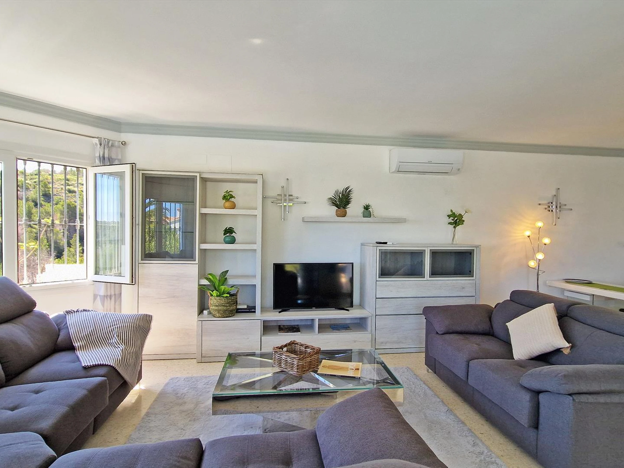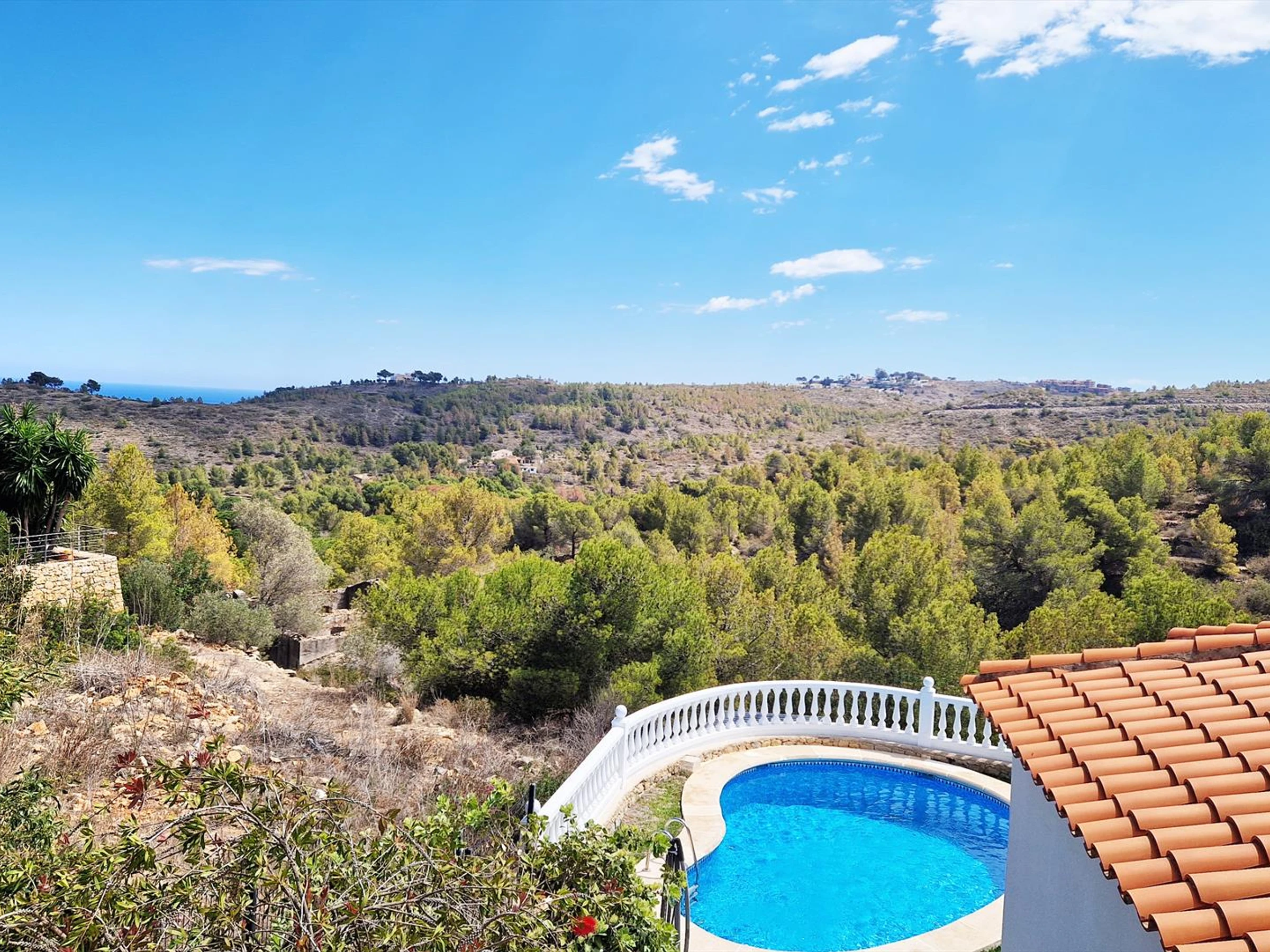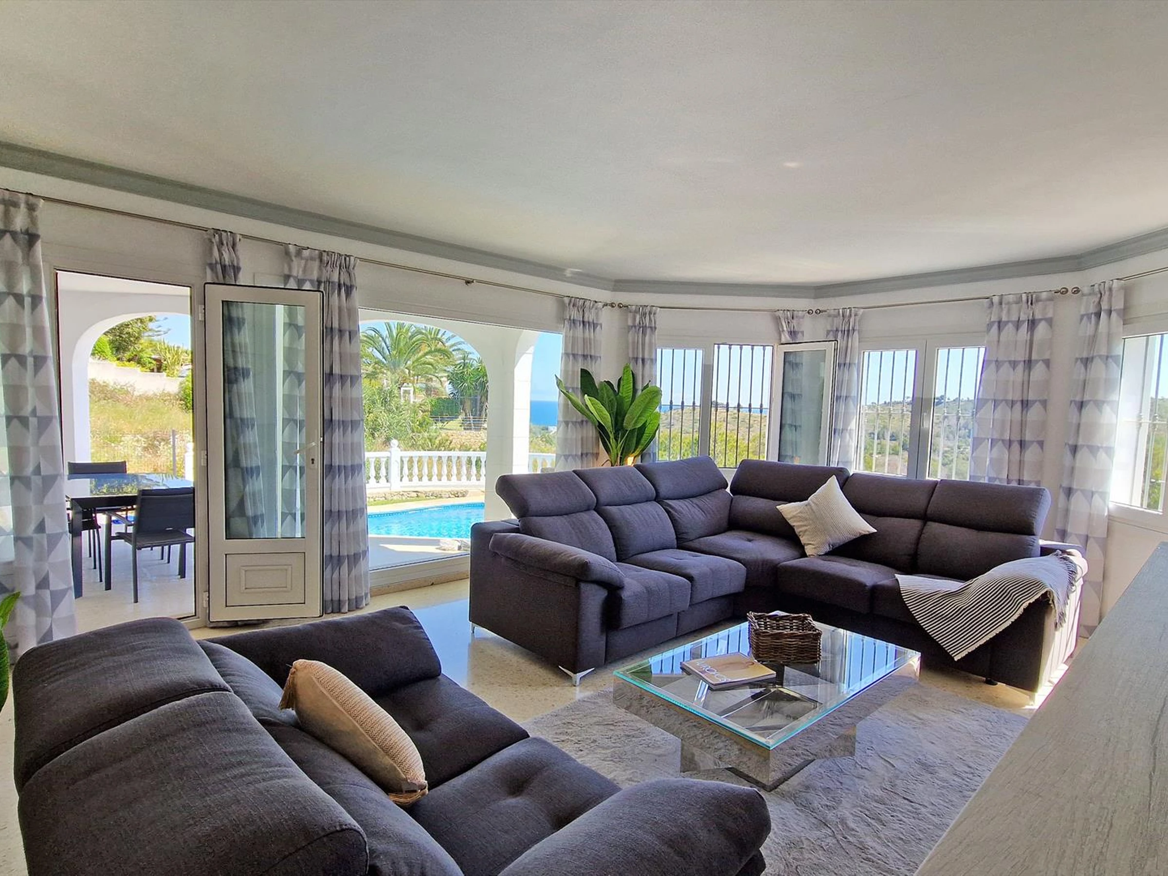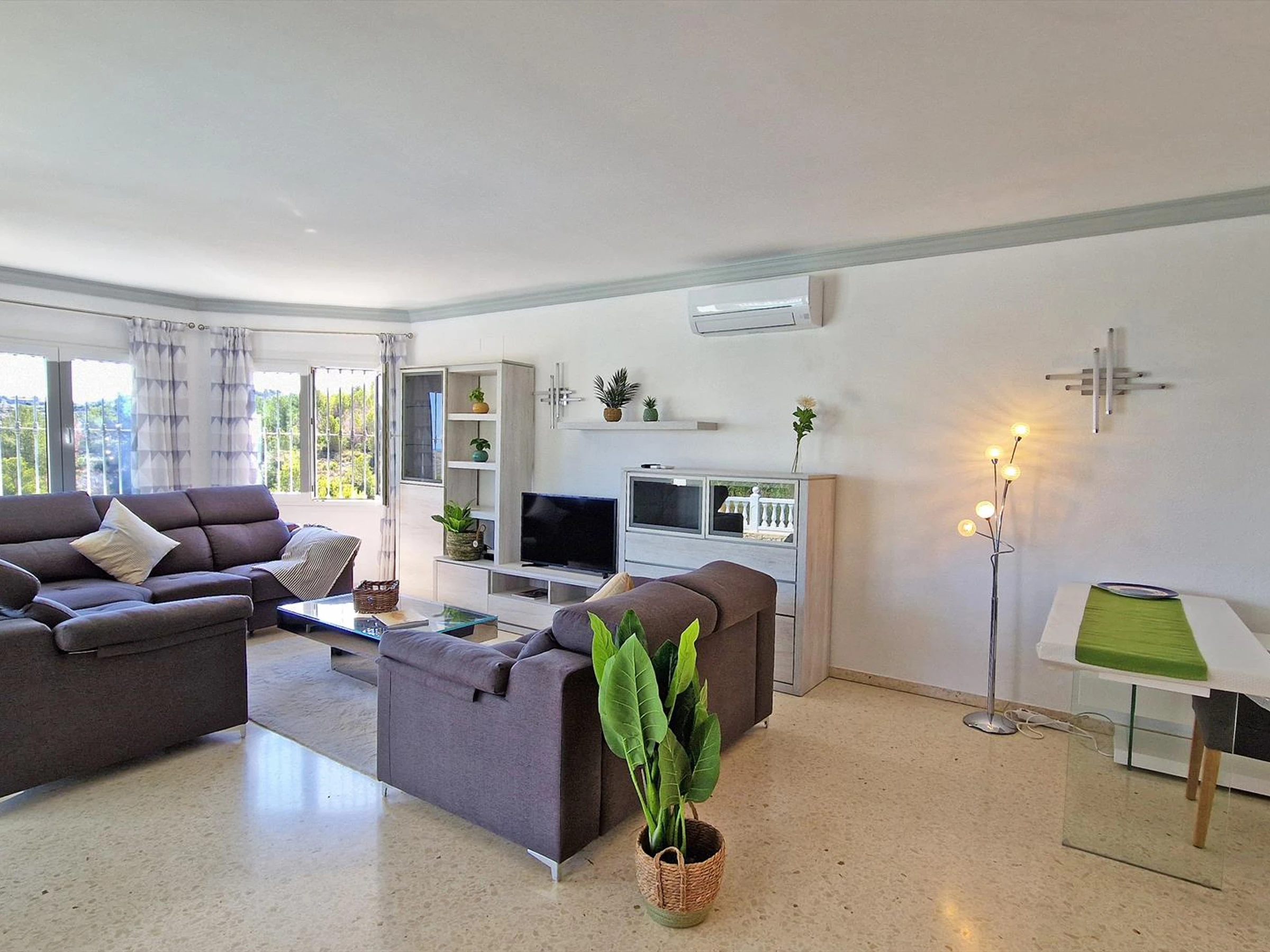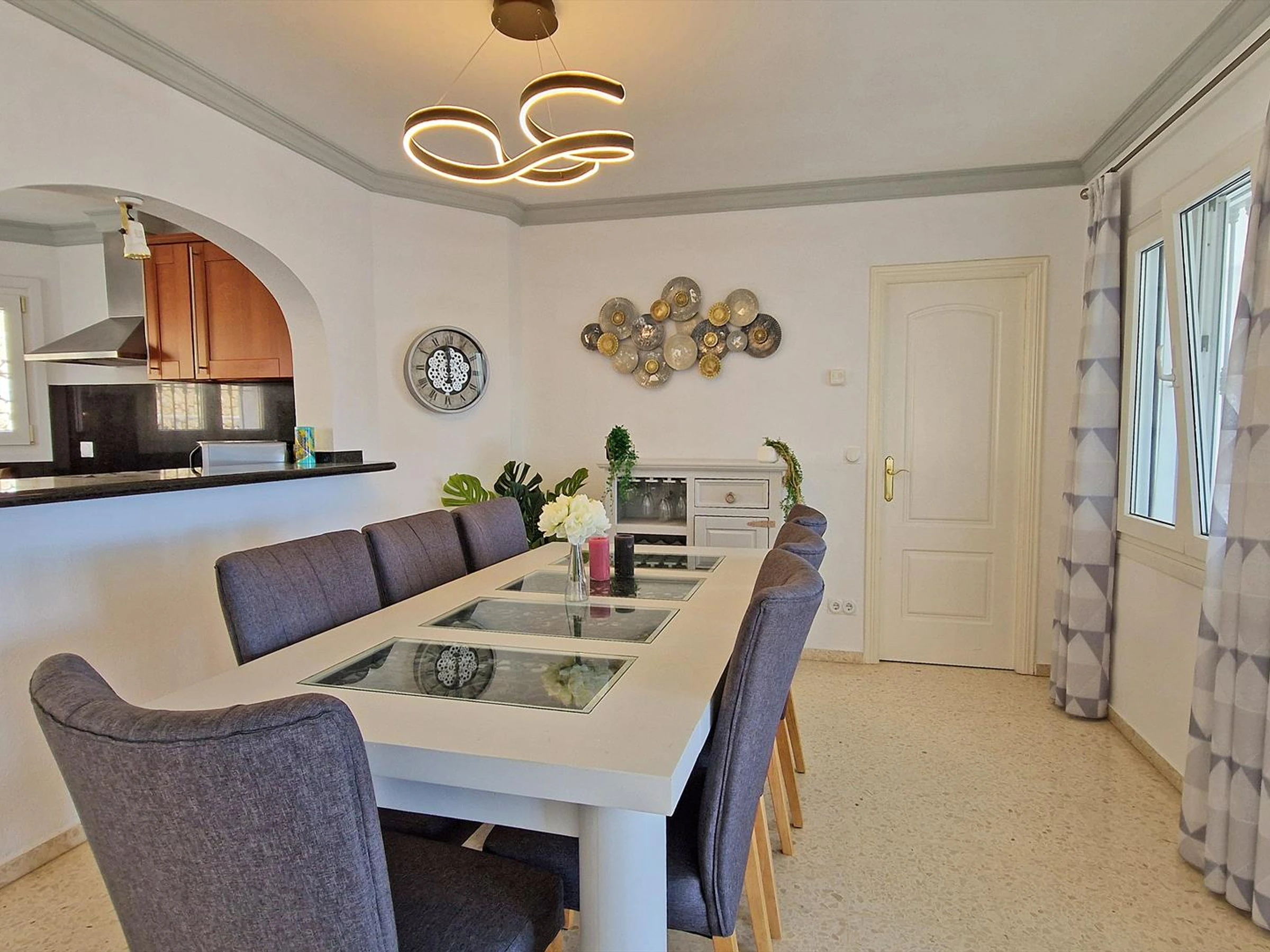 Komfortables Ferienhaus für 6 Personen, in einer ruhigen Wohngegend gelegen am Fuss des Bergs Montgó, Denia. Ein charmantes Haus umgeben von Rasen und mediterranem Garten, mit privatem Pool und beeindruckender Aussicht auf das Meer, das Bergmassiv und die Umgebung.