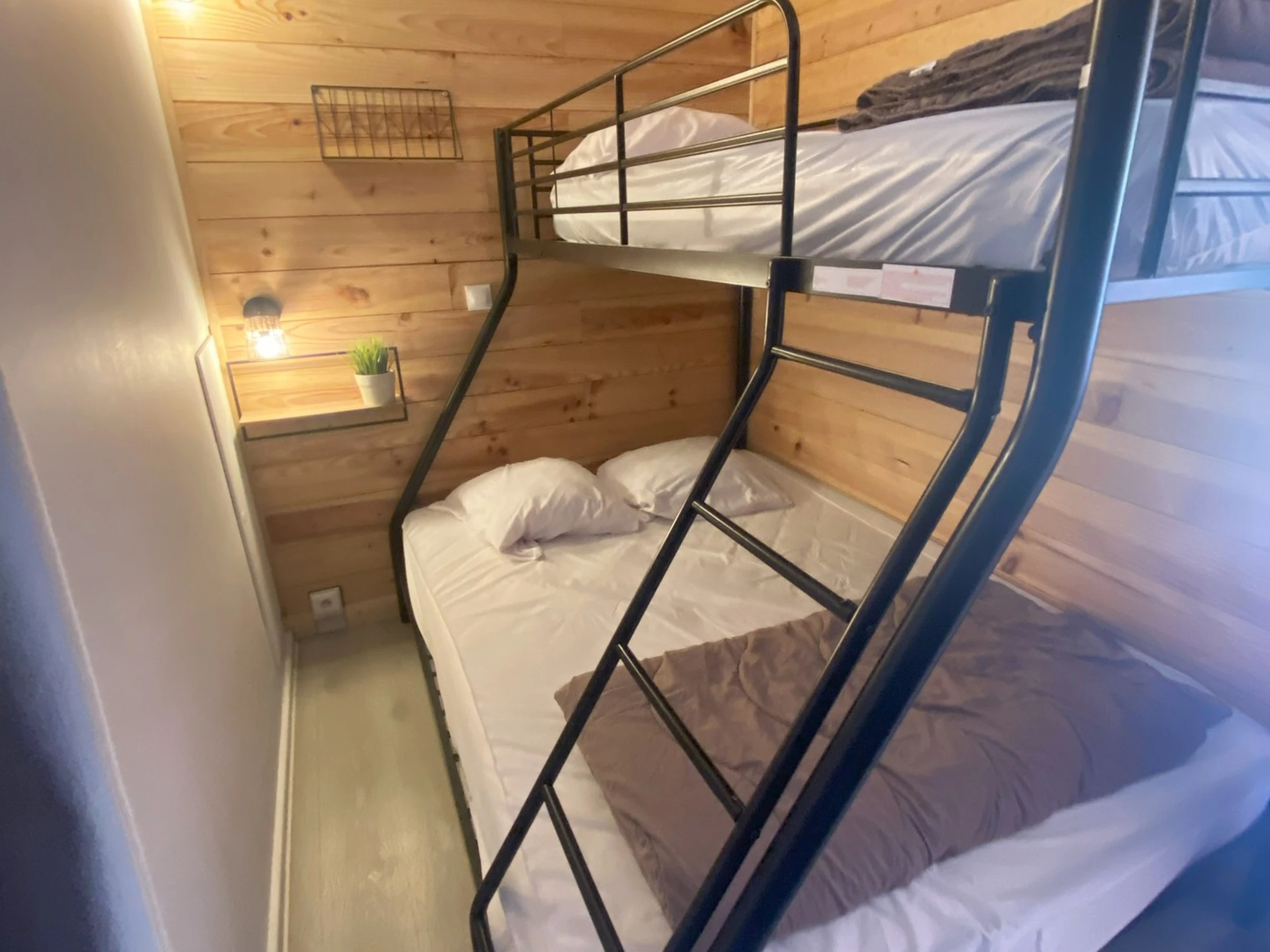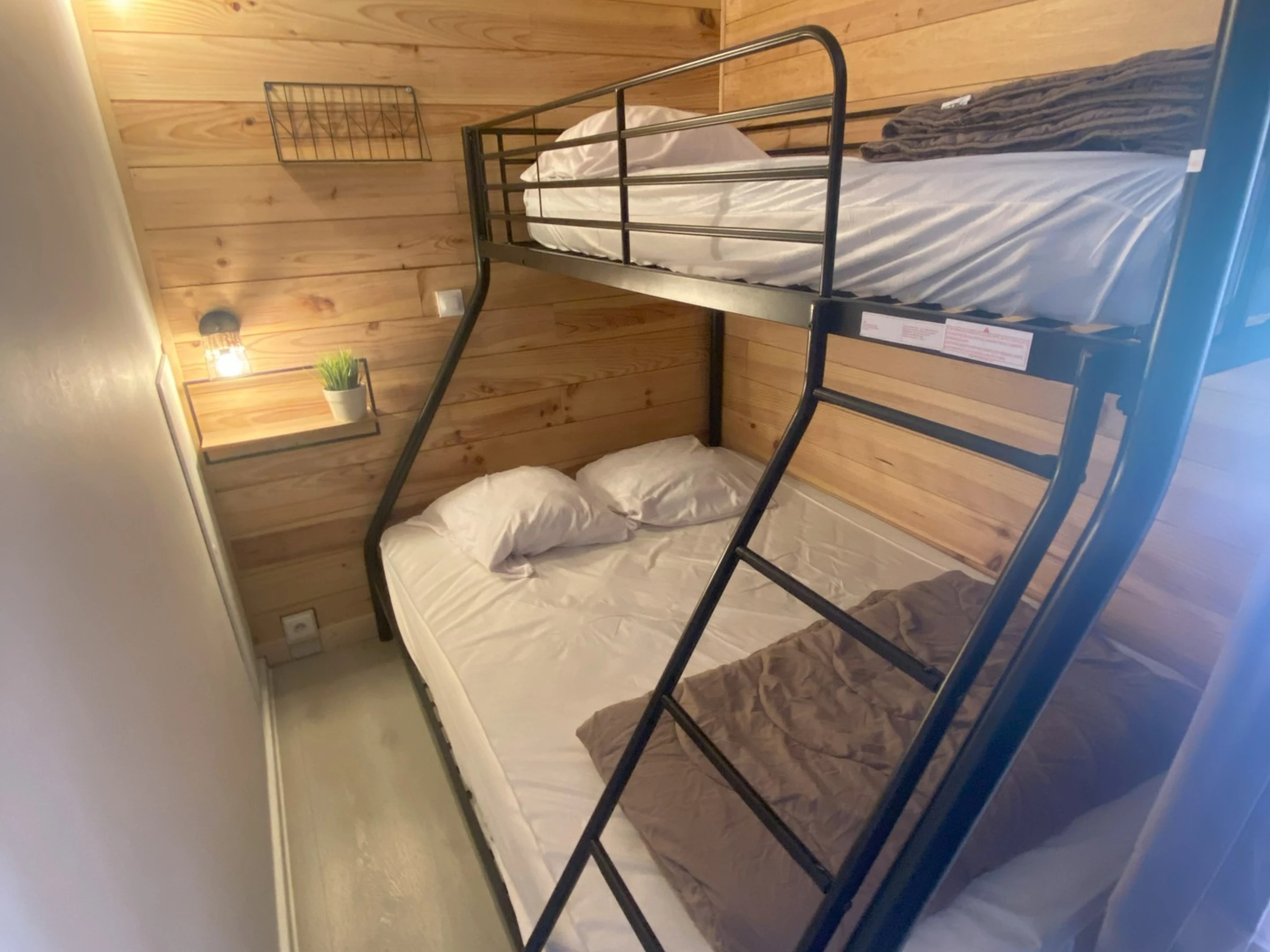 Wohnzimmer mit Essbereich und Doppelschlafcouch, getrennt von der Schlafnische mit Etagenbett. TV inklusive.