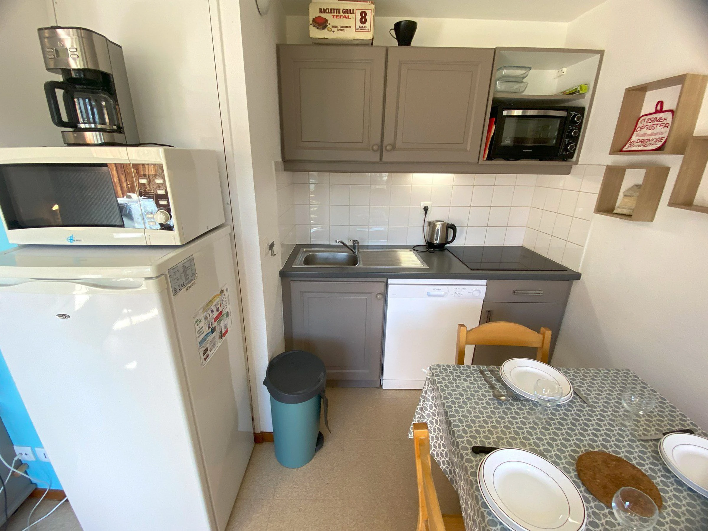 Küche komplett ausgestattet mit Geschirrspüler, Mikrowelle, Kaffeemaschine, 4 Herdplatten.