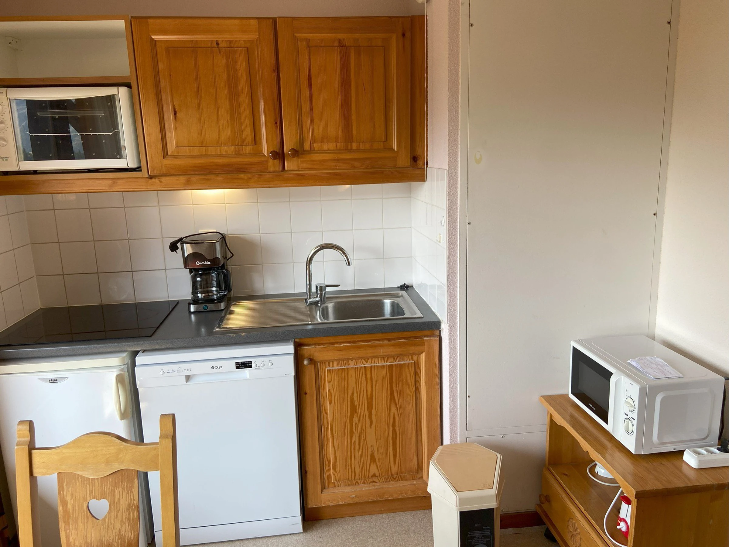 Sofa im Wohnzimmer. Kabine mit Etagenbett. Schlafzimmer mit einem Doppelbett. Voll ausgestattete Küche, Geschirrspüler, Backofen und Mikrowelle, Kaffeemaschine, vier Herdplatten.