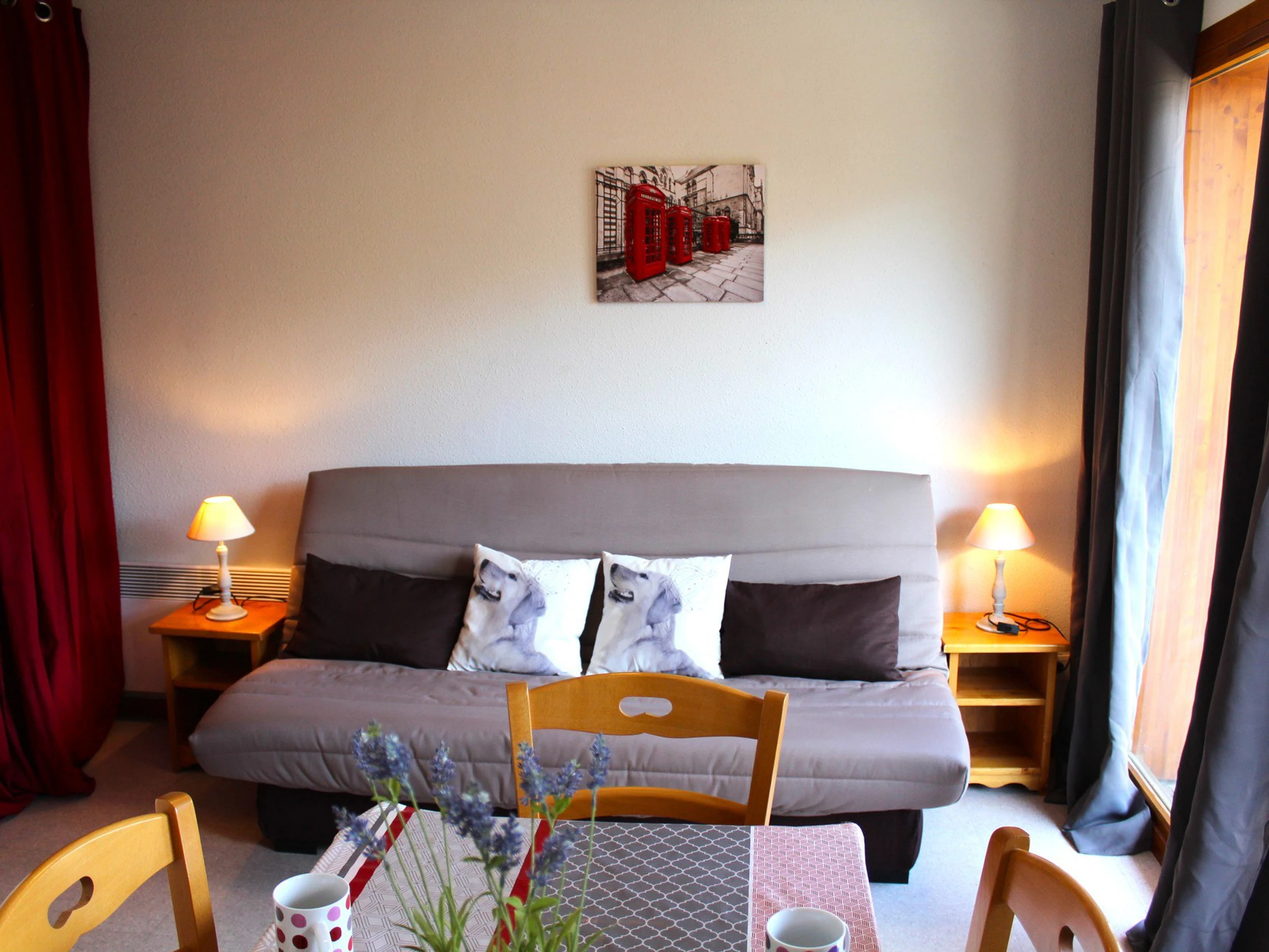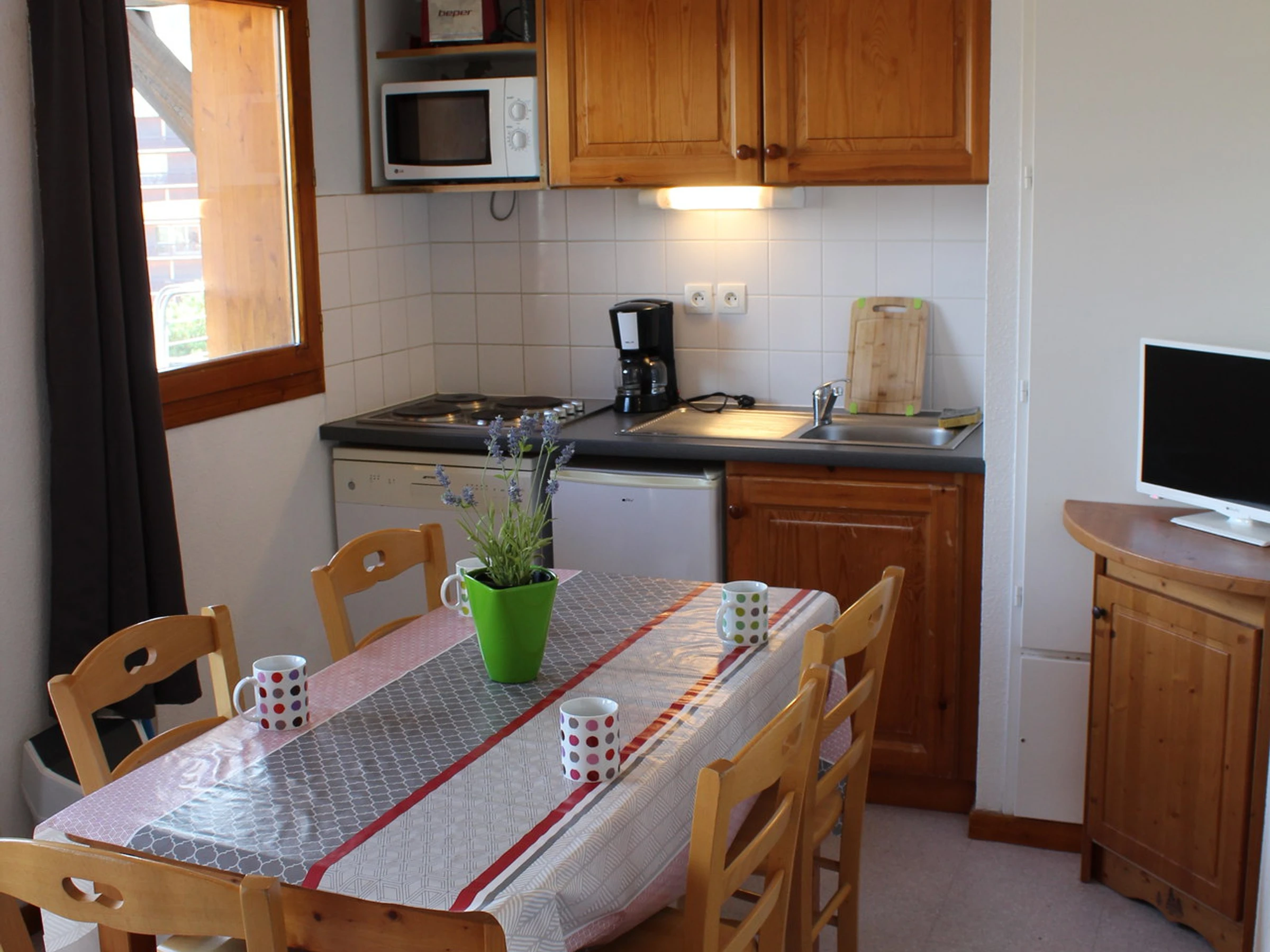 Wohnzimmer mit Schlafcouch 2 Personen. Alkoven mit Etagenbett 2 Personen. Schlafzimmer mit 2 Einzelbetten. Voll ausgestattete Küche, Geschirrspüler, Backofen, Kaffeemaschine, vier Herdplatten.