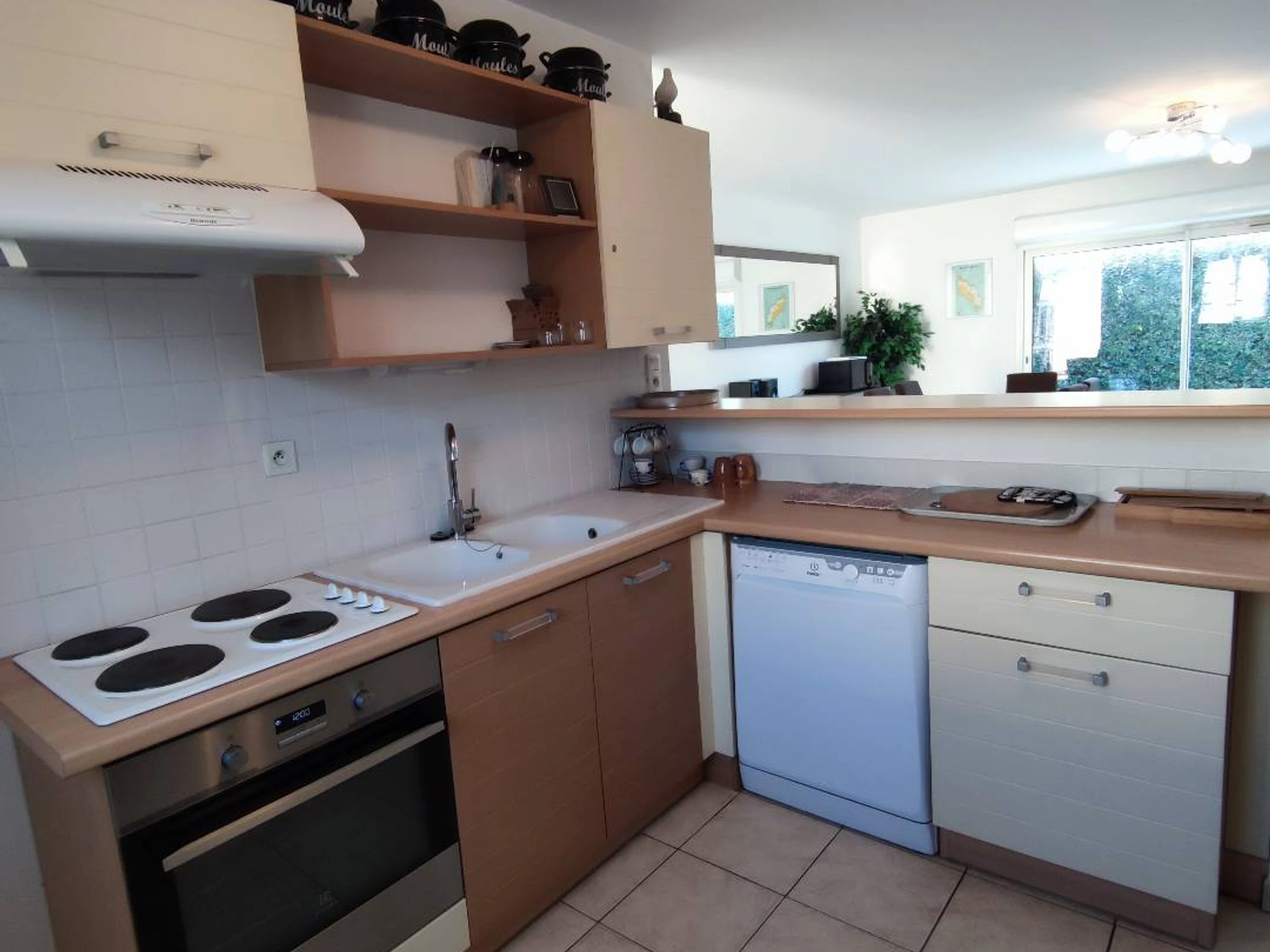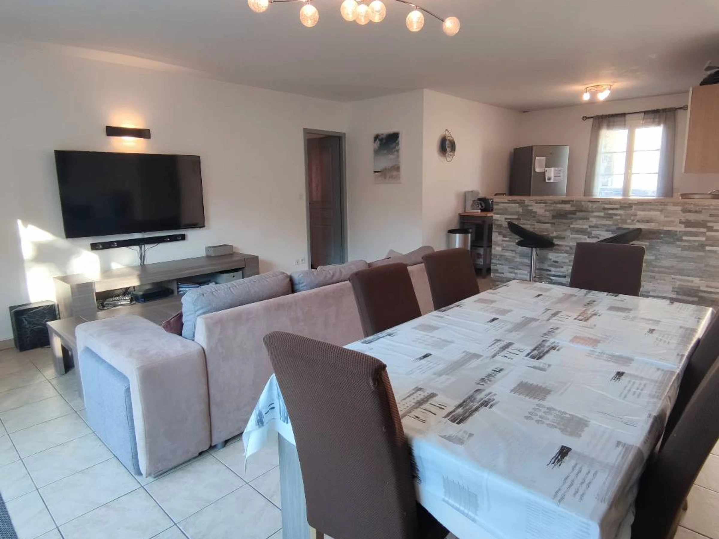- Wohn-/Esszimmer mit TV und offener ausgestatteter Küche (Kühlschrank, Herd, Mikrowelle, Geschirrspüler).