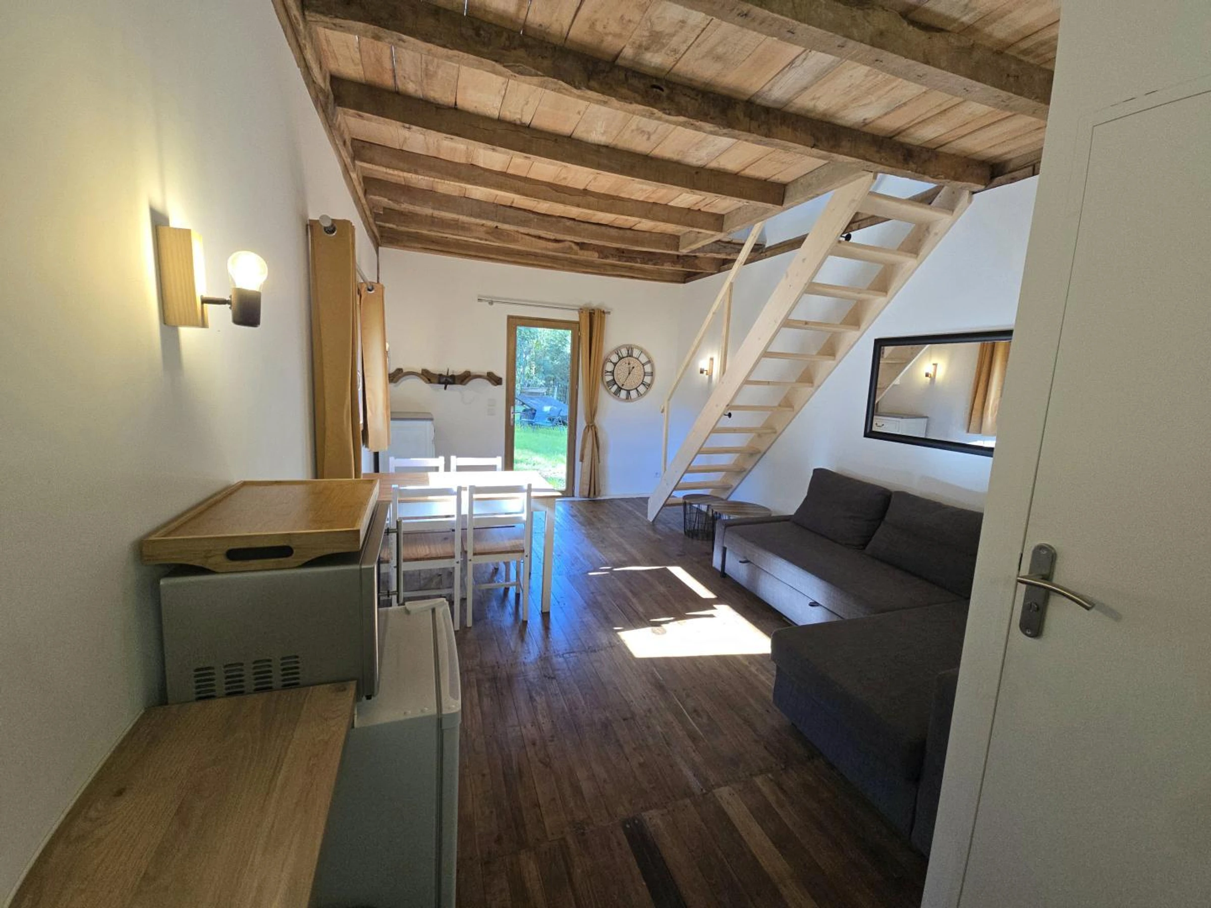 Haus 50 m vom Haus der Eigentümer entfernt, in einem bewaldeten Park neben dem Gehege von 2 Ziegen und 3 Schafen. Dieses Holzchalet verfügt über einen Hauptraum mit einem kleinen Kühlschrank, einer Mikrowelle mit Grill, einer Espressomaschine, einem 2-Flammen-Gasherd, einem Toaster und einer Spüle. Ein Essbereich mit einem Tisch und 4 Stühlen. Ein Ecksofa, das auf Anfrage in ein 140 x 200 cm großes Bett umgewandelt werden kann. Ein Badezimmer mit ebenerdiger Dusche, WC/Trockentoilette. Im Obergeschoss befindet sich ein Zwischengeschoss mit einem 160 x 200 cm großen Bett, einem Schreibtisch und einer umschaltbaren Klimaanlage. In den Monaten Juli und August steht Ihnen ein privater Aufstellpool zur Verfügung. Parkplatz auf dem Grundstück. Eine „Greenup“-Ladestation für Elektrofahrzeuge mit Zwischenzähler zum Tarif von 0,25 €/kWh ist optional. Nur 12 km von Sarlat, einem mittelalterlichen Juwel im Périgord, entfernt, genießt dieses Ferienhaus eine privilegierte Lage inmitten einer halbbewaldeten Landschaft, nur einen Steinwurf von der Dordogne entfernt.