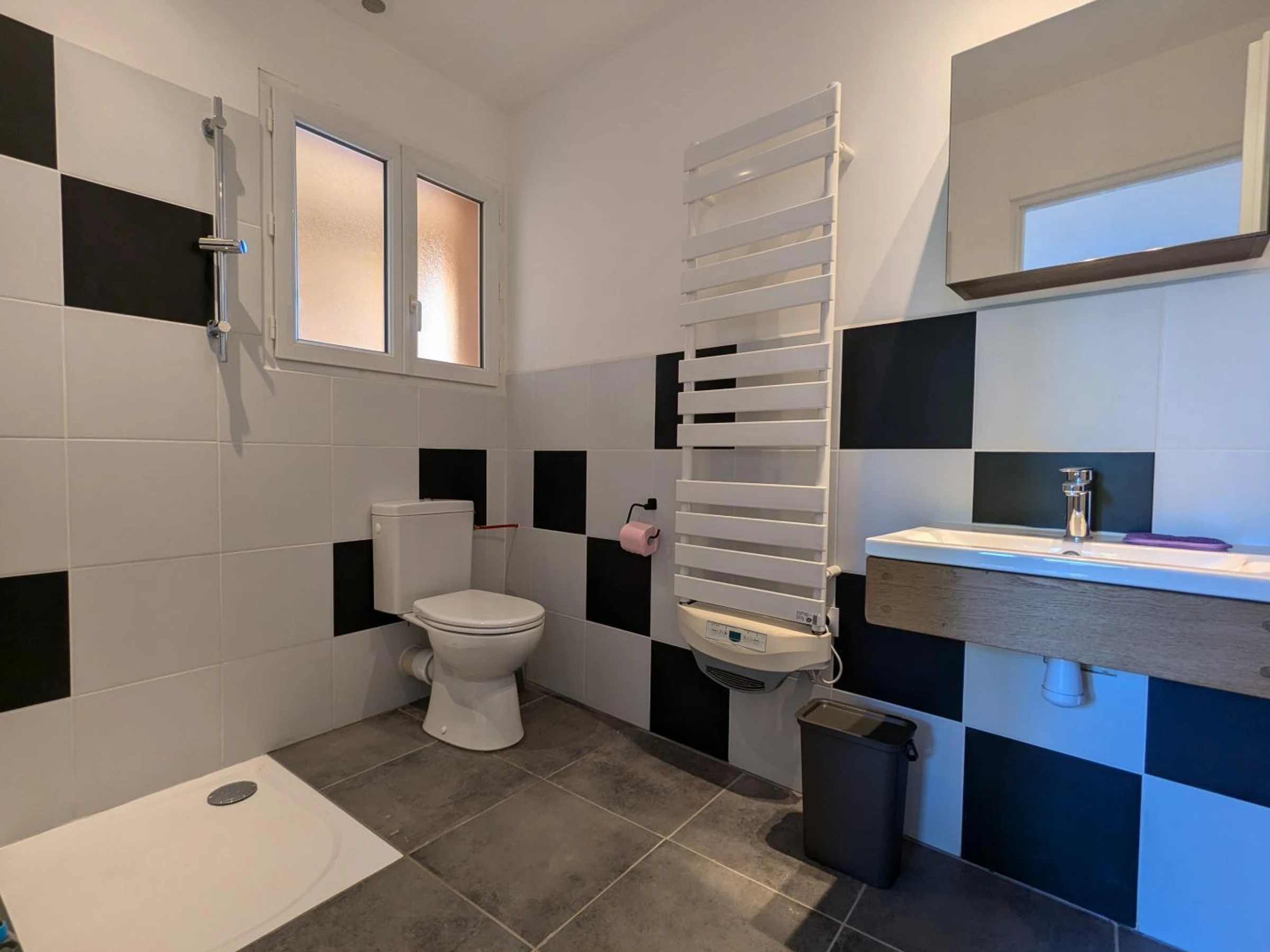 Wohnbereich mit Essbereich, Küche und Wohnzimmer. Eingangsbereich mit Waschmaschine, Homeoffice, Duschbad mit WC, ein Schlafzimmer mit drei Betten (90 x 190 cm), ein zweites Duschbad mit barrierefreiem WC, ein Schlafzimmer mit einem Bett (140 x 190 cm) und ein weiteres Schlafzimmer mit einem Bett (140 x 190 cm) und eigenem Duschbad mit WC.