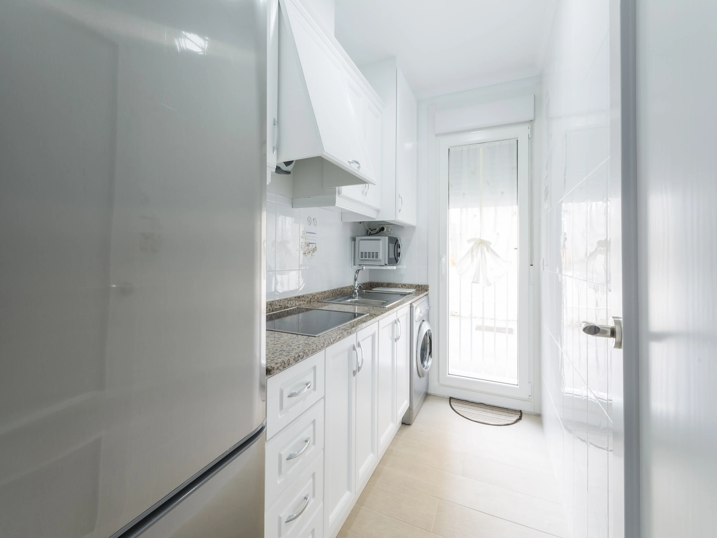 Dieses küche, ist ausgestattet in kühlschrank, mikrowelle und kaffeemaschine.