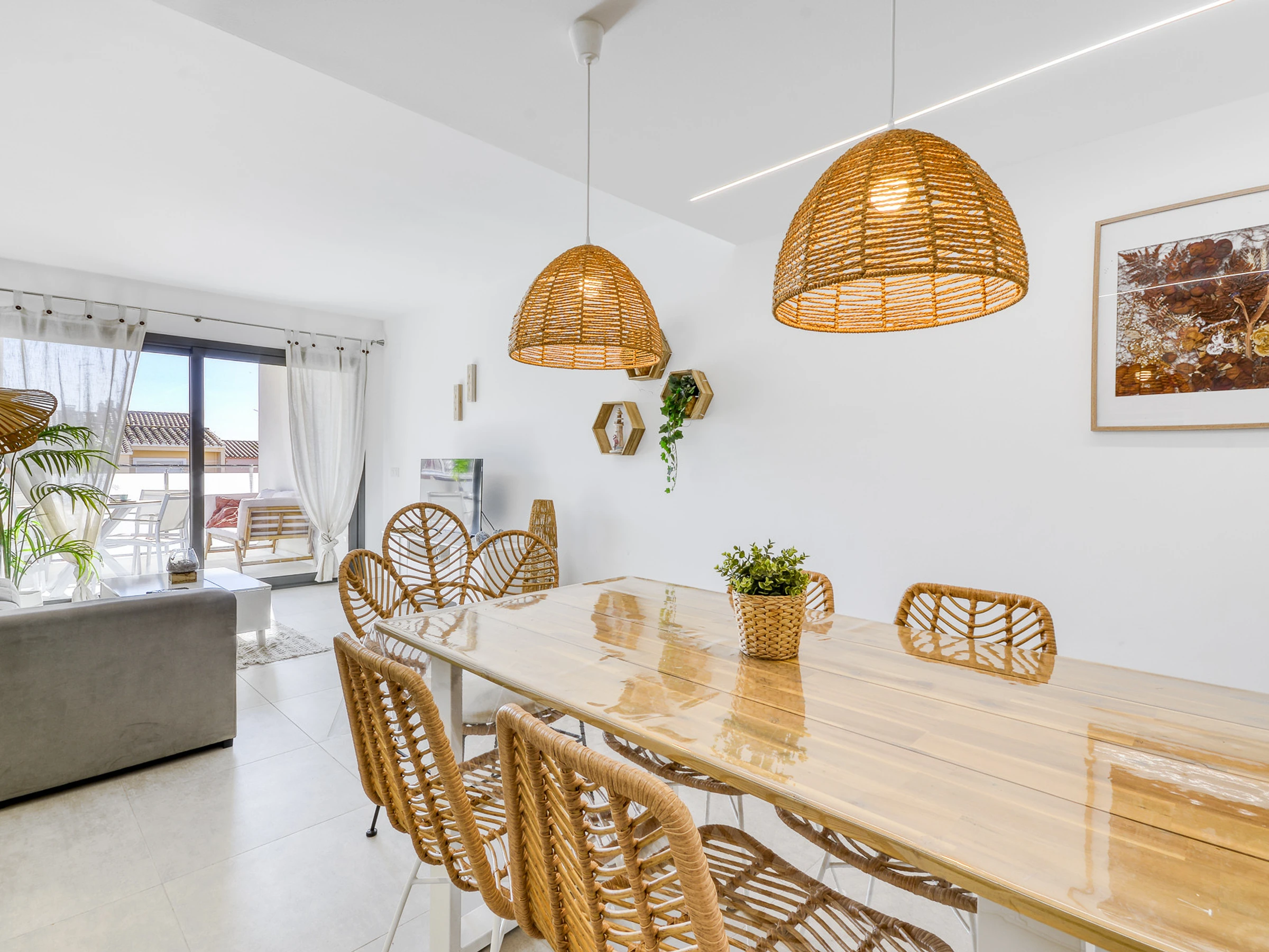 Der Wohn- und Essbereich ist hell und geräumig – ideal zum Entspannen. Die private Terrasse (9 m²) ist mit Tisch und Stühlen ausgestattet und lädt zum Essen im Freien ein.