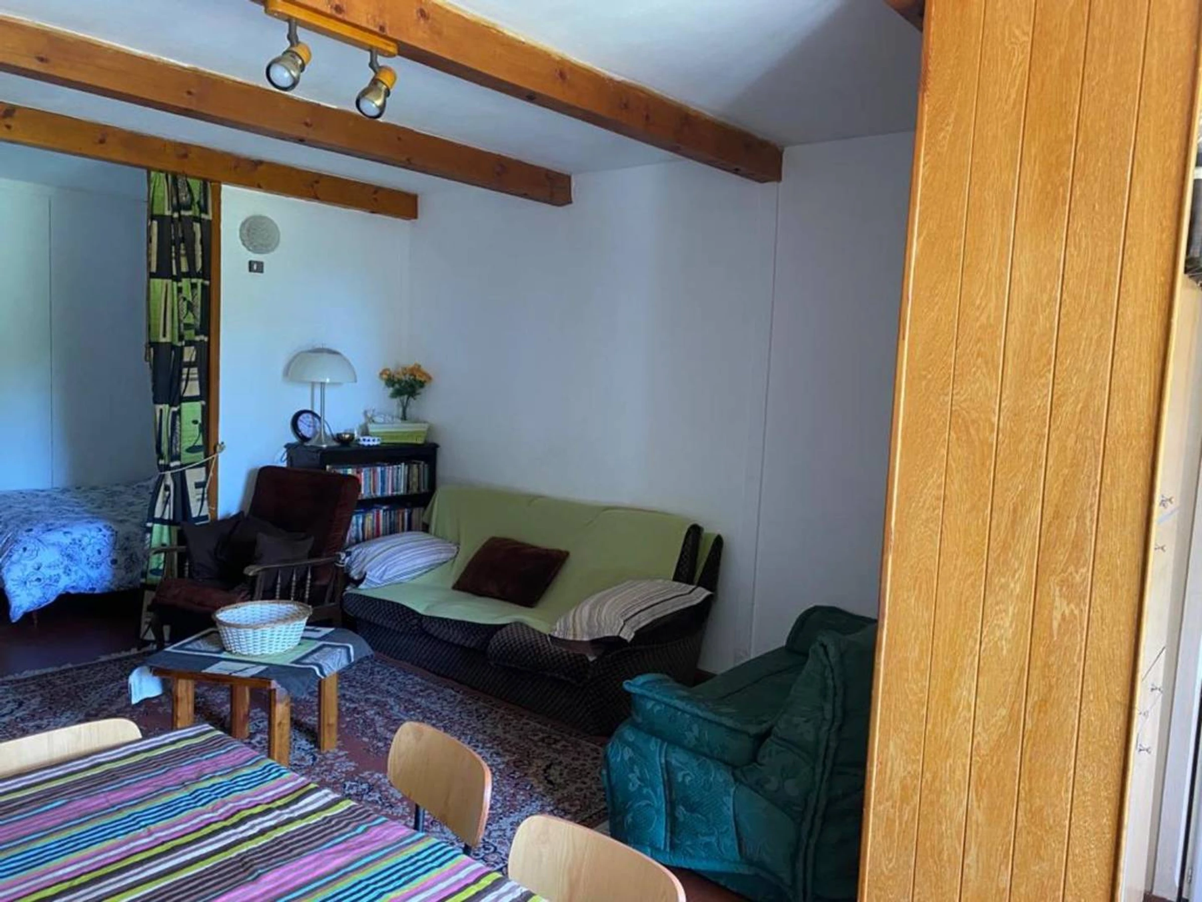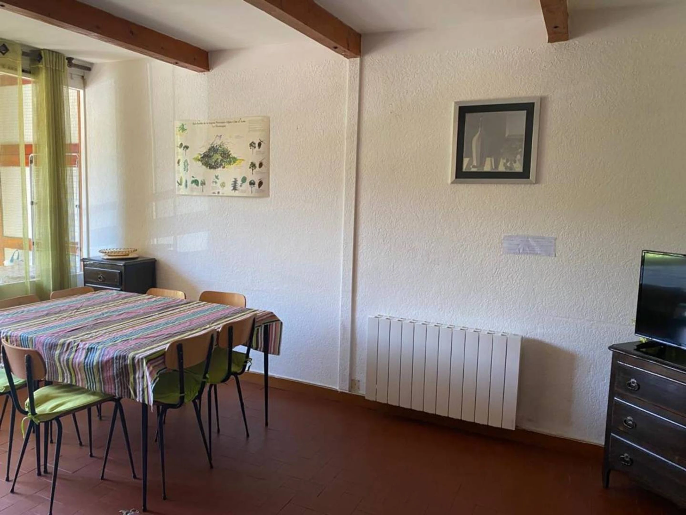 ein Schlafzimmer mit 1 Doppelbett (Bett 140 x 140 cm), eine Bergecke mit 3 Einzelbetten (90 x 190 cm), eine Duschkabine und eine Toilette, Küche, Esszimmer und Südterrasse.