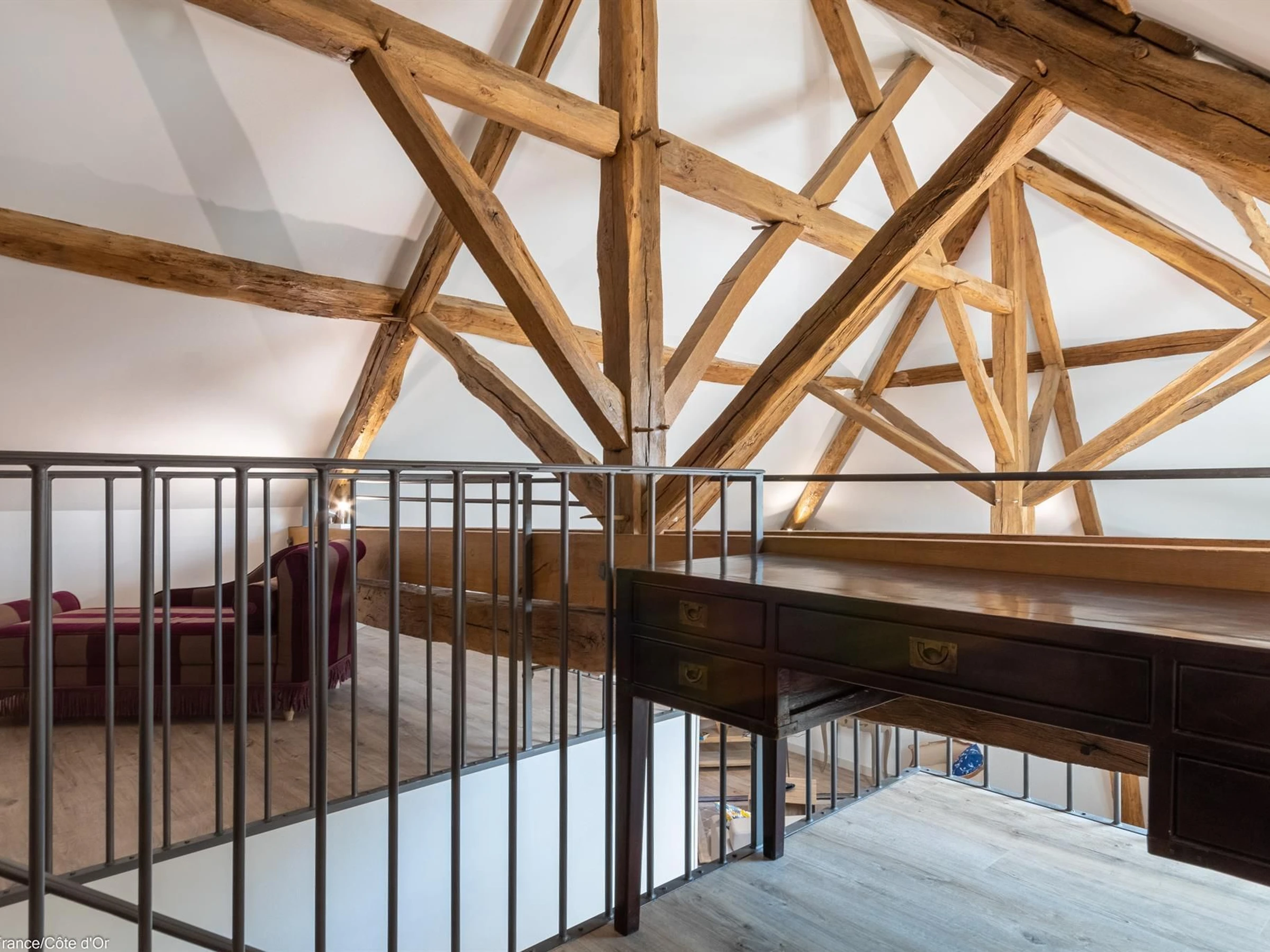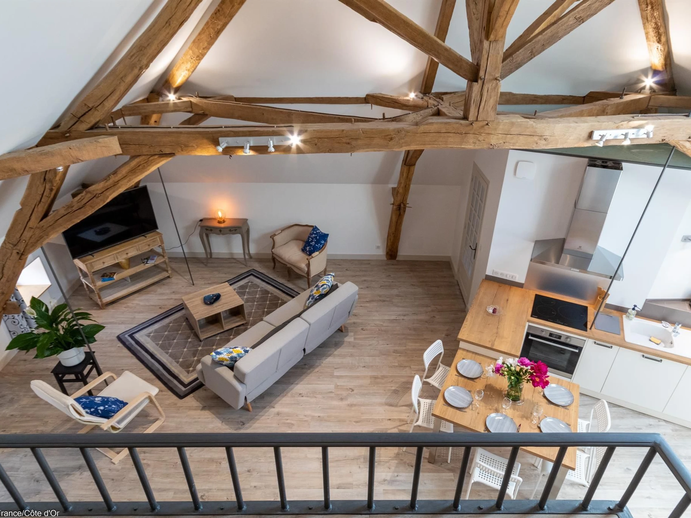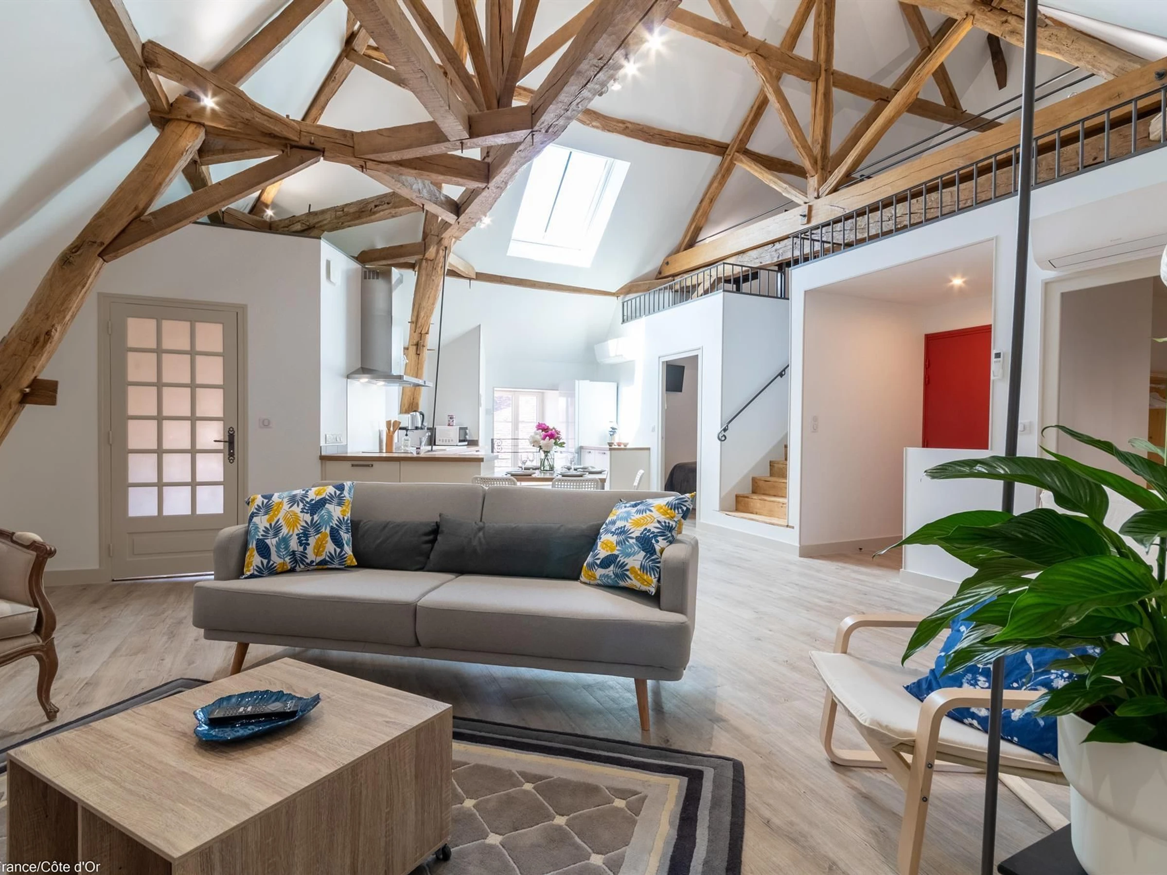 Das Apartment Caractère 202 besteht aus einem großen, offenen Wohnzimmer unter schönen Dachbalken mit Sitzecke und ausgestatteter Küche. Ein Schlafzimmer mit Doppelbett, ein weiteres Schlafzimmer mit Doppelbett, ein Duschbad mit WC und ein Zwischengeschoss mit Büro und Leseecke. Integrierte Bluetooth-Lautsprecher sind vorhanden.