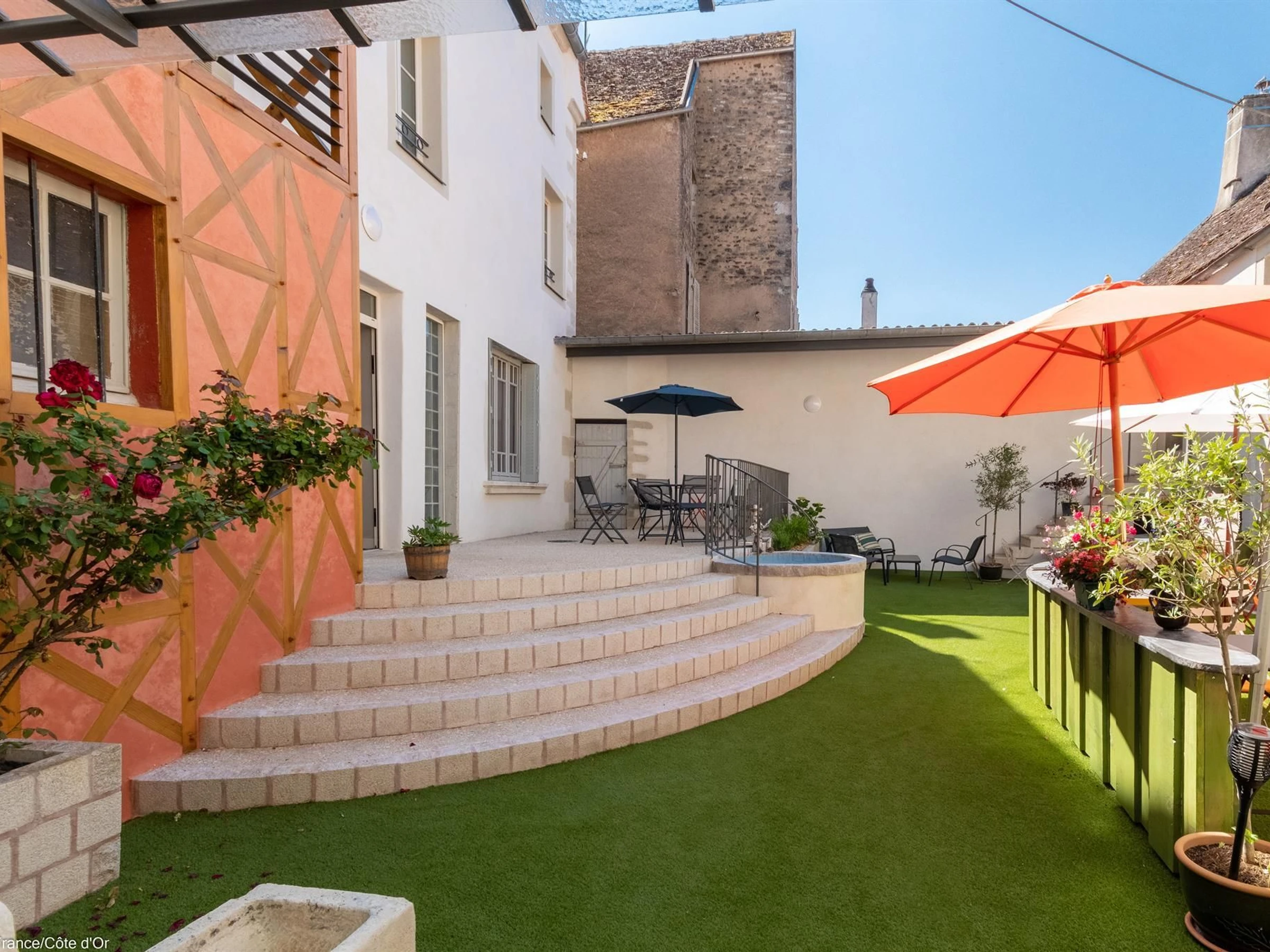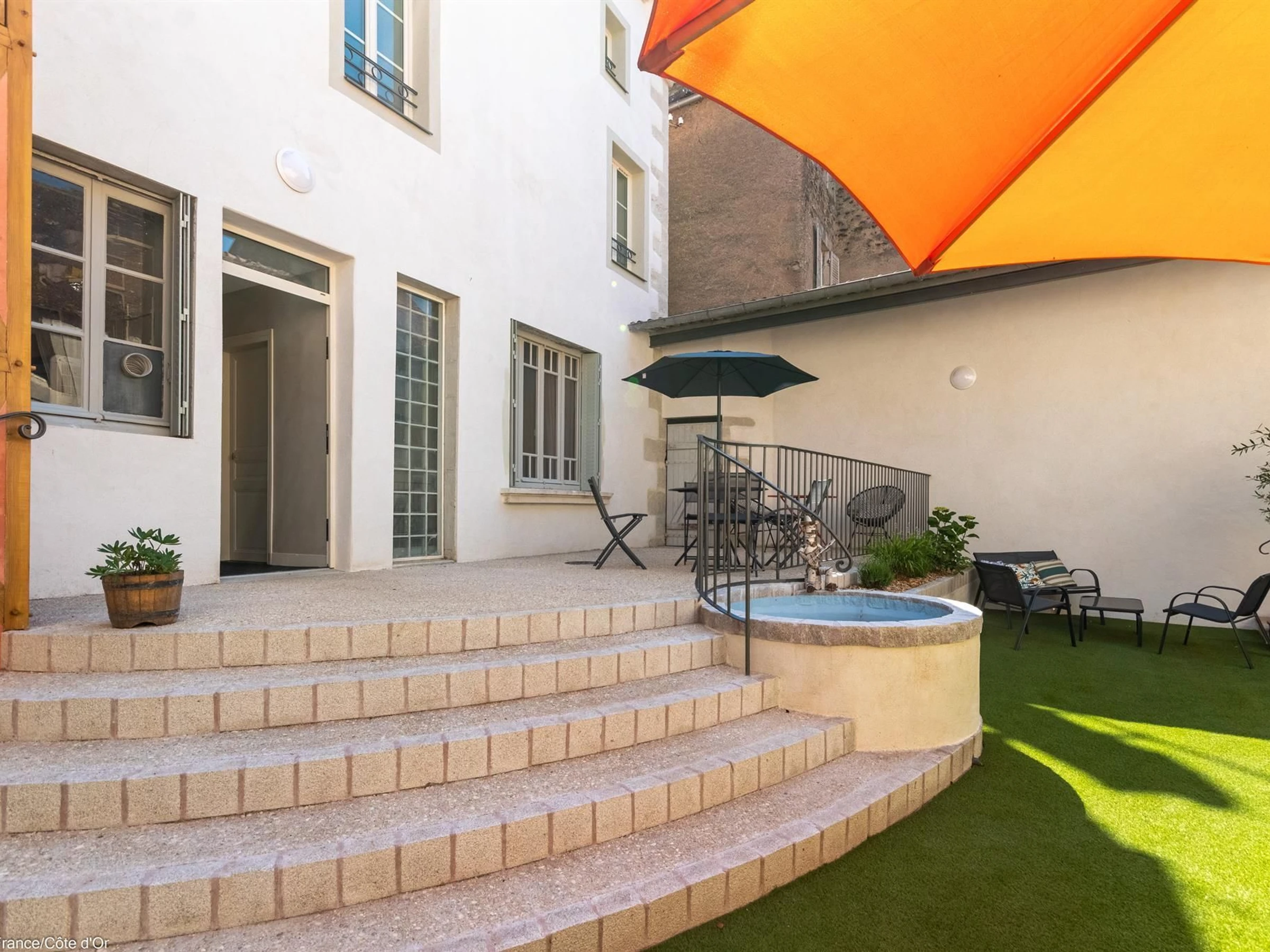 Gîte-Mieter können im Innenhof eine Terrasse mit Gartenmöbeln nutzen. Öffentliche Parkplätze stehen an der Straße zur Verfügung. Ein gemeinsamer Fahrradabstellplatz befindet sich im Gebäude. In Époisses: ein Schloss aus dem 6. Jahrhundert, eine Käserei, ein im Sommer geöffnetes Schwimmbad, Restaurants, Geschäfte und ein Supermarkt. In der Nähe der Sehenswürdigkeiten des Auxois: die mittelalterlichen Dörfer Semur-en-Auxois und Flavigny-sur-Ozerain, das Schloss Bussy-Rabutin, die Abtei von Fontenay (Weltkulturerbe) und der Alésia-Museumspark. Zahlreiche Wanderwege befinden sich in der Nähe. Der Pont-See.
