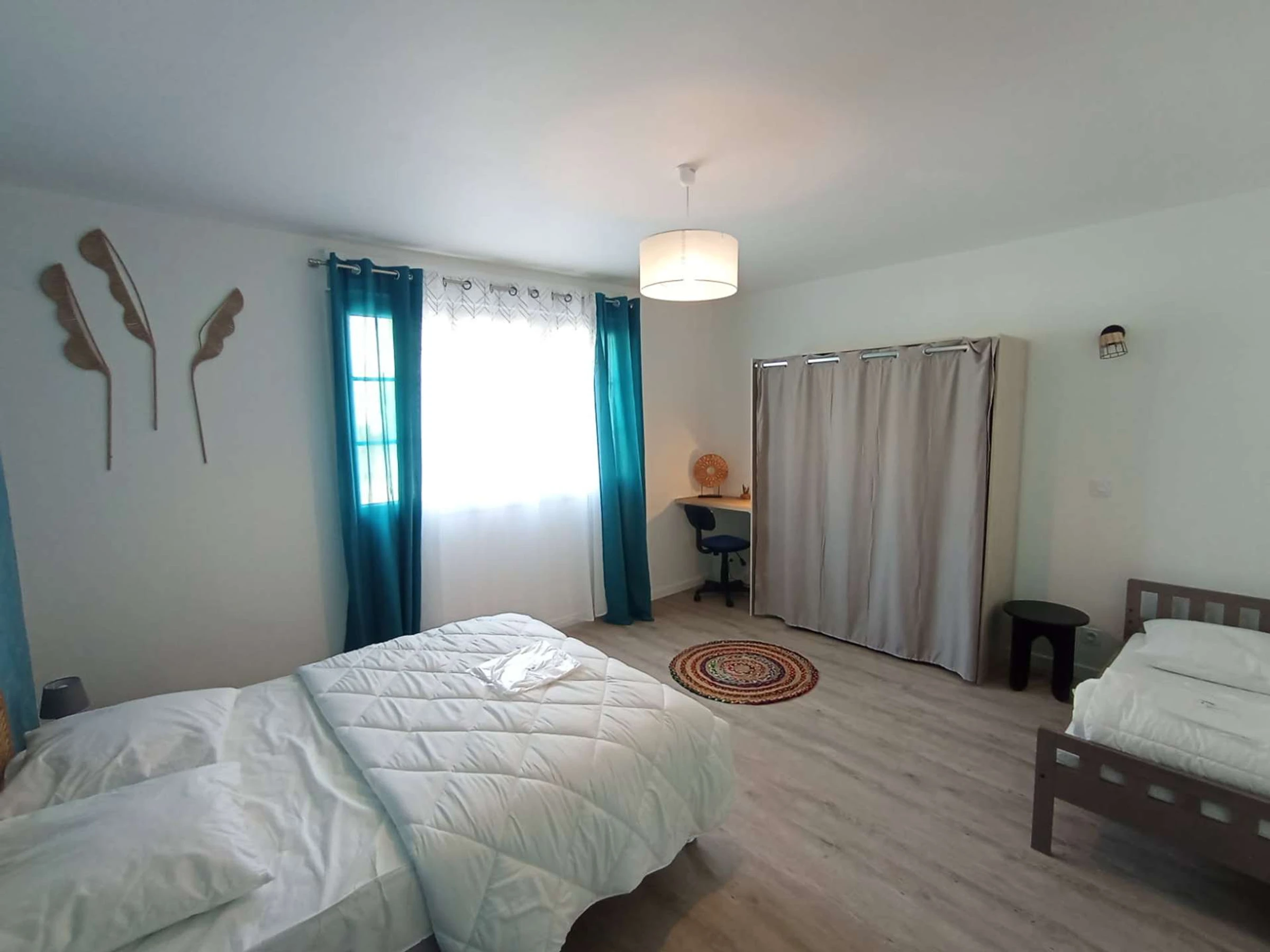 Schlafzimmer 1: ein Bett (140 x 190 cm, inklusive Bettdecke), Kleiderschrank, ein Bett (160 x 70 cm).