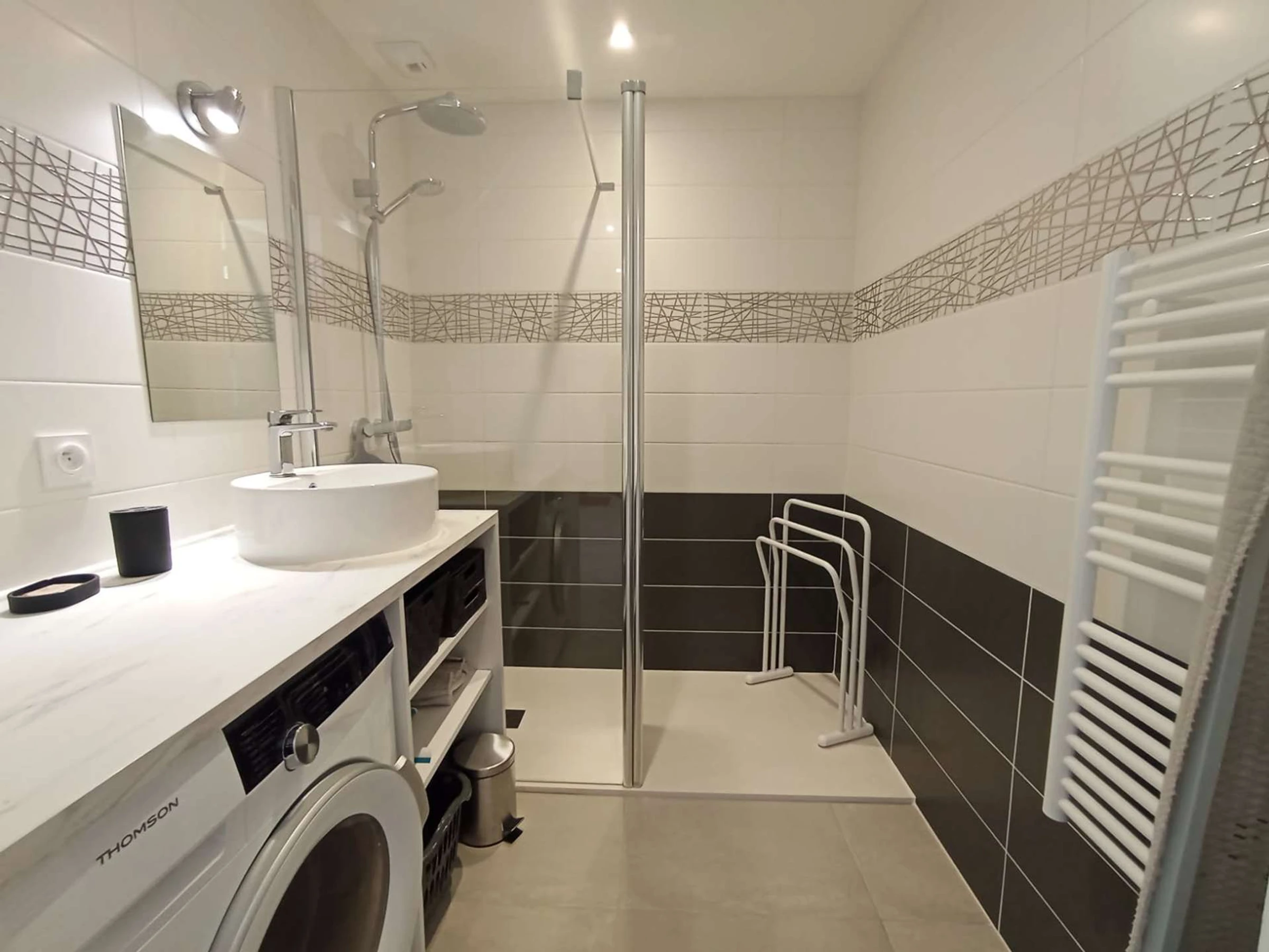 Badezimmer: ebenerdige Dusche, Waschbecken, beheizter Handtuchhalter. Separates WC.