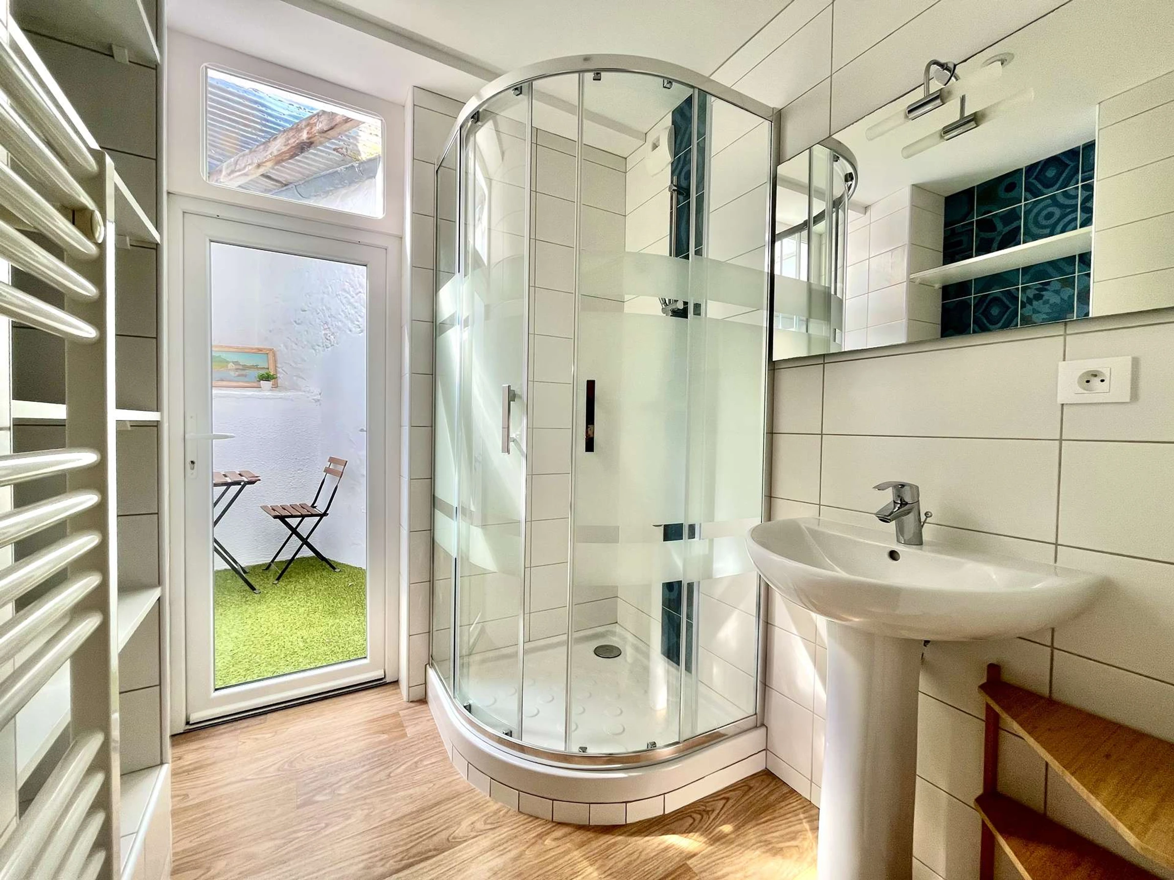 Badezimmer mit Dusche, Waschbecken, Handtuchwärmer und WC