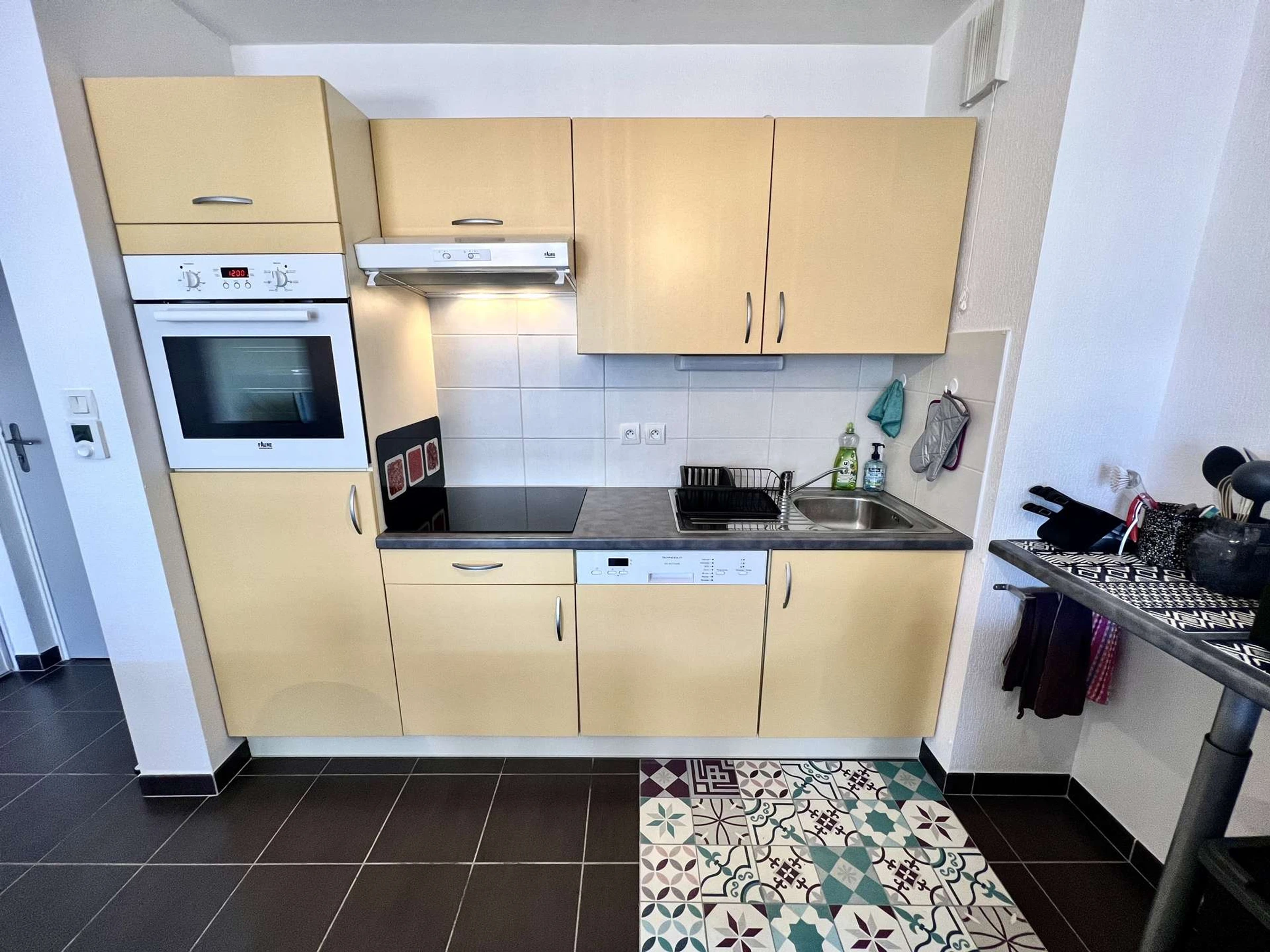 Eingebaute und ausgestattete Küche (Geschirrspüler, Backofen, Induktionskochfeld, Mikrowelle, Dunstabzugshaube, Kaffeemaschine, Toaster) mit Zugang zum