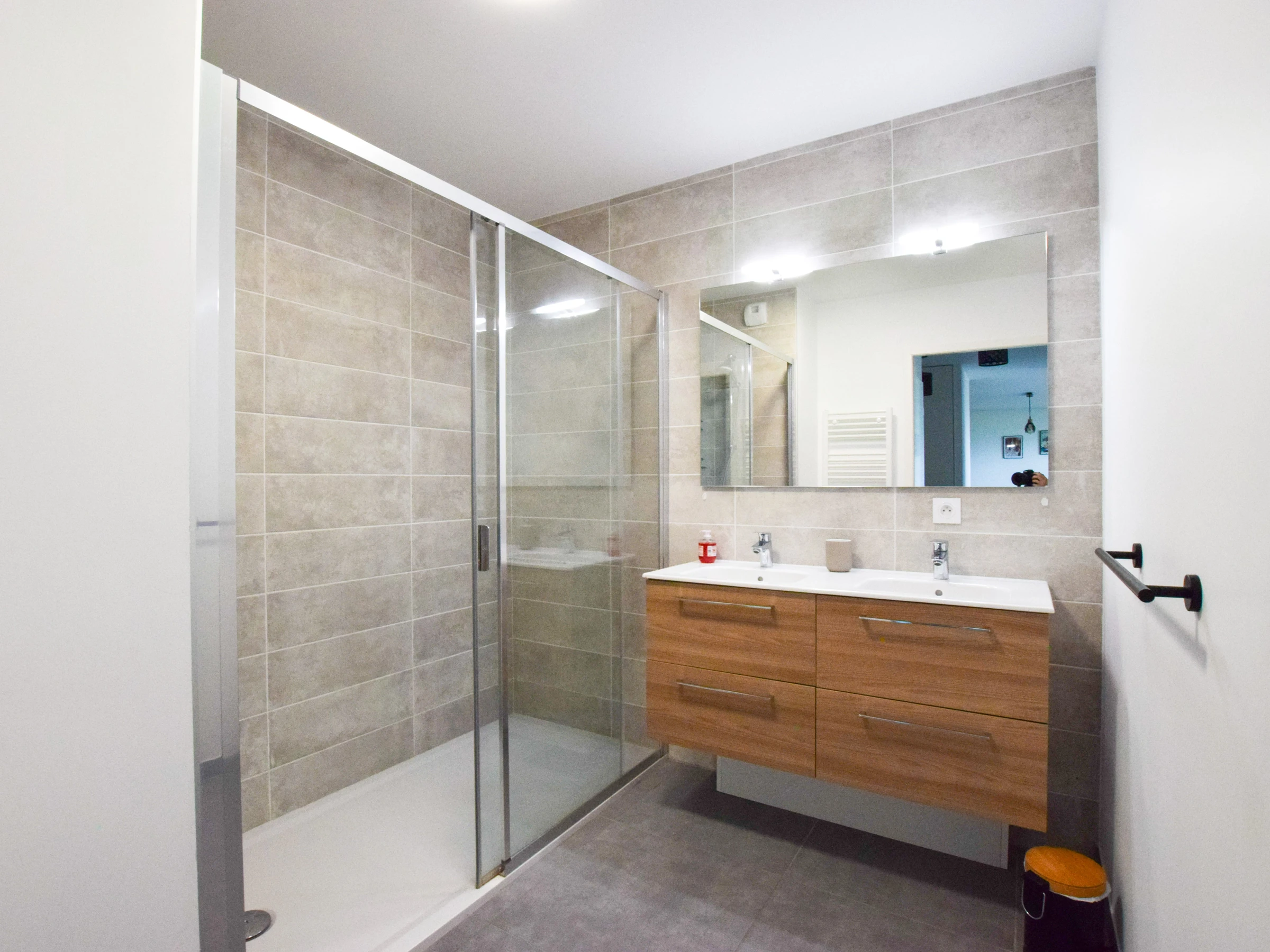 Eine Dusche und eine Waschmaschine sind vorhanden, separates WC