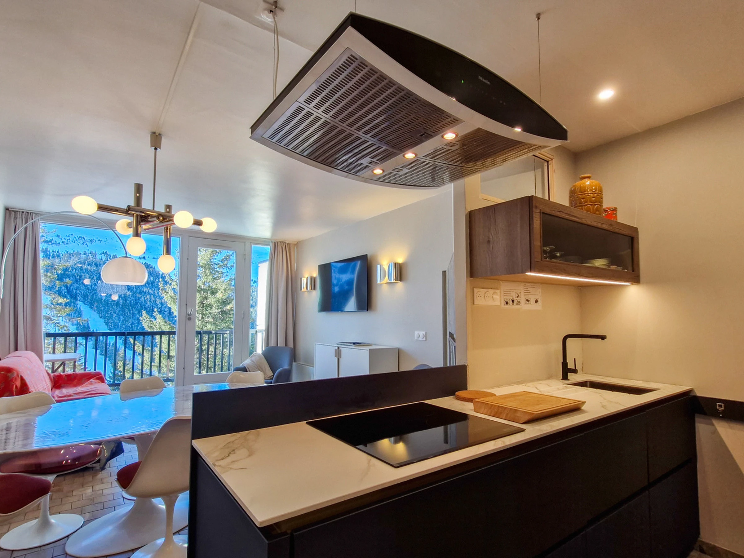 Großes, 48 m² großes Komfort-Apartment mit einem Schlafzimmer im 2. Stock, komplett renoviert. Großer Südbalkon. Sehr ruhig gelegen. Direkt an der Piste und dem Skischulzentrum.