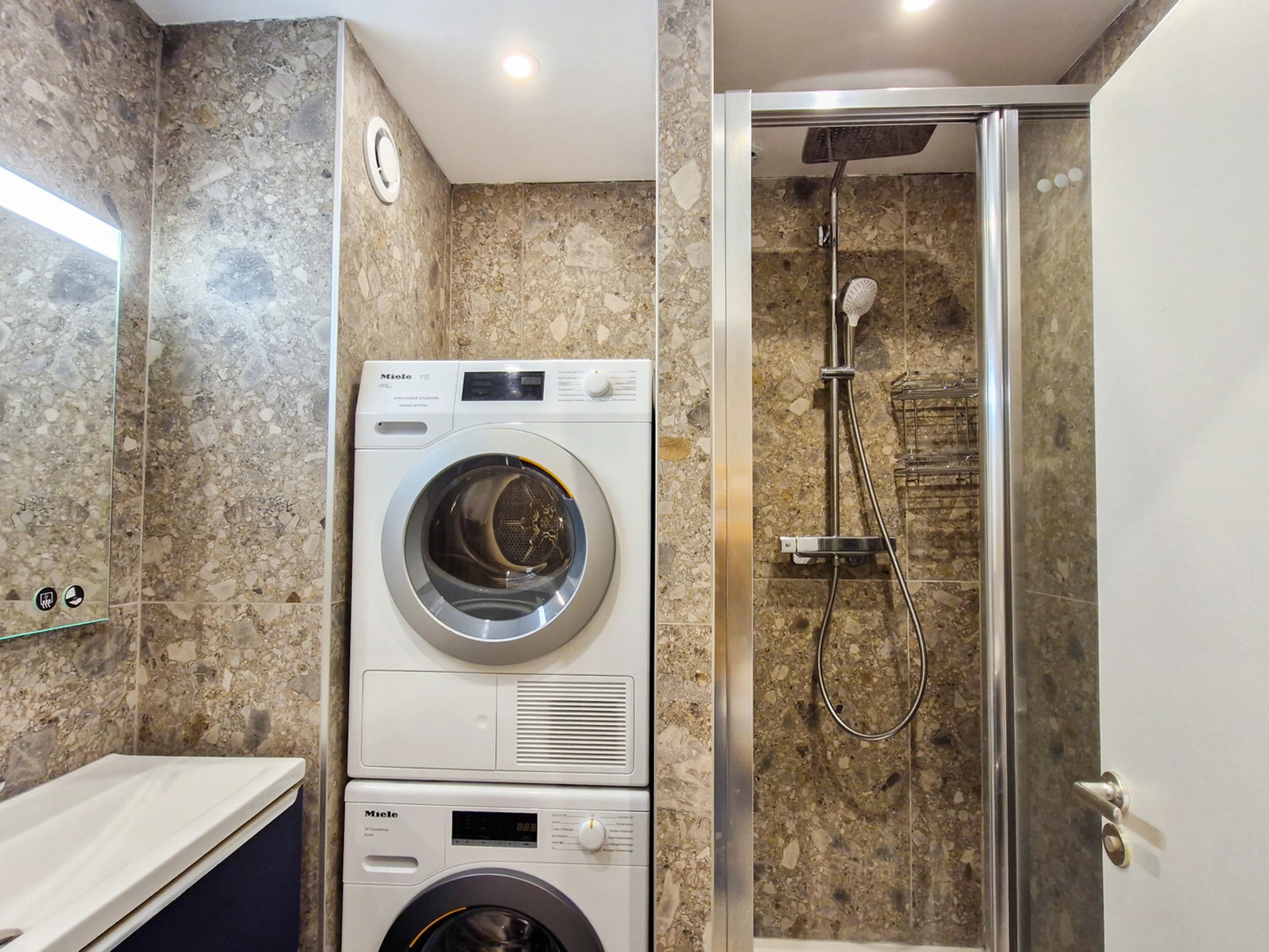 - Duschraum mit Dusche, Waschmaschine, Trockner und Handtuchwärmer