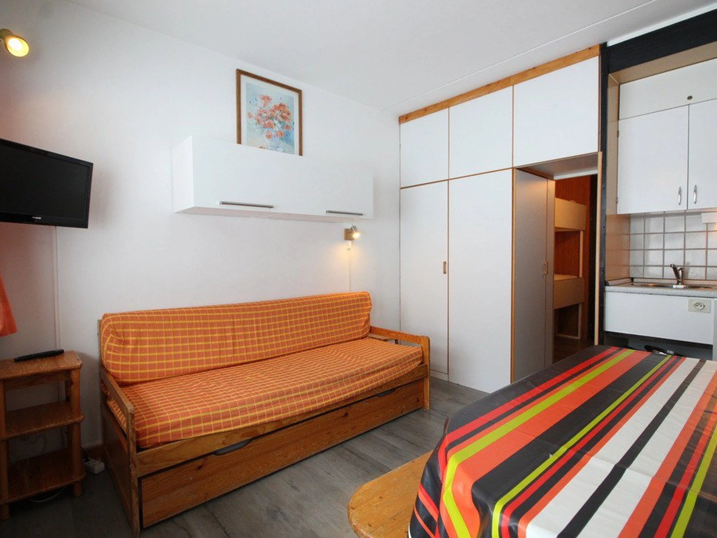 Das Studio ist für bis zu 4 Personen (ideal für 3 Personen) ausgelegt und besteht aus einem Wohnbereich mit einem Doppelschlafsofa und einer Schlafnische im Eingangsbereich mit zwei Etagenbetten (das obere Bett ist nicht für Kinder unter sechs Jahren geeignet). Die Küchenzeile ist mit Backofen, Mikrowelle, zwei Kochfeldern, Kühlschrank und Filterkaffeemaschine ausgestattet.