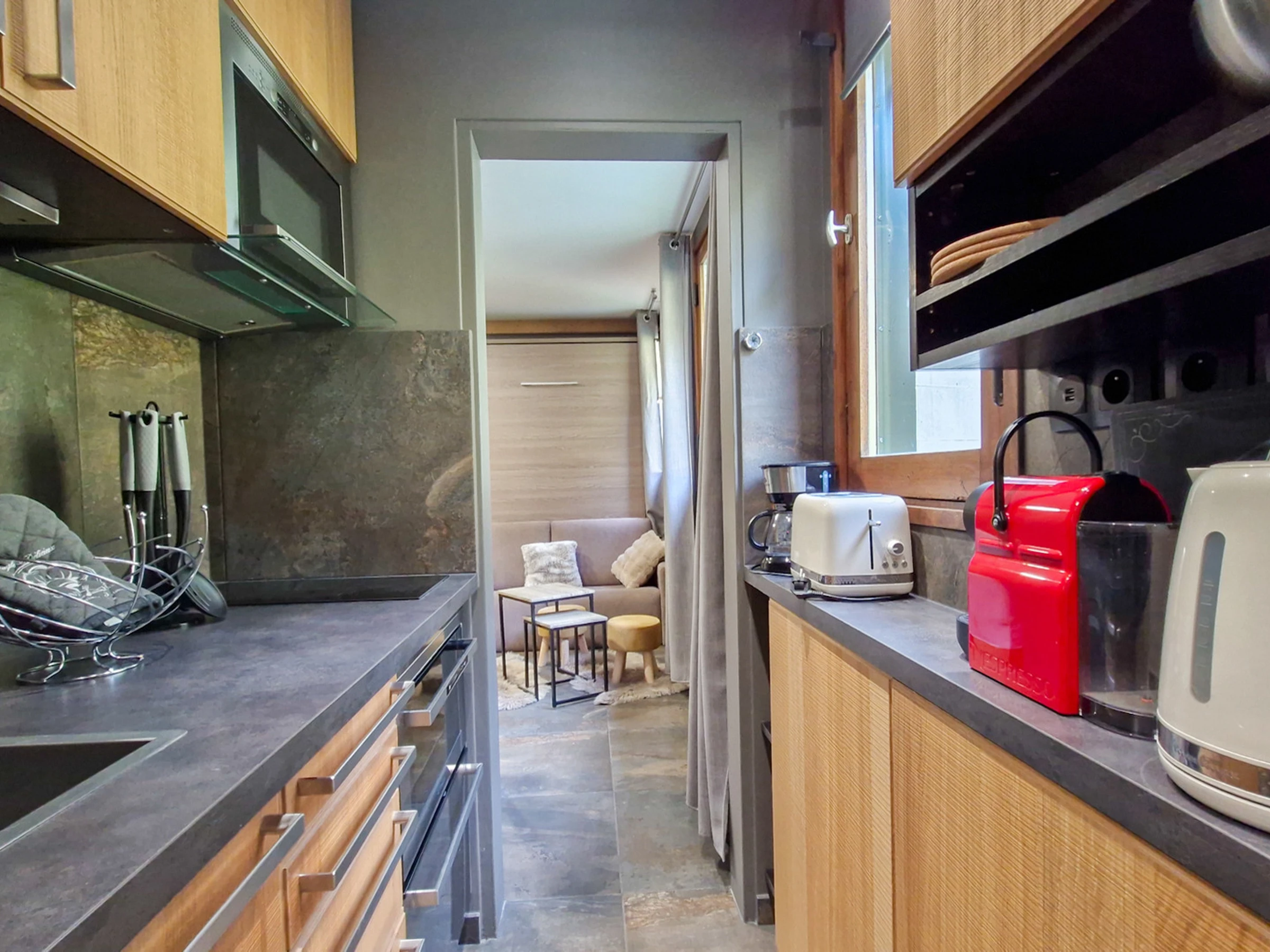- Kochnische mit 2 Induktionskochfeldern, Backofen, kleinem Geschirrspüler, Mikrowelle, Dunstabzugshaube und Nespresso-Kaffeemaschine