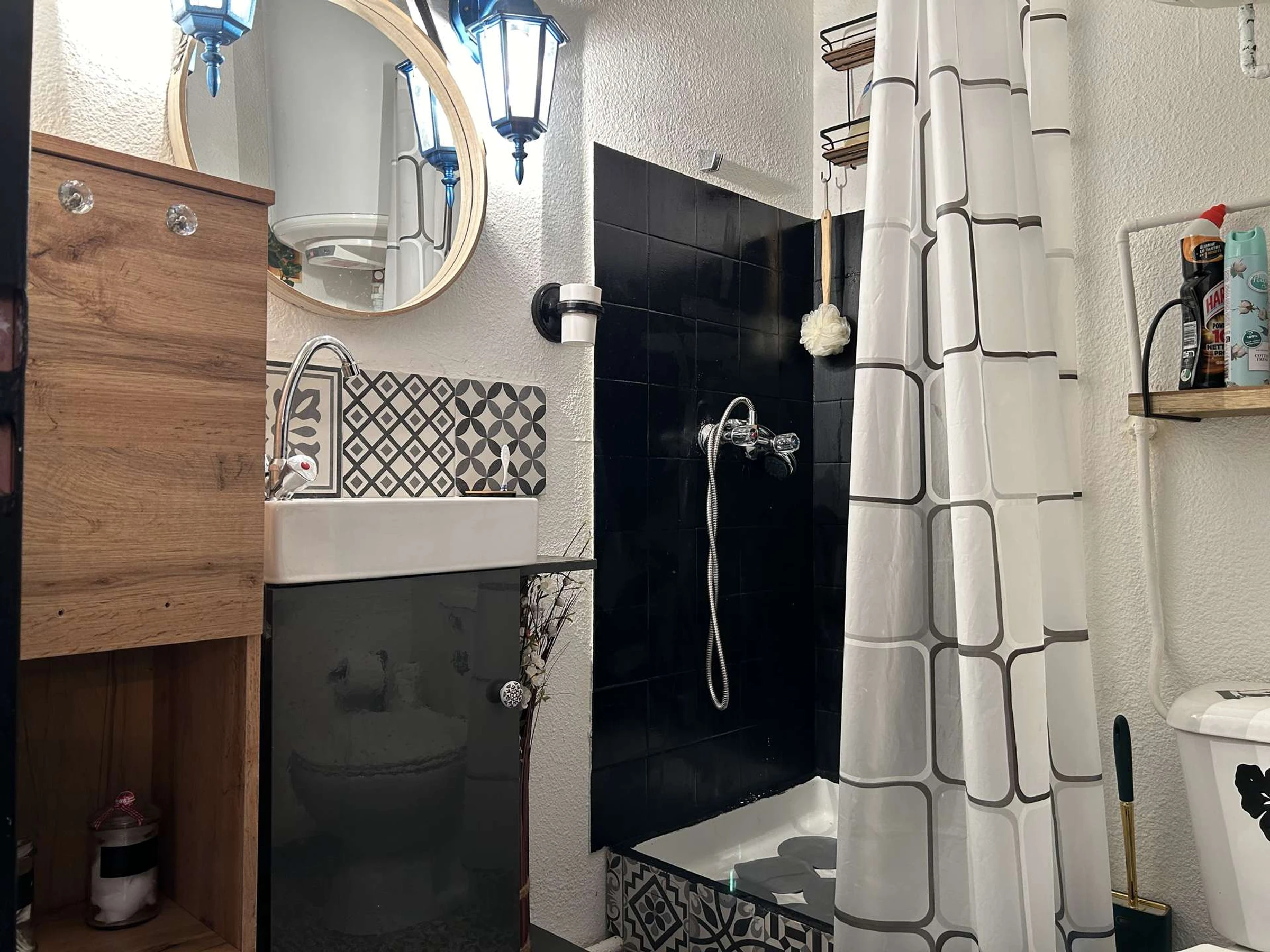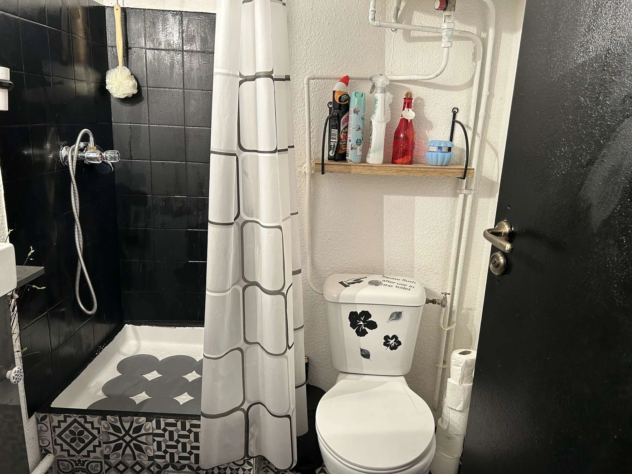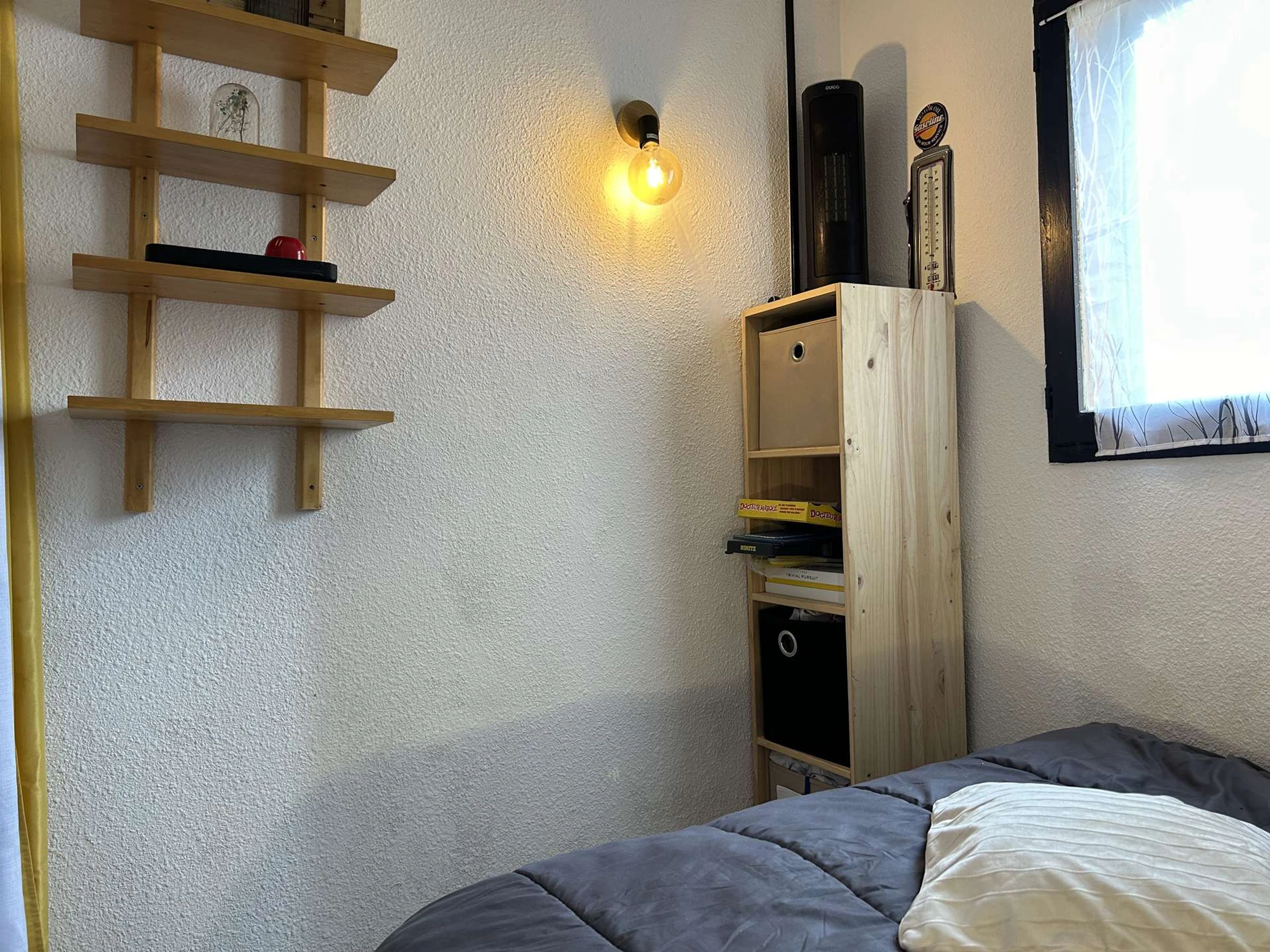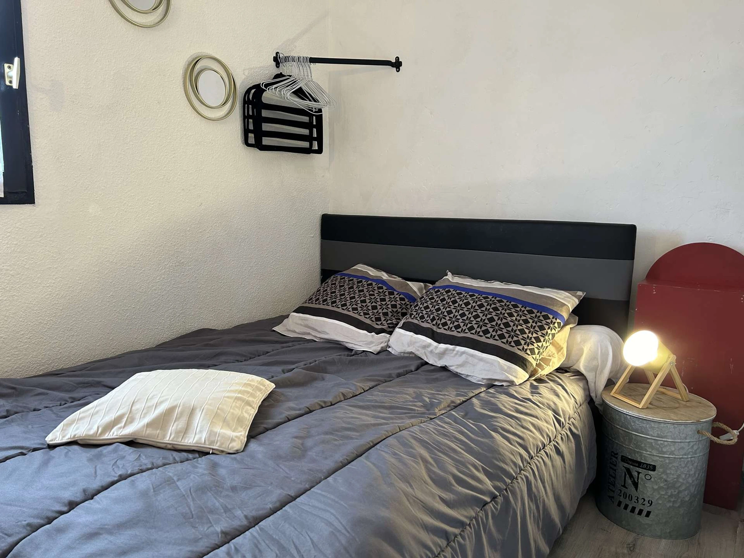 Es gibt ein Schlafzimmer mit Doppelbett und ein Badezimmer mit WC. Ein Balkon gehört ebenfalls dazu.
