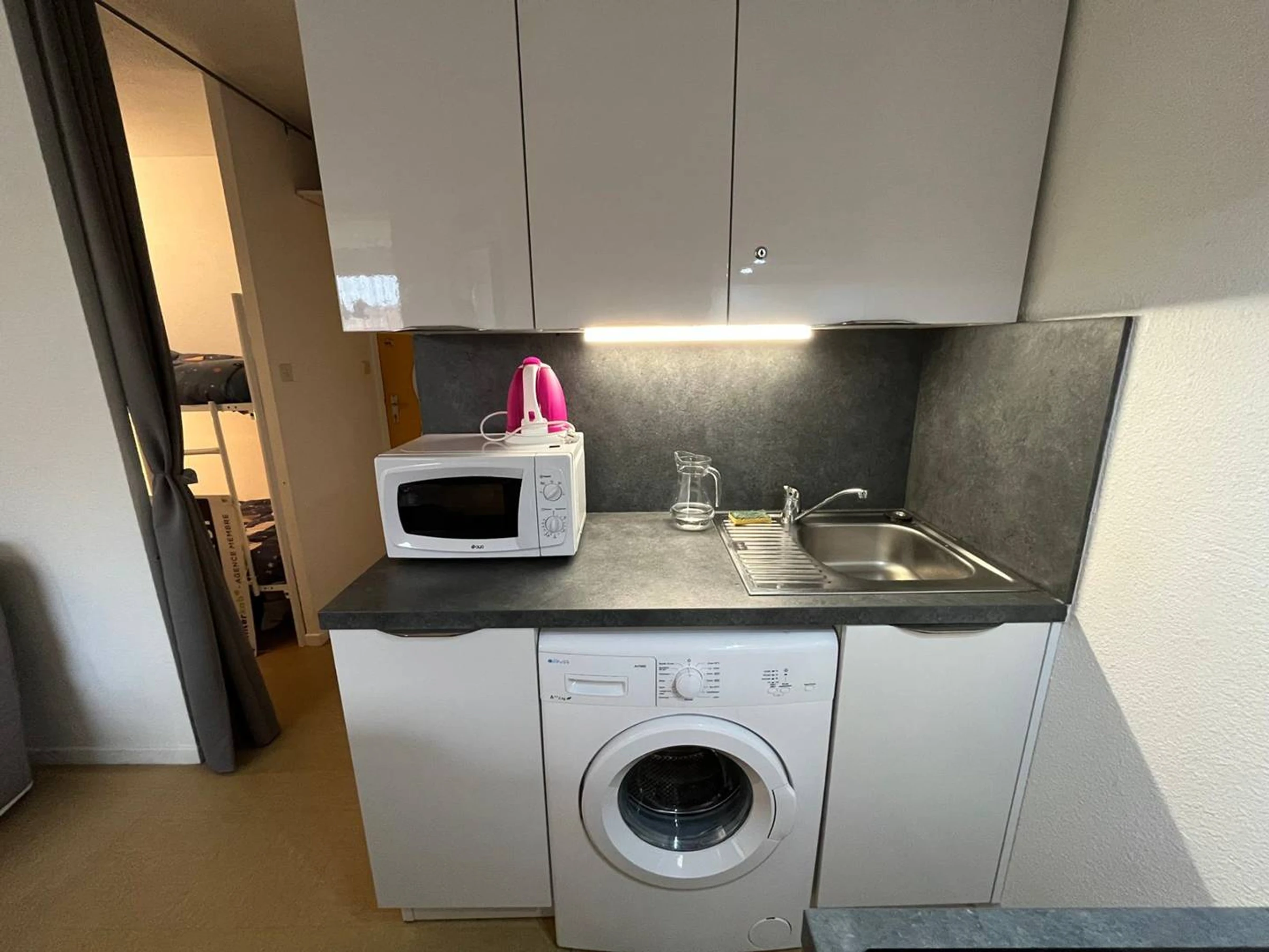 Bestehend aus einem Wohn-/Essbereich mit Küche und Schlafsofa, Fernseher, Kühl-/Gefrierschrank, Waschmaschine, Mikrowelle, Wasserkocher, Filterkaffeemaschine, Toaster usw.
