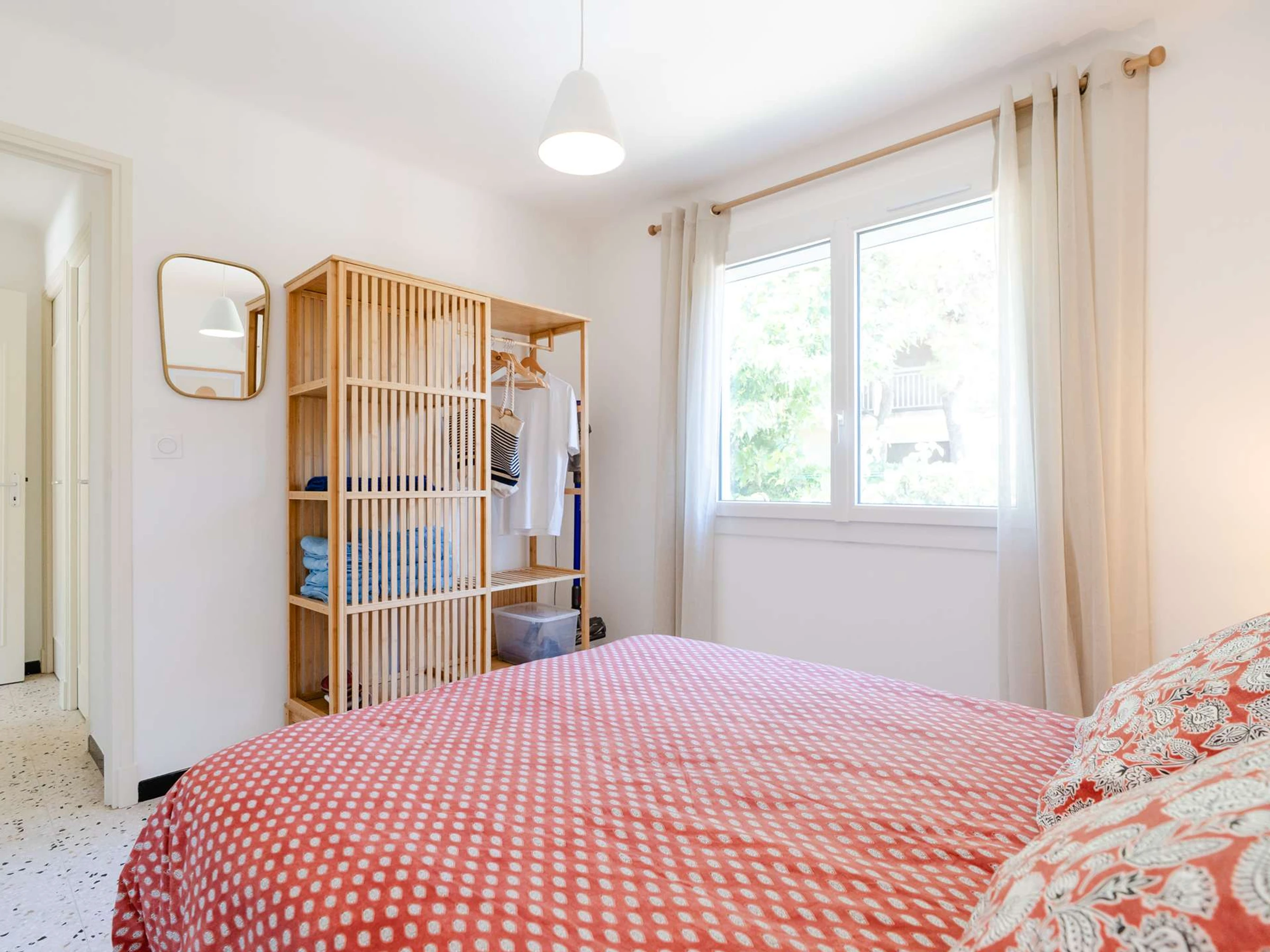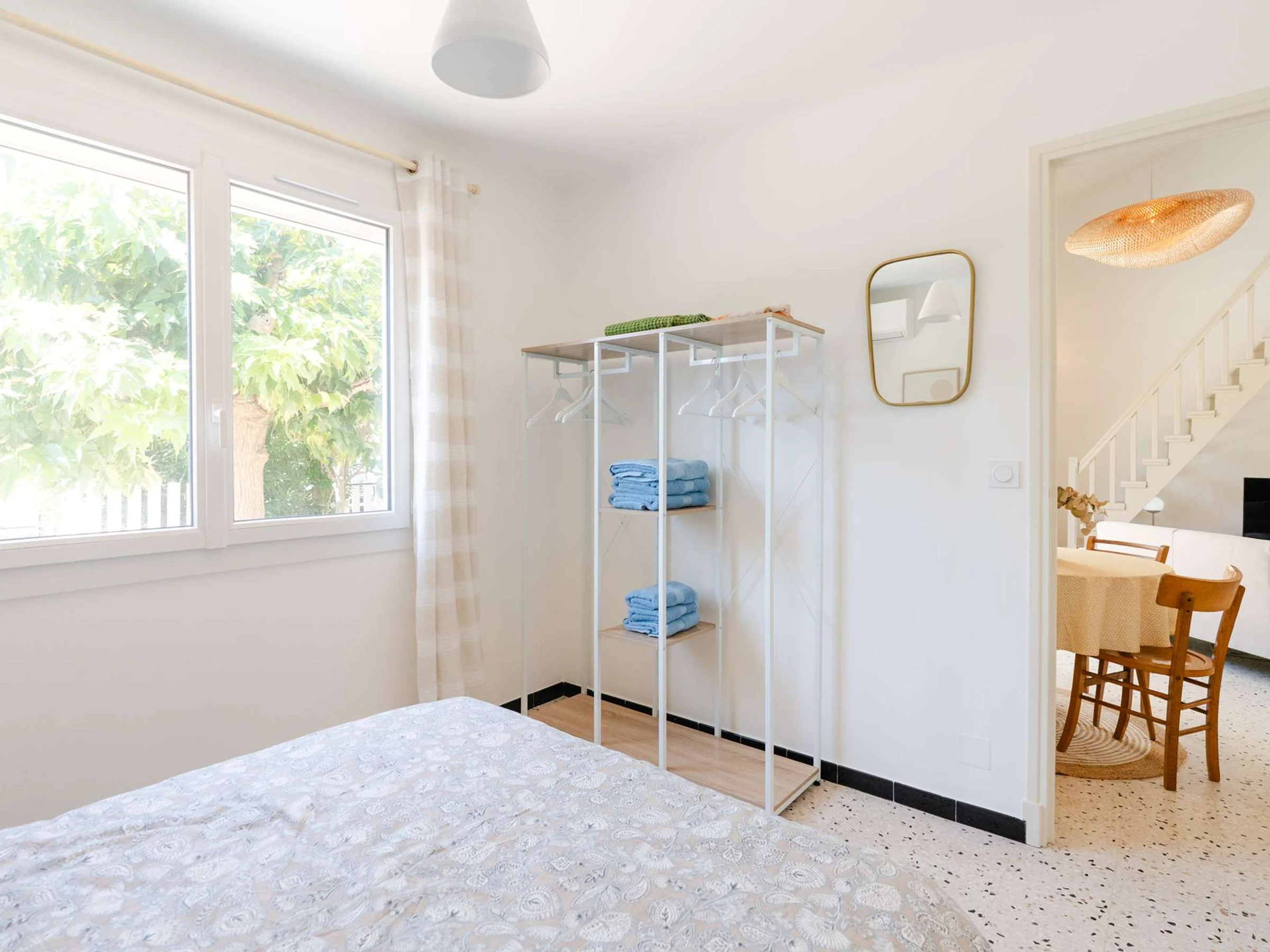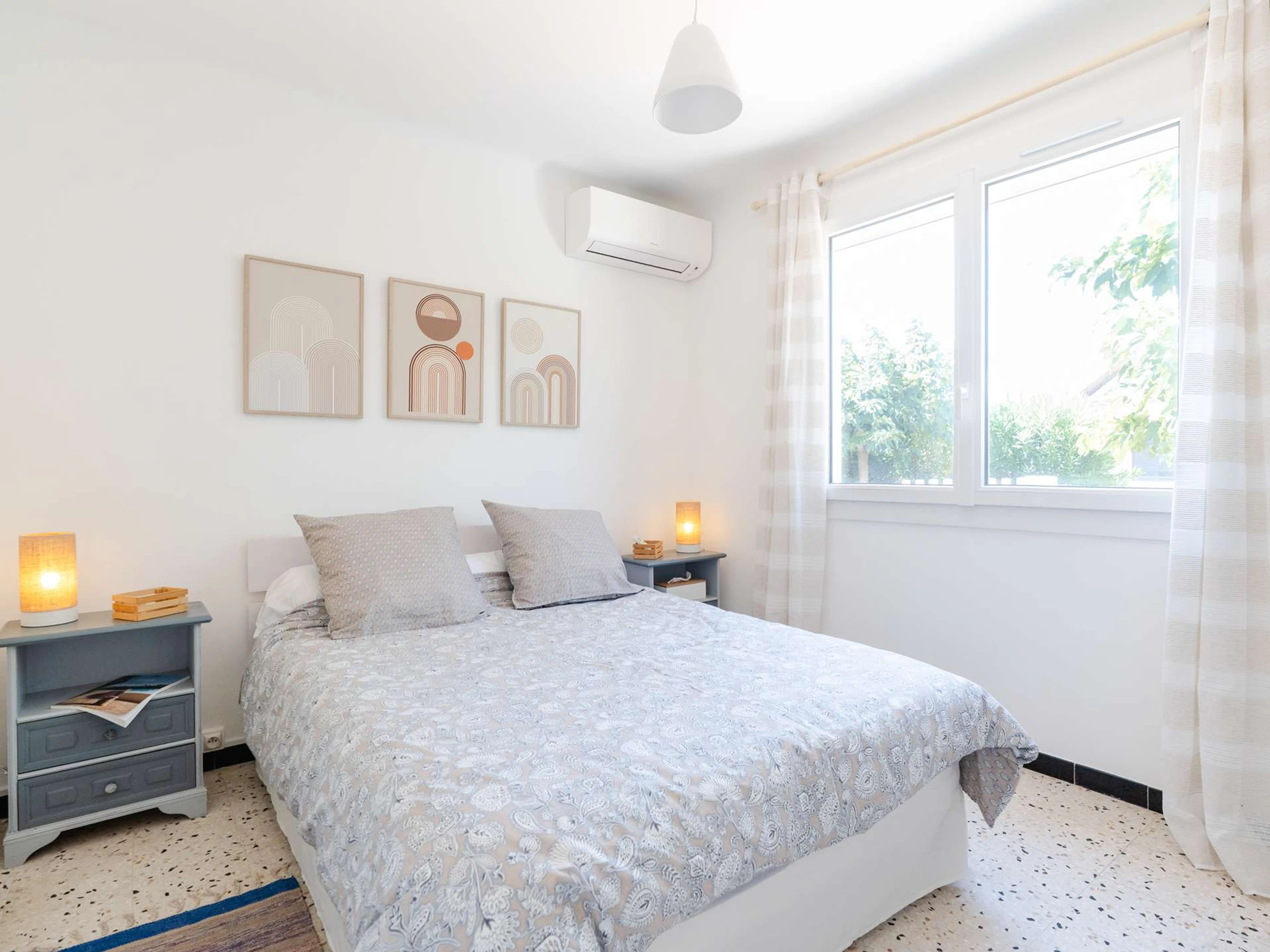 Die 3 Schlafzimmer befinden sich im Erdgeschoss. Die beiden Schlafzimmer mit Doppelbett (140x190) sind klimatisiert und verfügen über einen Kleiderschrank und Nachttische. Das Zimmer mit Einzelbett (90 x 190) ist schmaler und verfügt über einen Nachttisch und einen Kleiderschrank. Im Erdgeschoss befinden sich außerdem ein Badezimmer mit ebenerdiger Dusche, Waschbecken, Handtuchtrockner, Stauraum und ein separates WC.