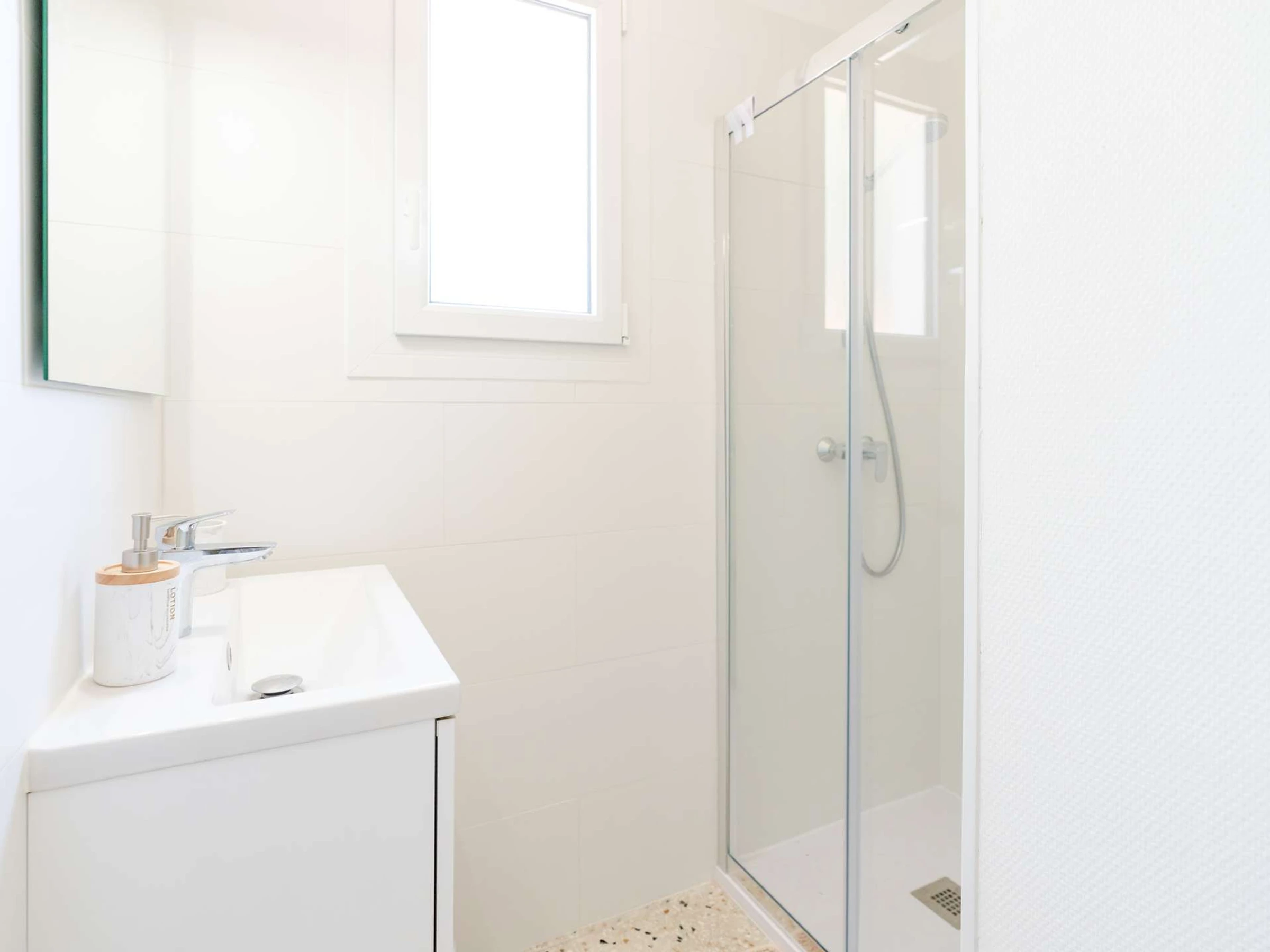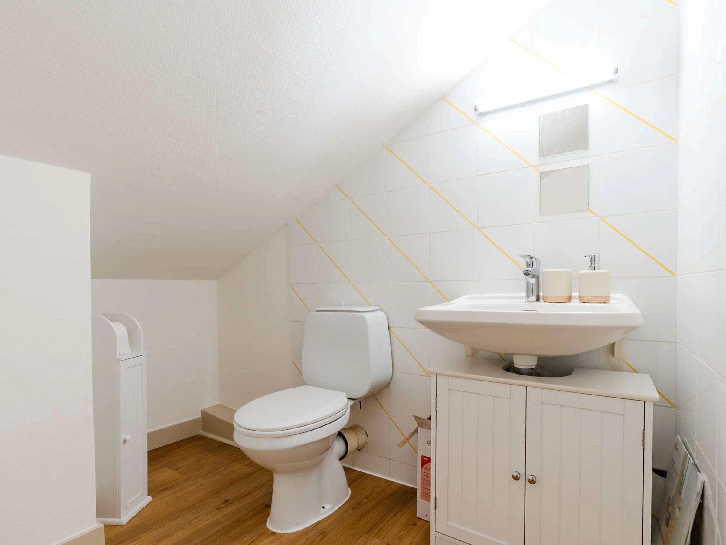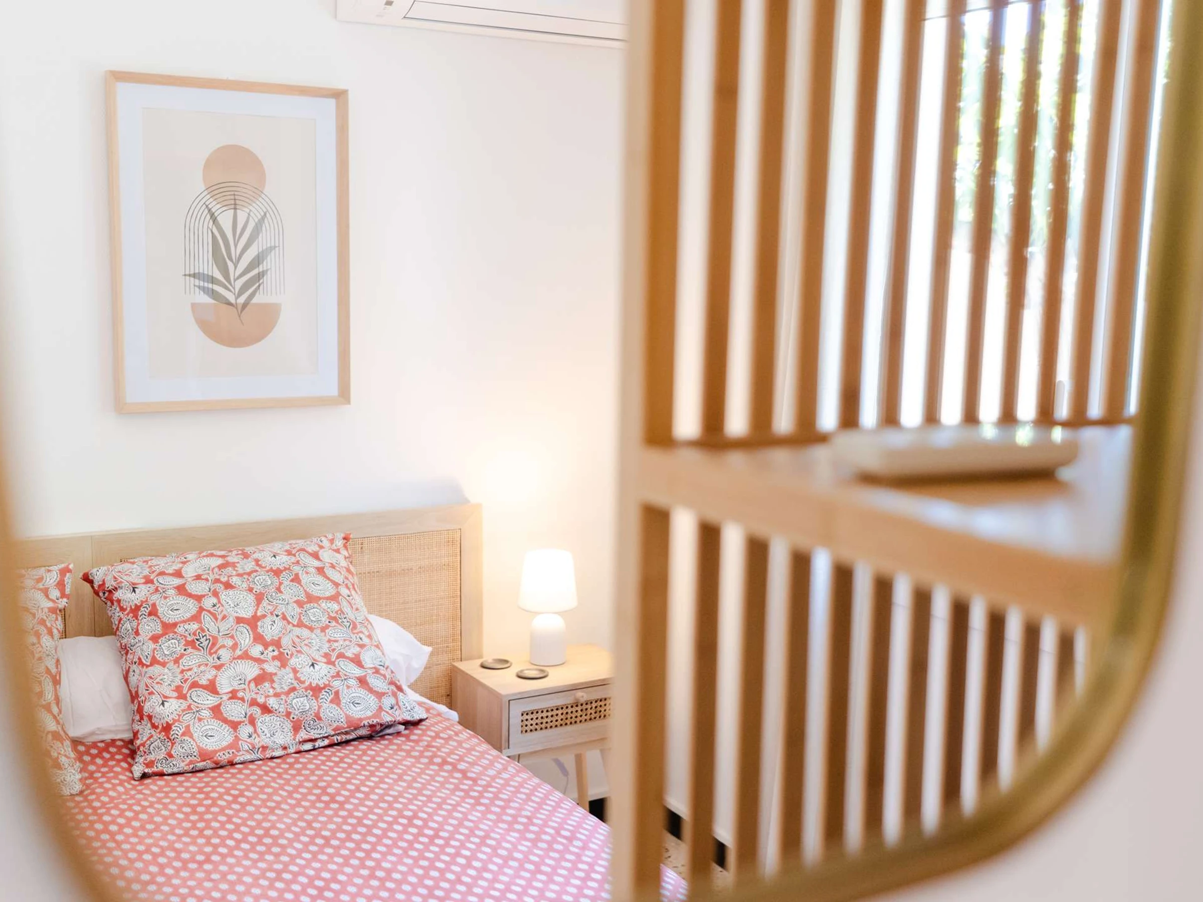 Die 3 Schlafzimmer befinden sich im Erdgeschoss. Die beiden Schlafzimmer mit Doppelbett (140x190) sind klimatisiert und verfügen über einen Kleiderschrank und Nachttische. Das Zimmer mit Einzelbett (90 x 190) ist schmaler und verfügt über einen Nachttisch und einen Kleiderschrank. Im Erdgeschoss befinden sich außerdem ein Badezimmer mit ebenerdiger Dusche, Waschbecken, Handtuchtrockner, Stauraum und ein separates WC.